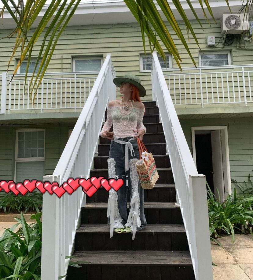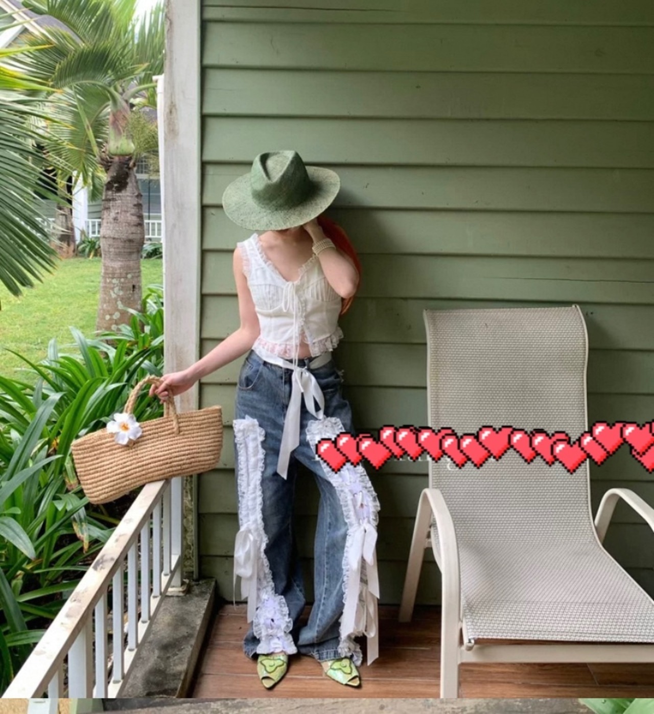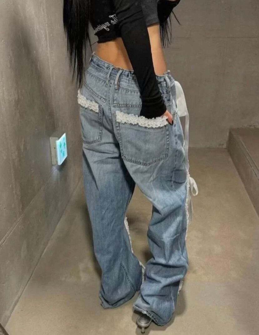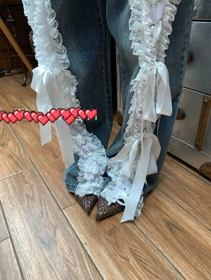 リボン デコレーション デニム パンツ、ボトムス 白