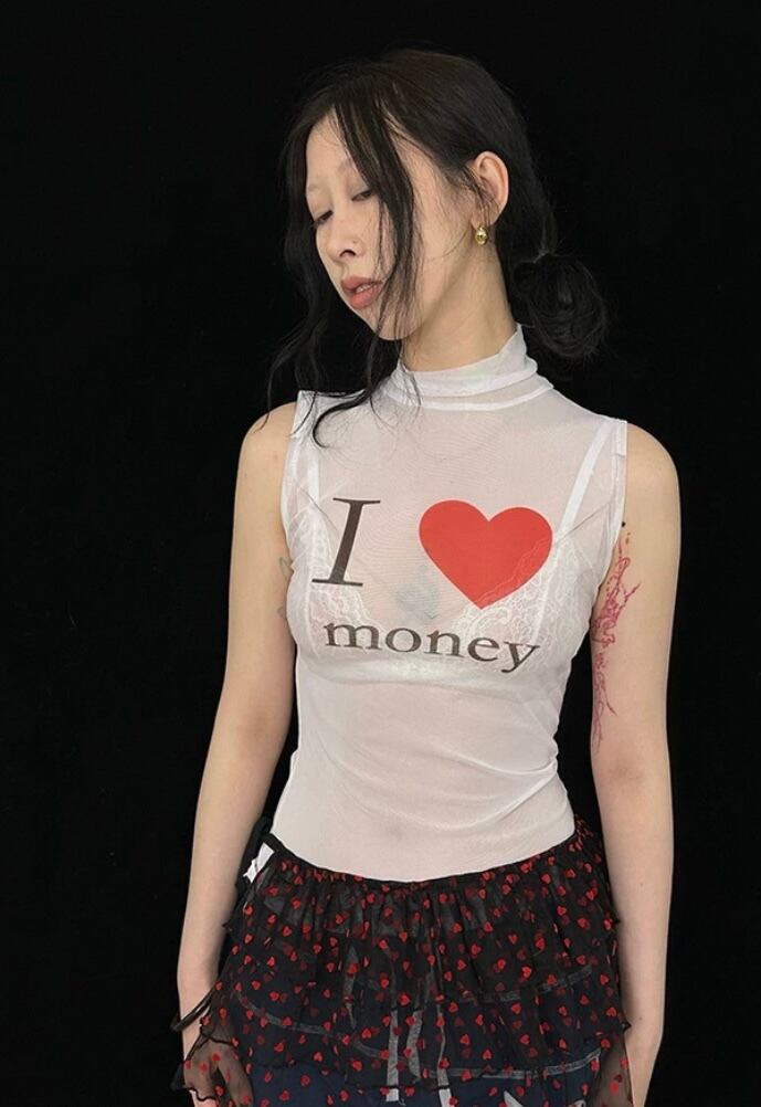 白 トップス シースルー ハート アイラブ ブラウス ノースリーブ、シースルー