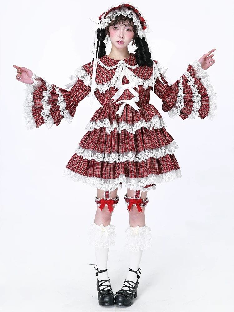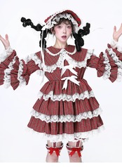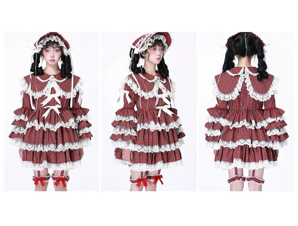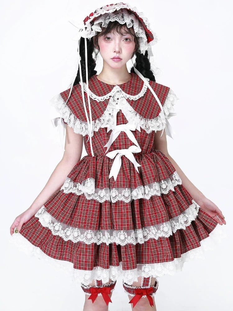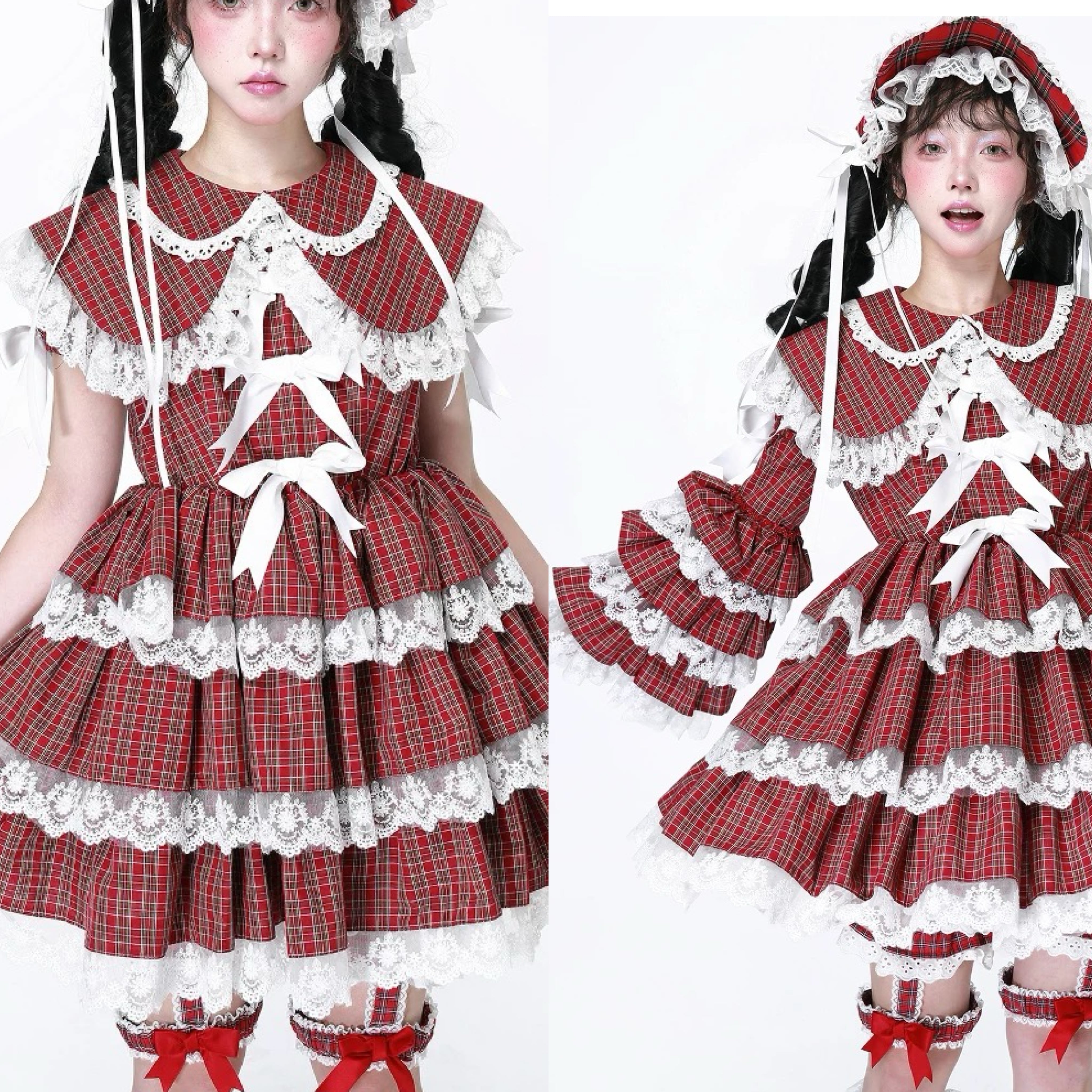 (2way【ワンピース】赤 チック リボン、かわいいフリフリ 姫 ドレス、丸襟 リボン レイ 原宿 原宿 ロリータ