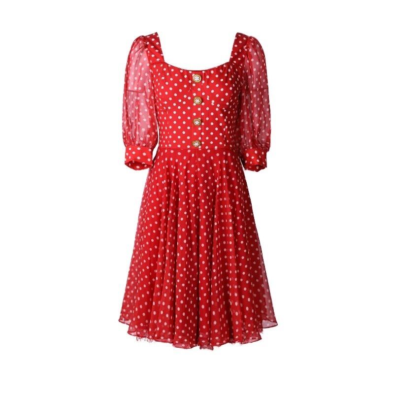 【わずか】赤 ワンピース ドット 水玉 ワンピース ブラウス マキシ フレア スカート ボタン 花柄