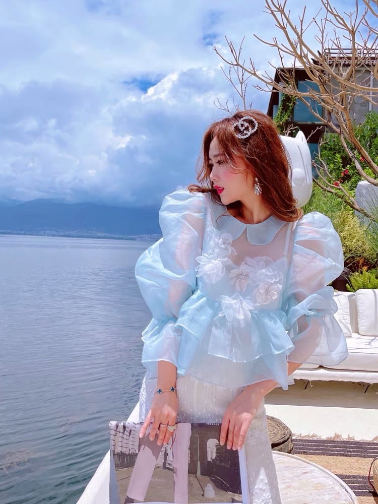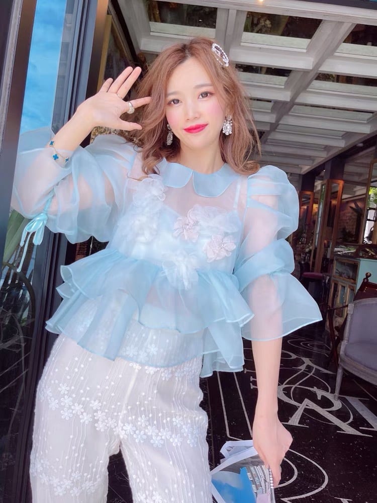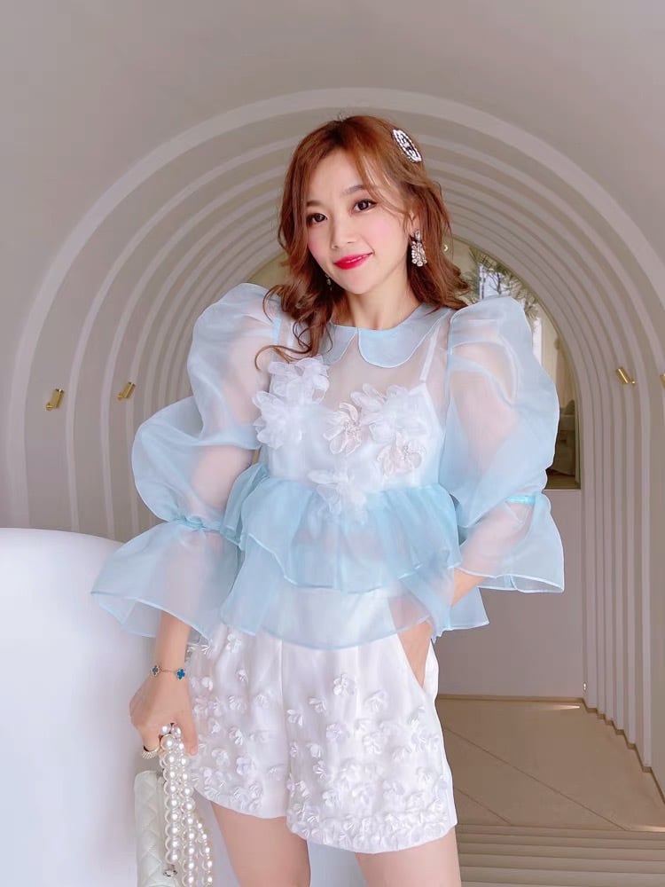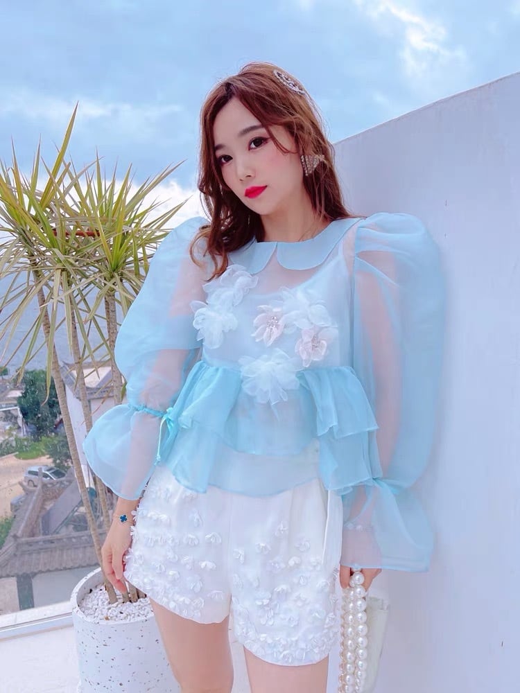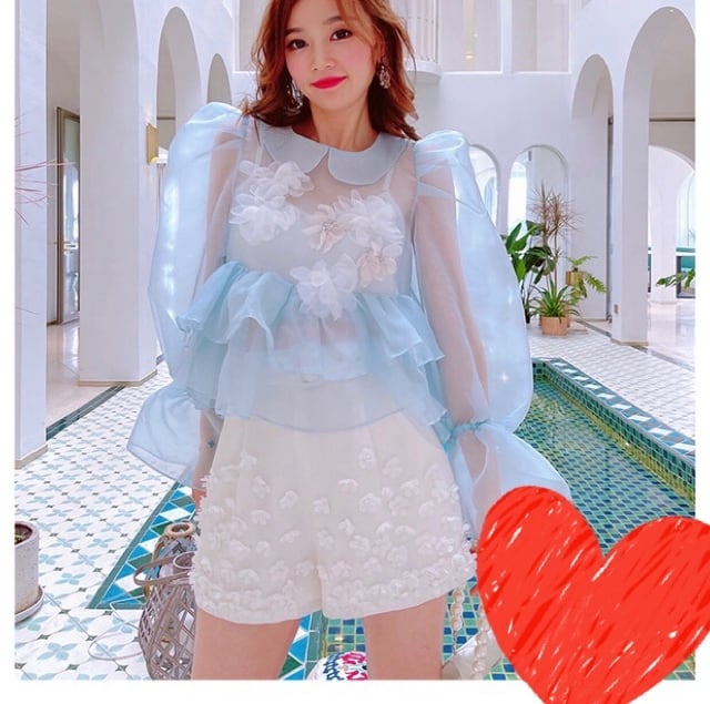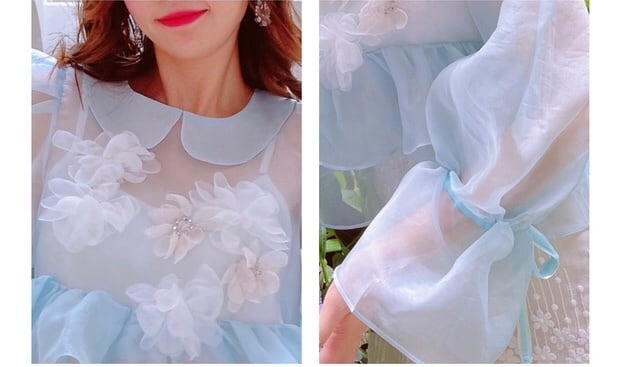 水色 ブラウス シースルー トップス 花柄 フラワー さわやか
