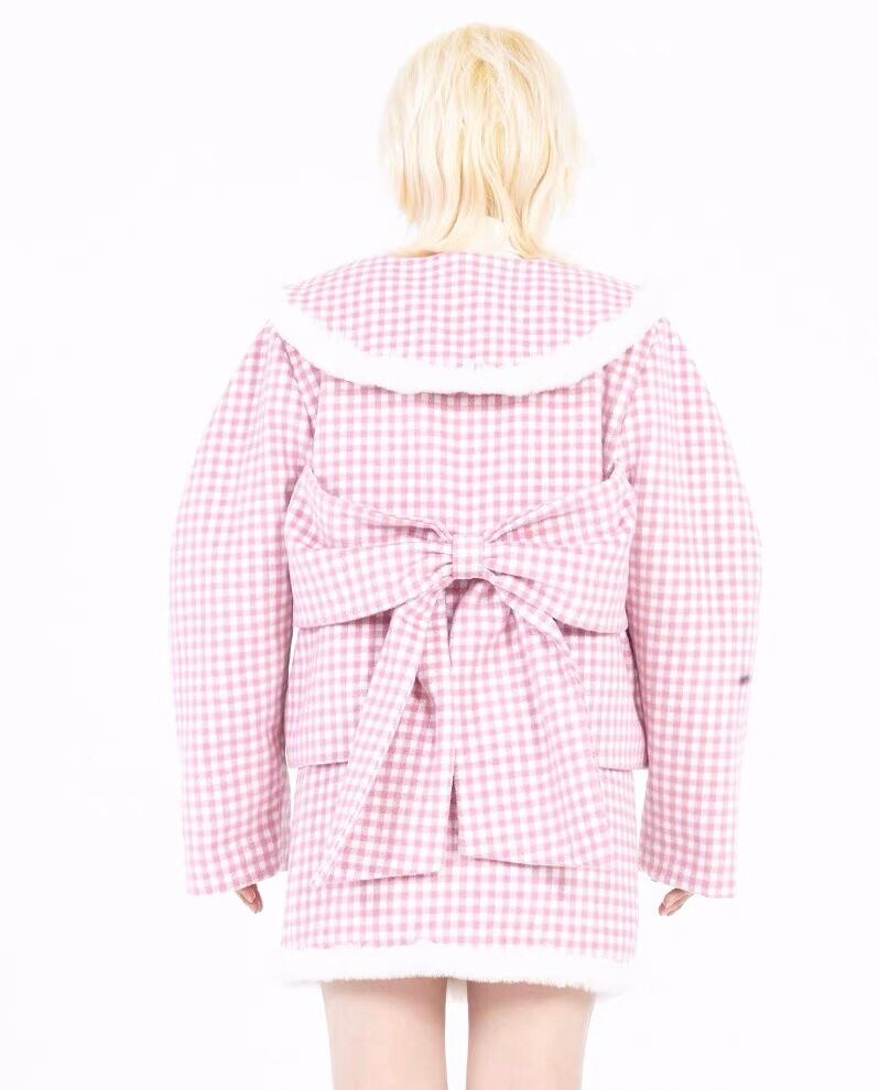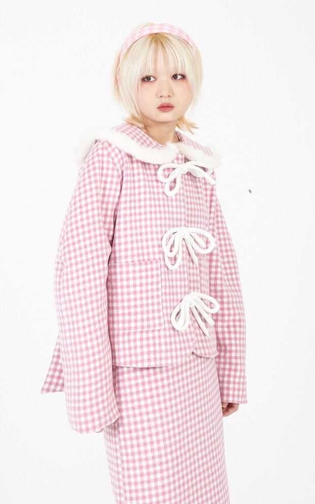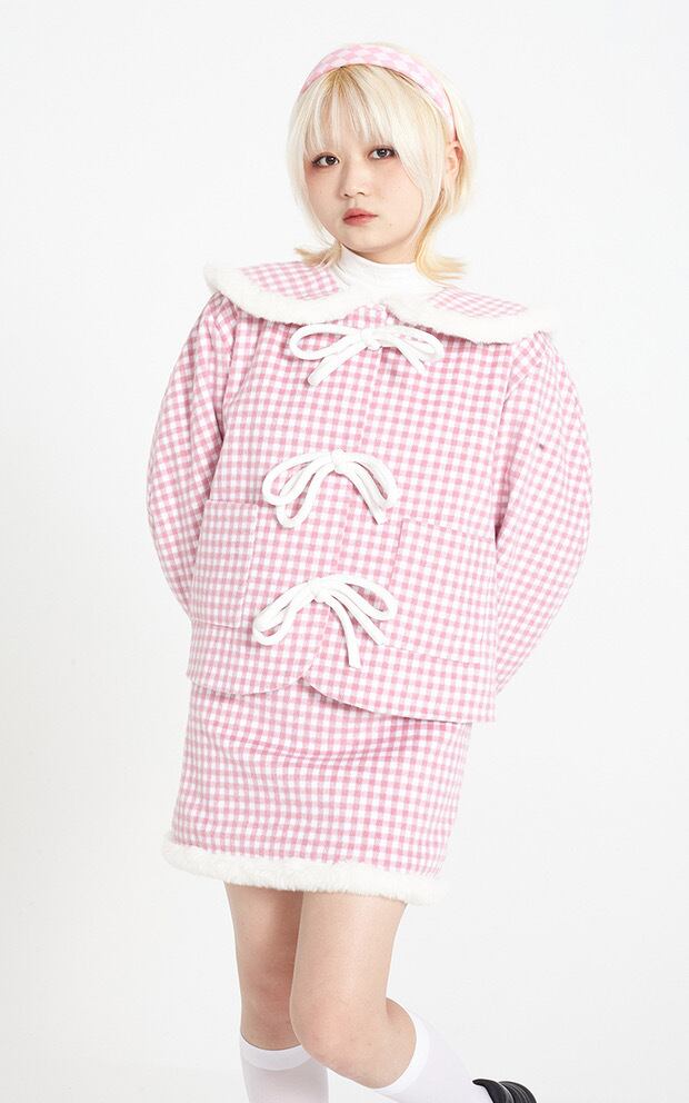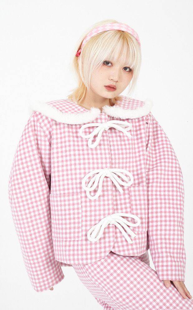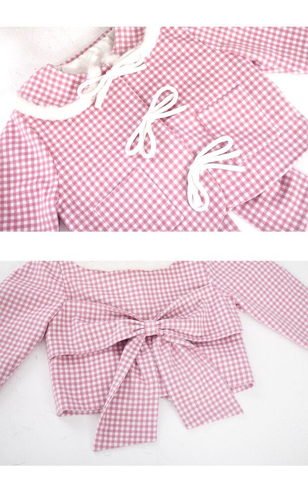 ピンク チェック アウター ジャケット コート 丸襟 リボン カーディガン ジャンパー 可愛い ガーリー