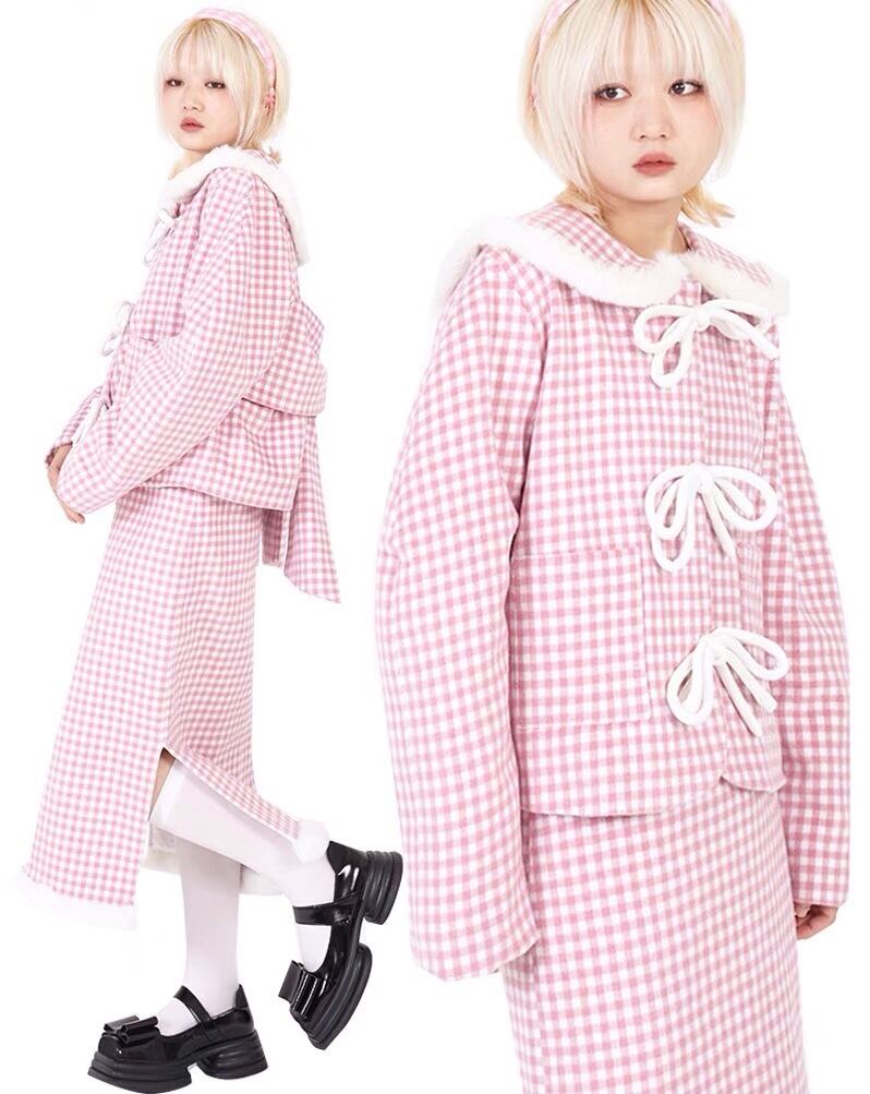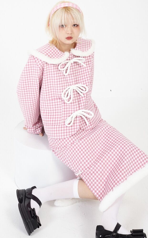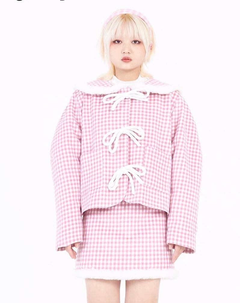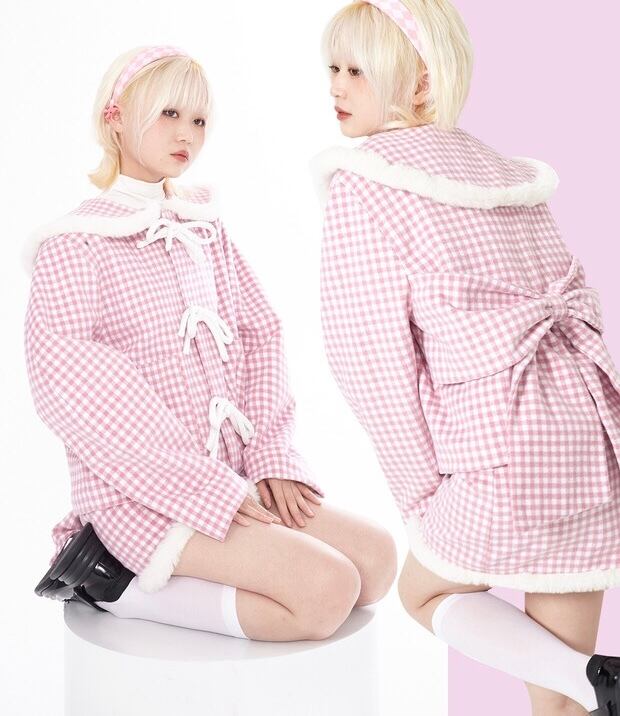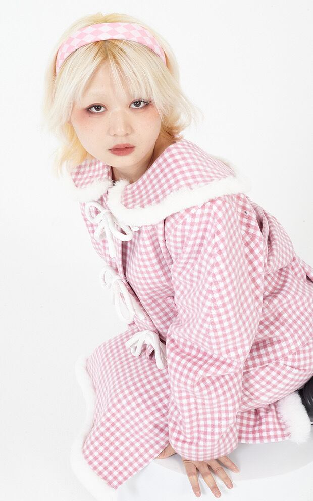 ピンク チェック アウター ジャケット コート 丸襟 リボン カーディガン ジャンパー 可愛い ガーリー