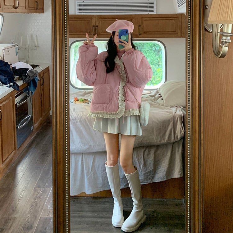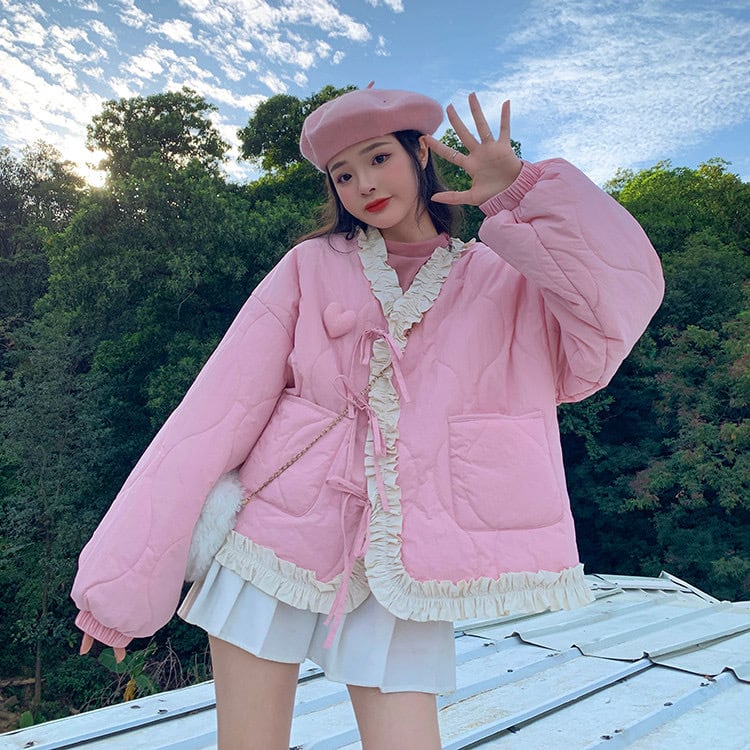 ピンク アウター ダウン ジャケット リボン リボン コート ガーリー ワンピース コート アウター 黒 リボン スクール 制服 ジャケット カーディガン
