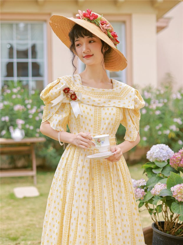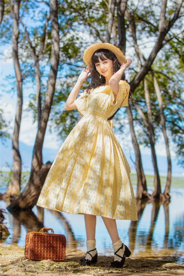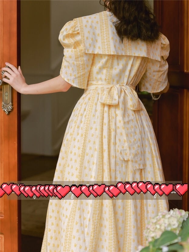 ワンピース 黄色 ワンピース ガーリー 可愛い フレア ロング マキシ ドレス ブラウス シャツ さわやか ヴィンテージ リボン フリル