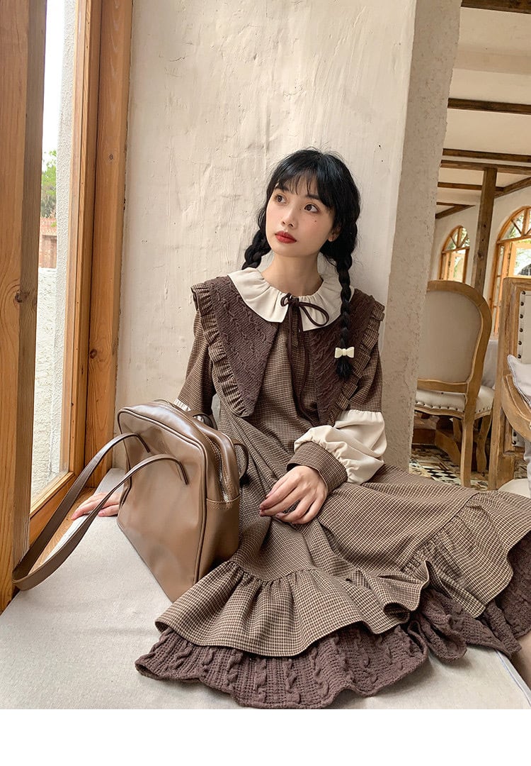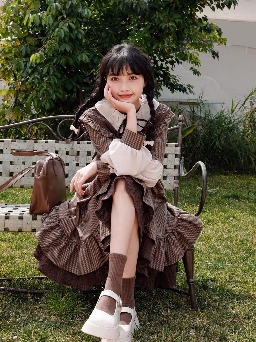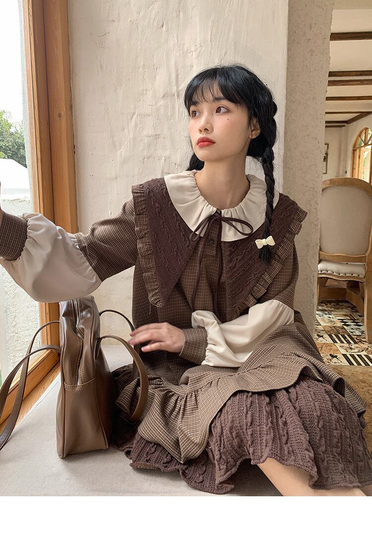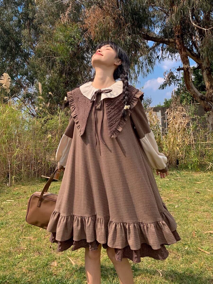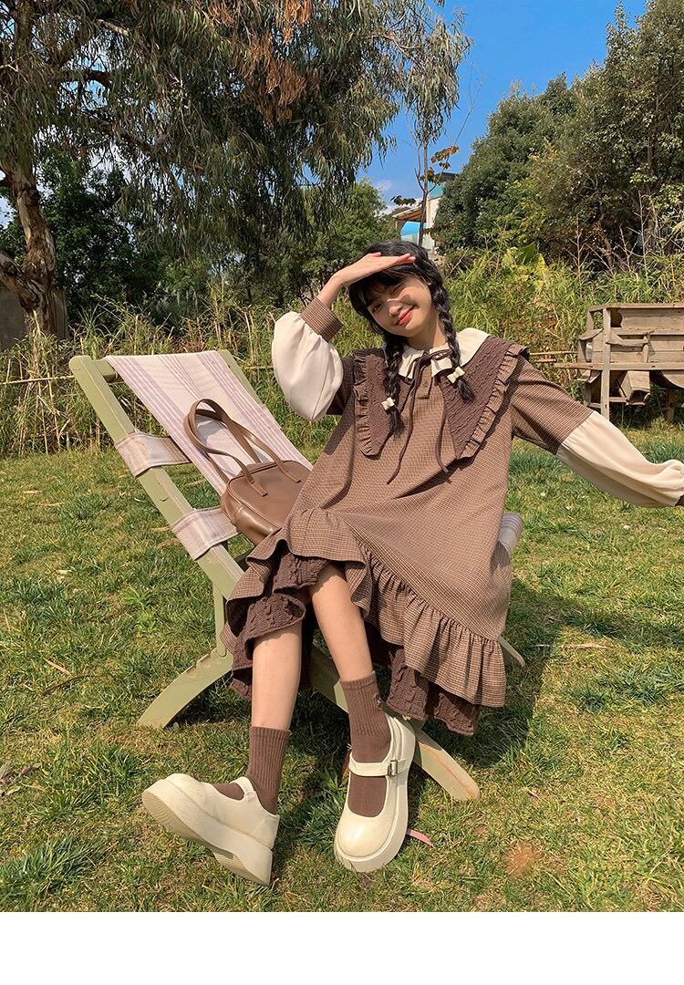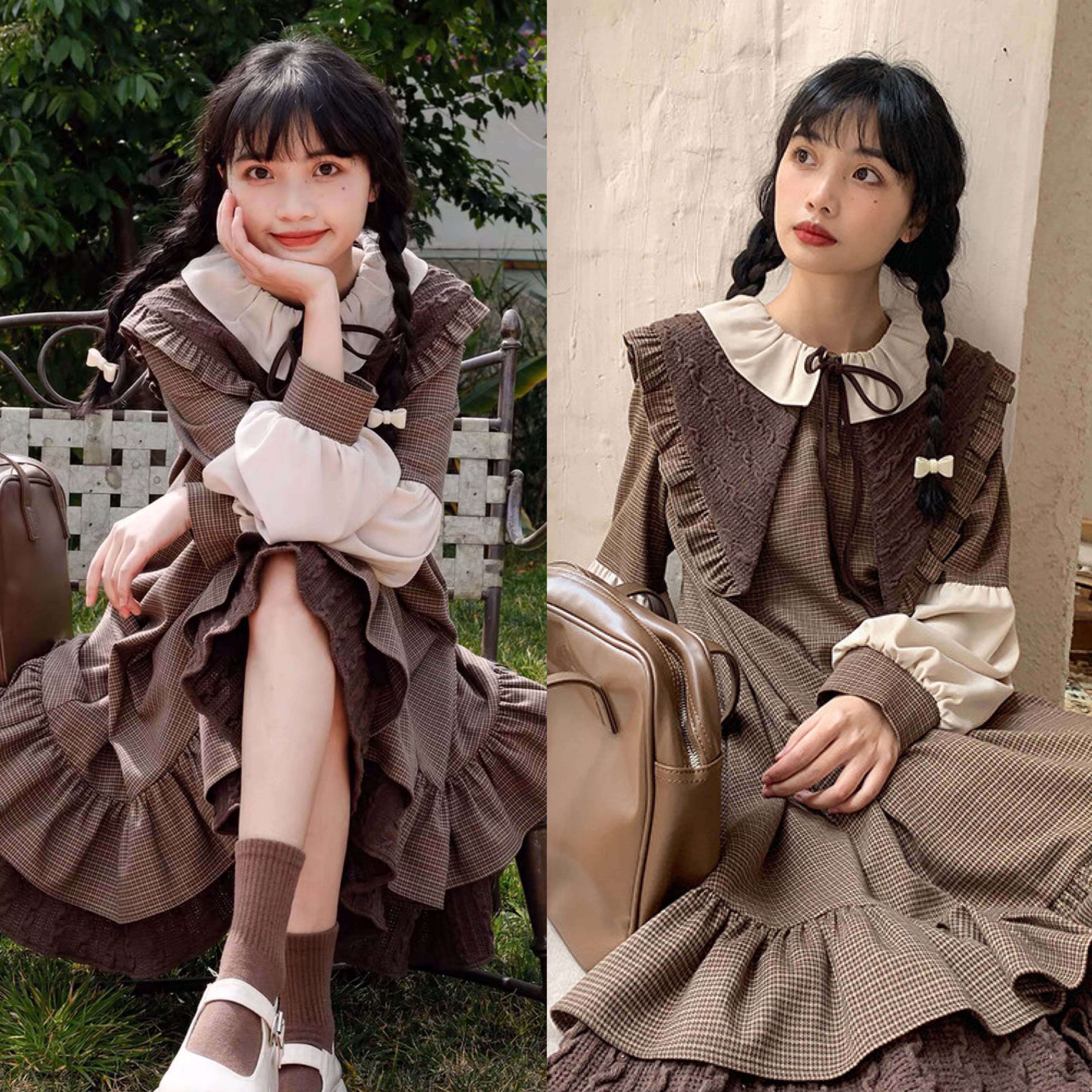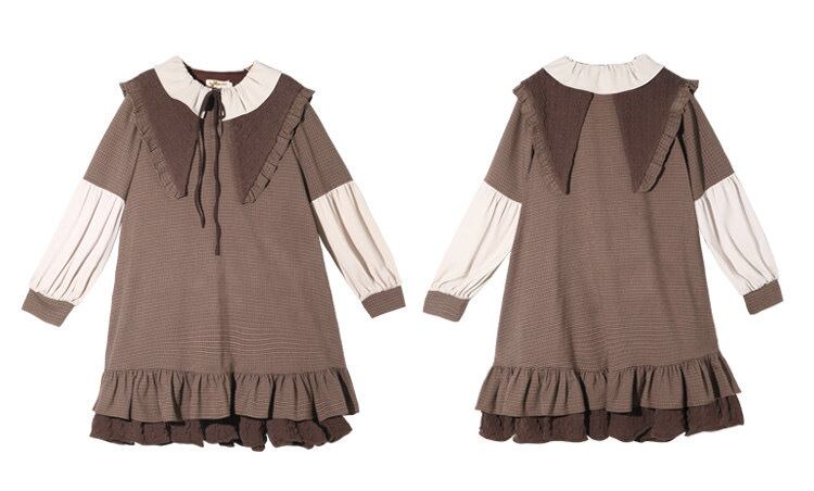 ワンピース 茶 スクール 制服 ワンピース 黄色 お嬢様 春夏 可愛い 花柄 丸襟 ブラウス リボン 姫 ガーリー 原宿
