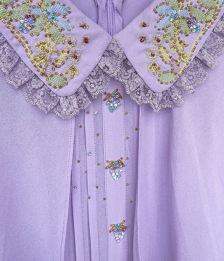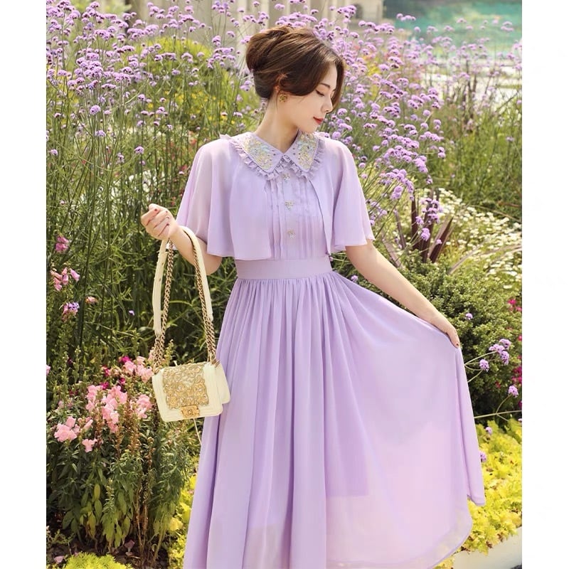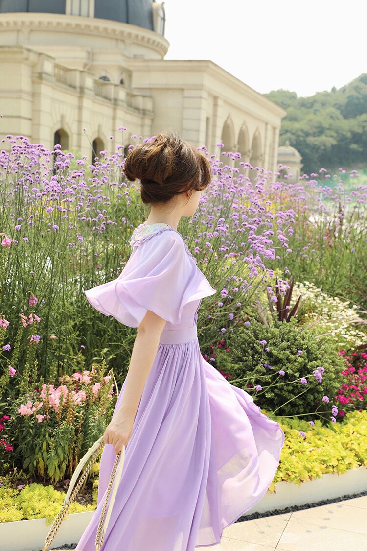 ワンピース 襟 デコレーション パープル 紫 ワンピース 花柄 紫 フラワー エレガント ゴージャス お嬢様 ブラウス リボン 可愛い 姫 フレア パープル 紫 スカート シフォン パーティー ドレス マキシ ロング
