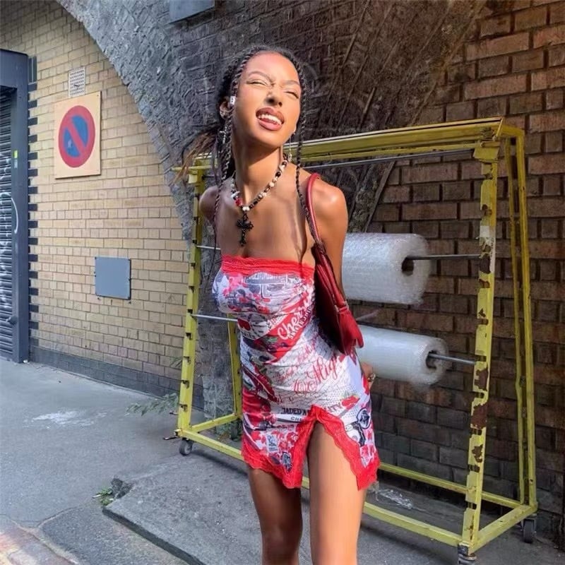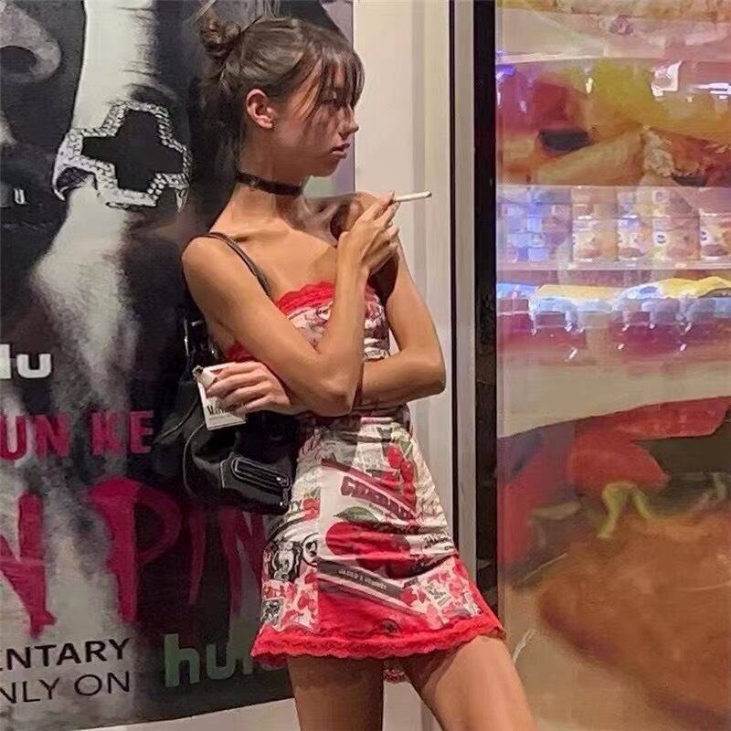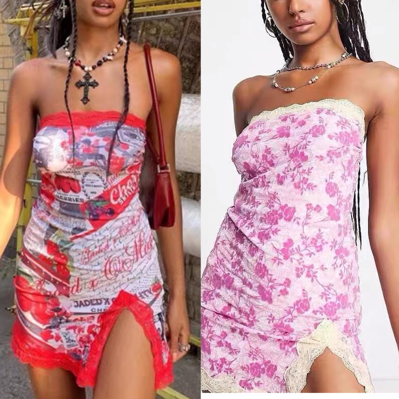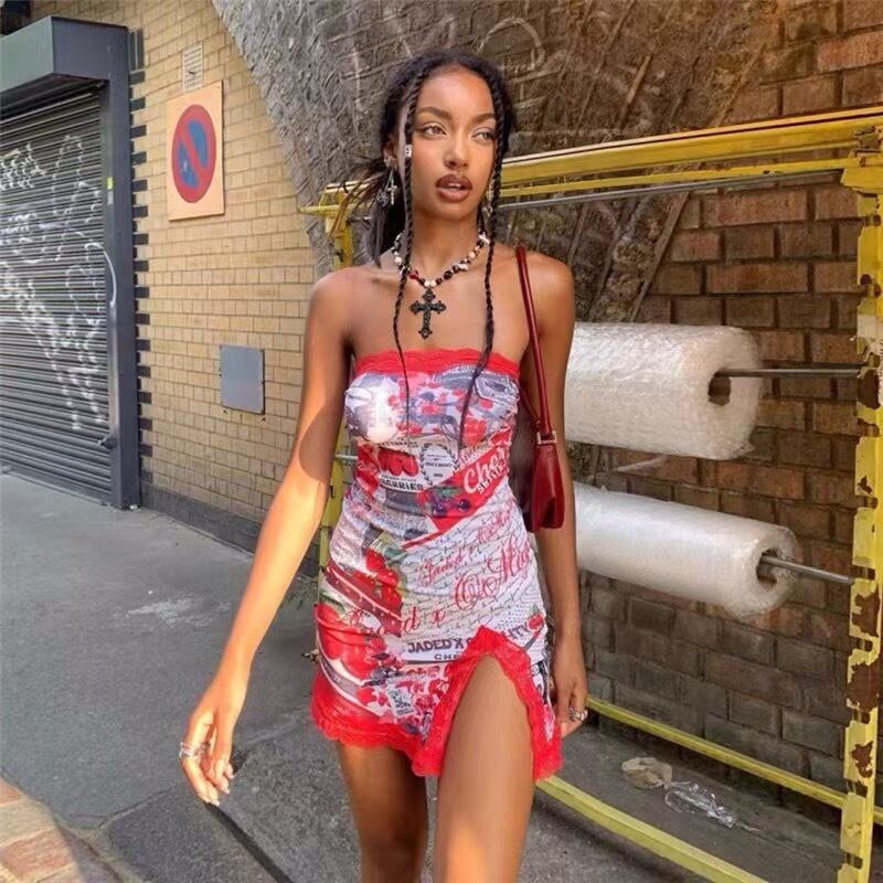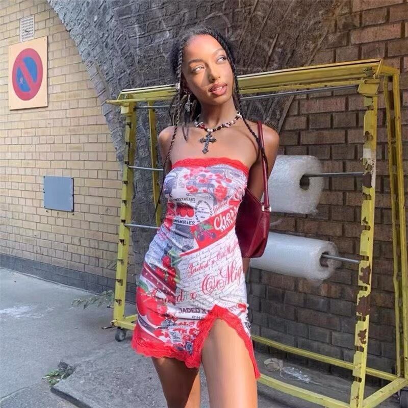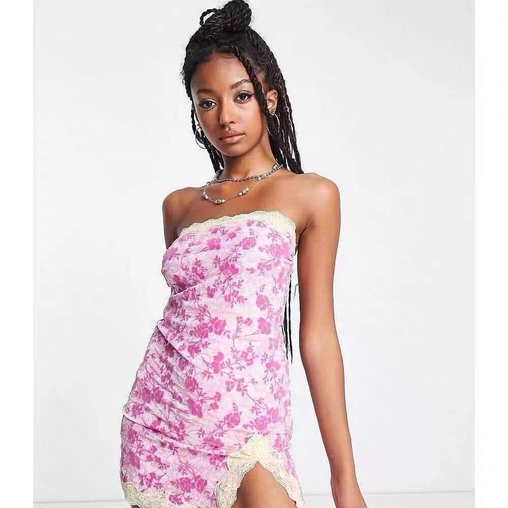 【赤・即納❣️】ワンピース 花柄 ピンク ストリート ベアトップ スリット トップス 花柄 フラワー 赤 紫 スカート クラブ サイバー ダンス タンクトップ キャミソール ボトムス セクシー パジャマ ルームウェア インナー
