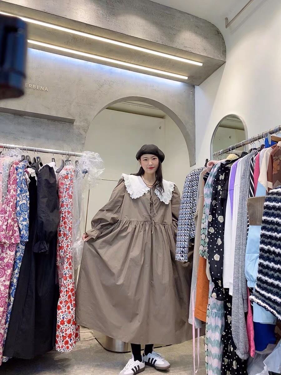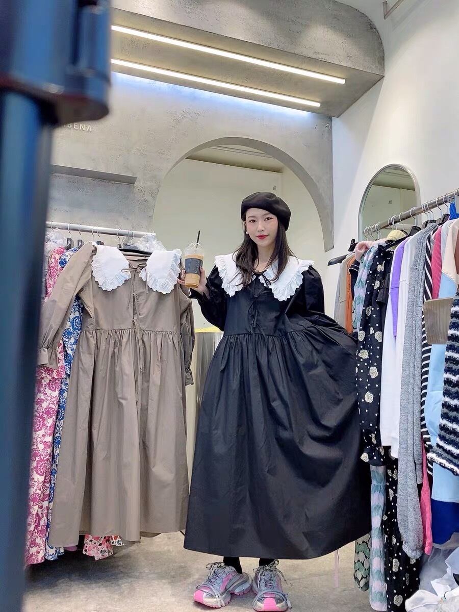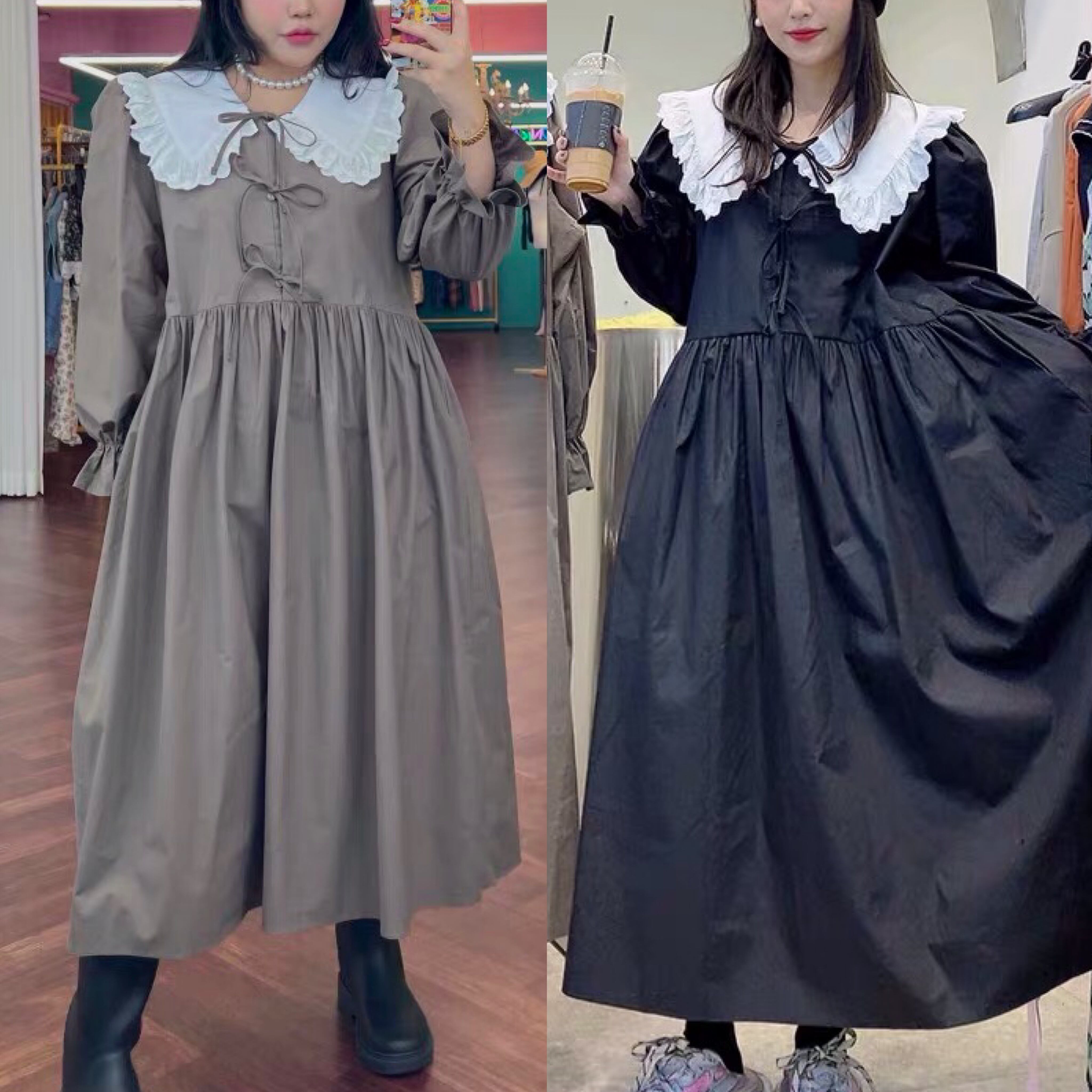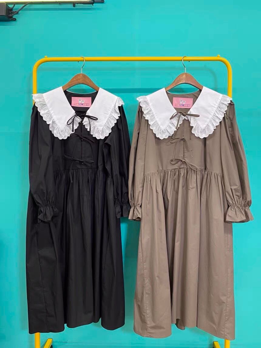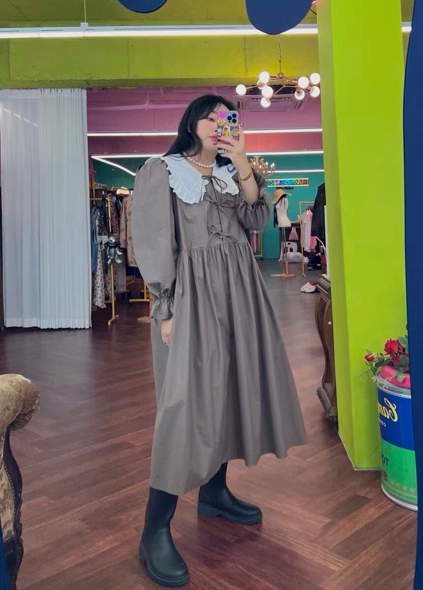 ワンピース ベージュ 茶色 黒 丸襟 ワンピース ゆったり ピンク リボン カジュアル マキシ ロング ブラウス スカート XL かわいい 可愛い ゆったり オーバーサイズ ビッグシルエット 原宿 渋谷 マタニティー