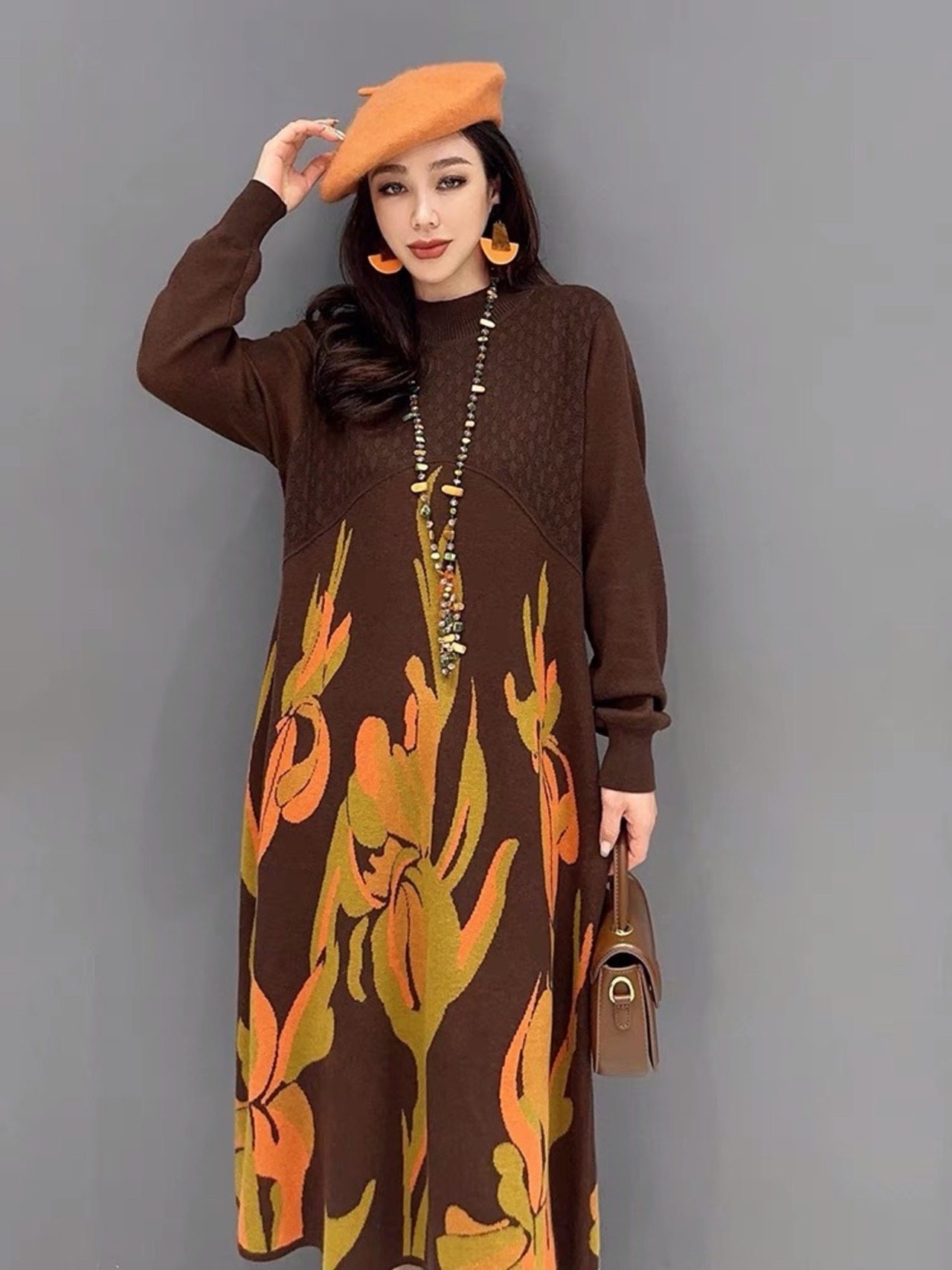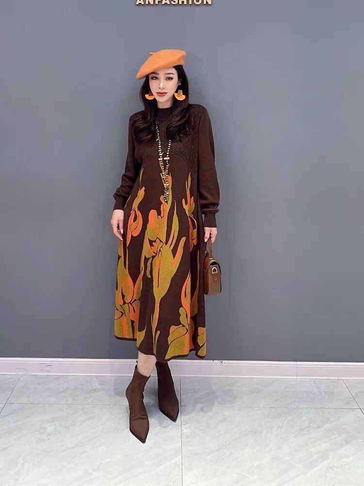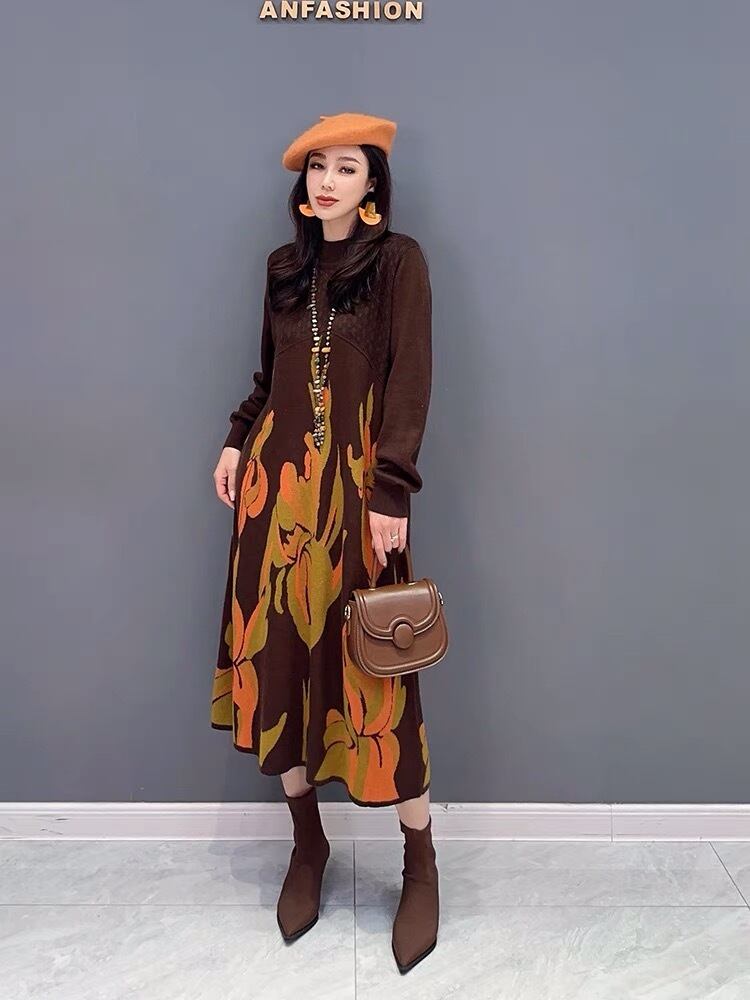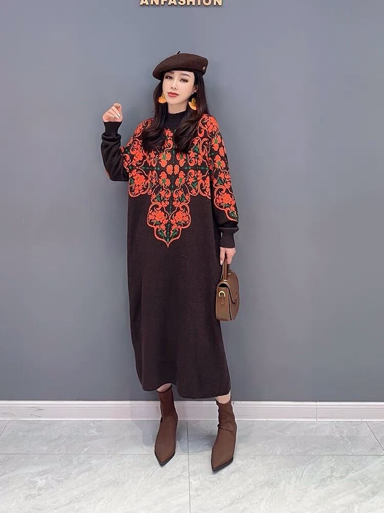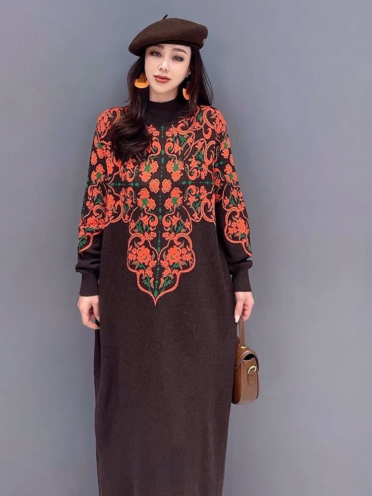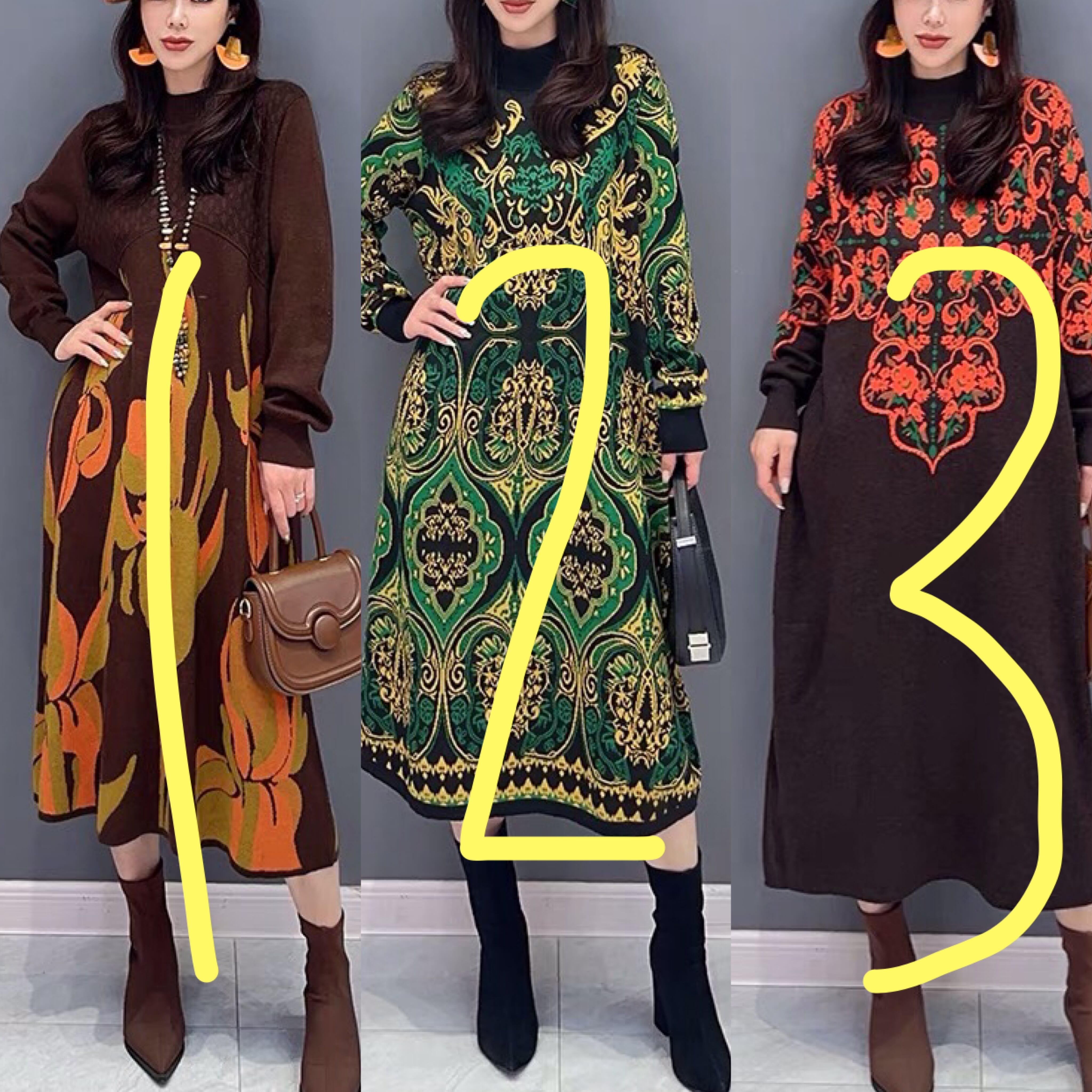 ワンピース ニット 花柄 フラワー 緑 オレンジ ハイネック 茶色 スカーフ ワンピース ゆったり ピンク リボン カジュアル マキシ ロング ブラウス スカート XL かわいい 可愛い ゆったり オーバーサイズ ビッグシルエット 原宿 渋谷 マタニティー セーター カーディガン