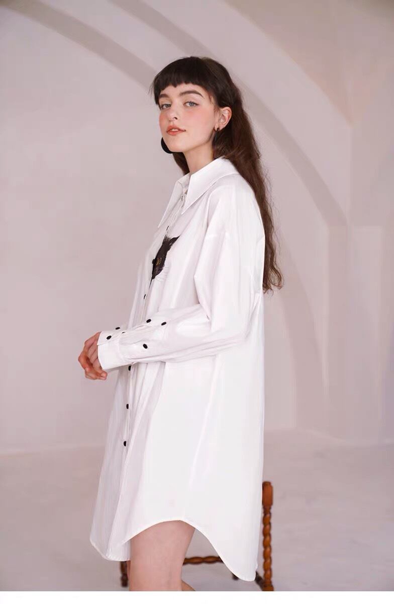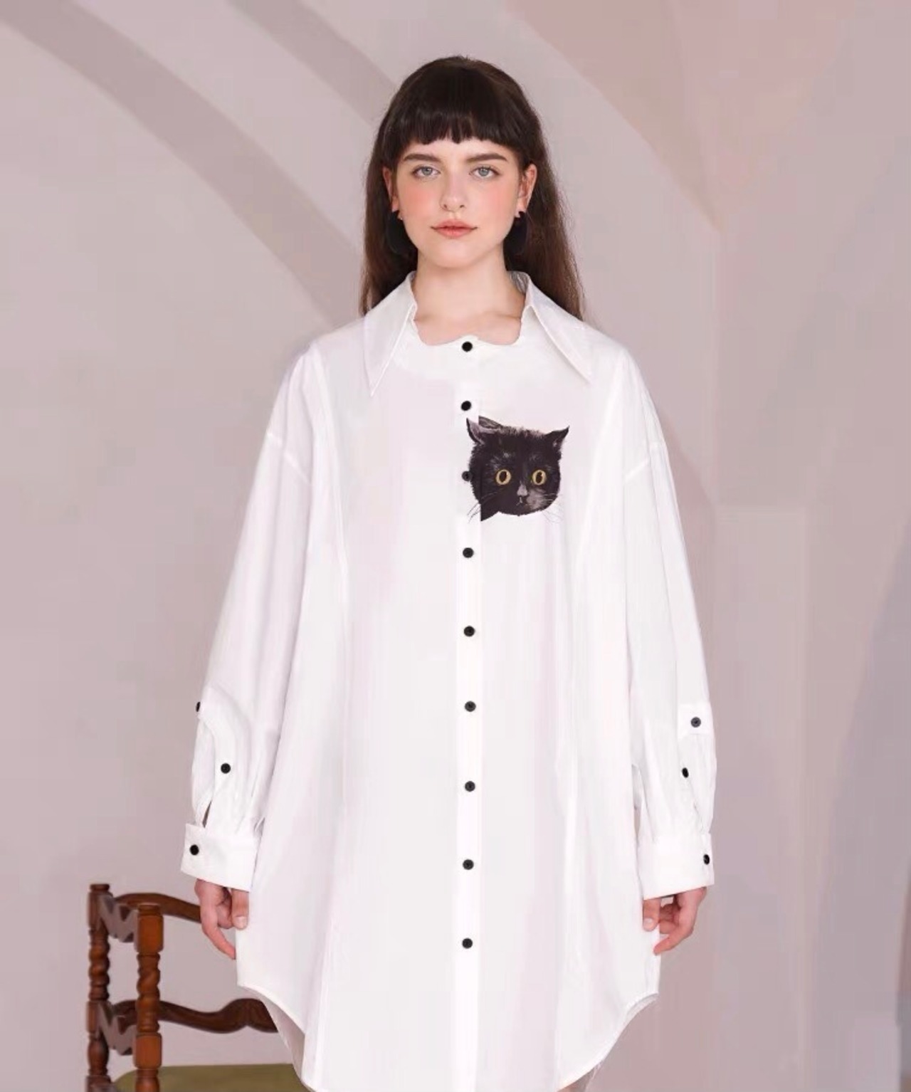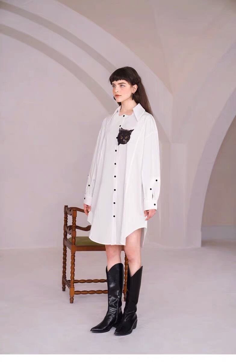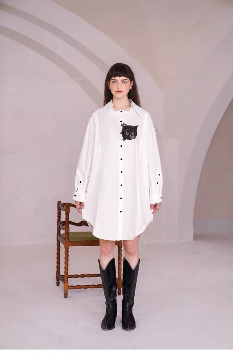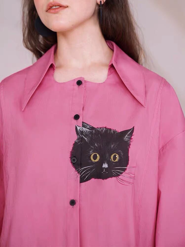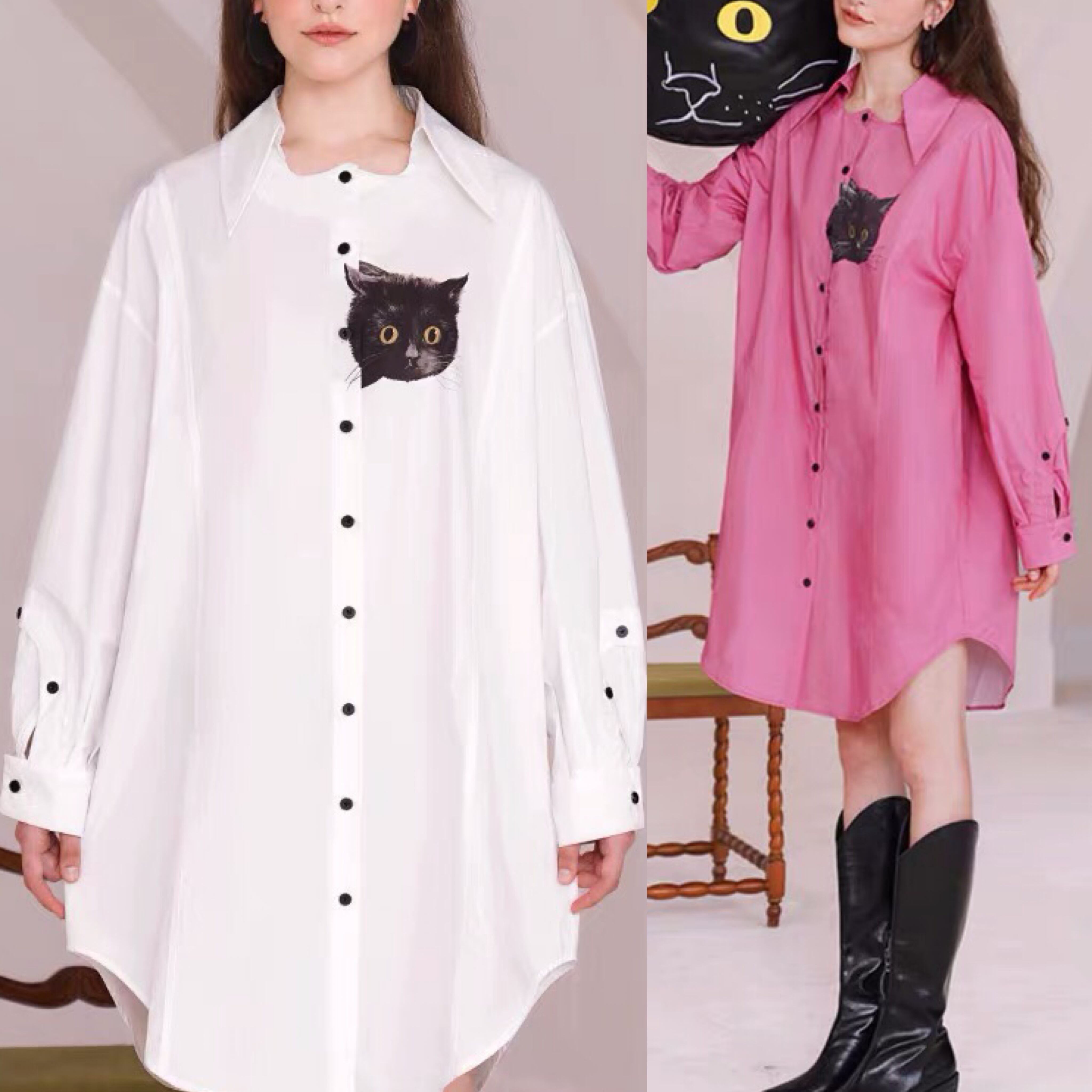 ブラウス ねこちゃん 猫 アニマル シャツ ワンピース ピンク 白 カジュアル ゆったり オーバーサイズ ビッグシルエット カジュアル トップス シンプル