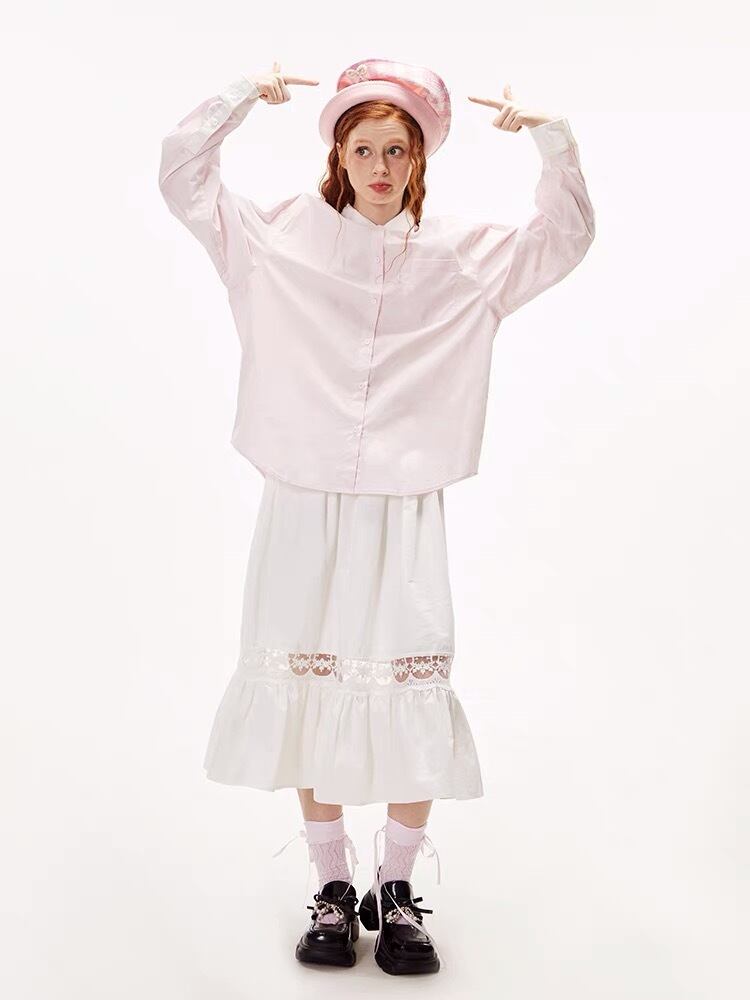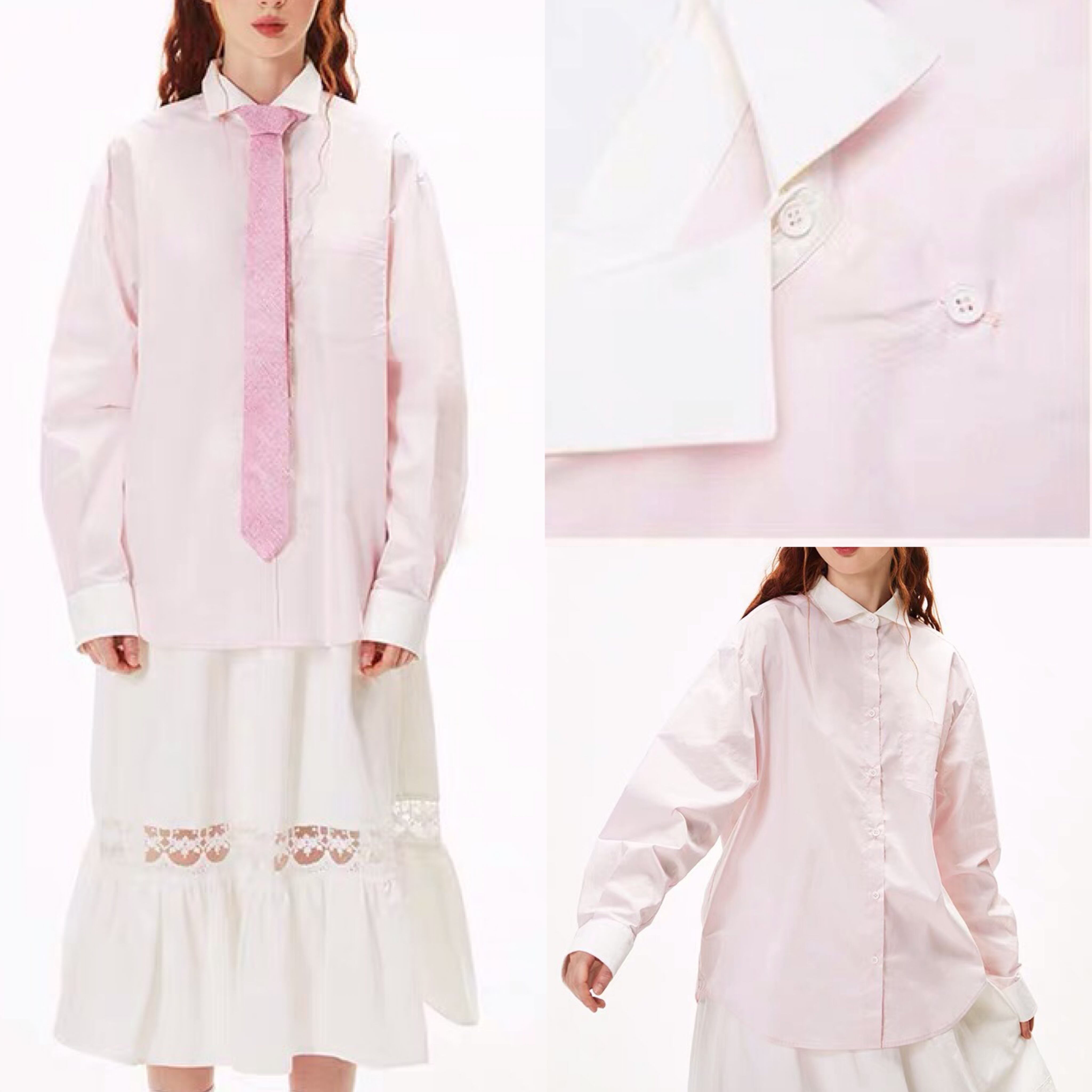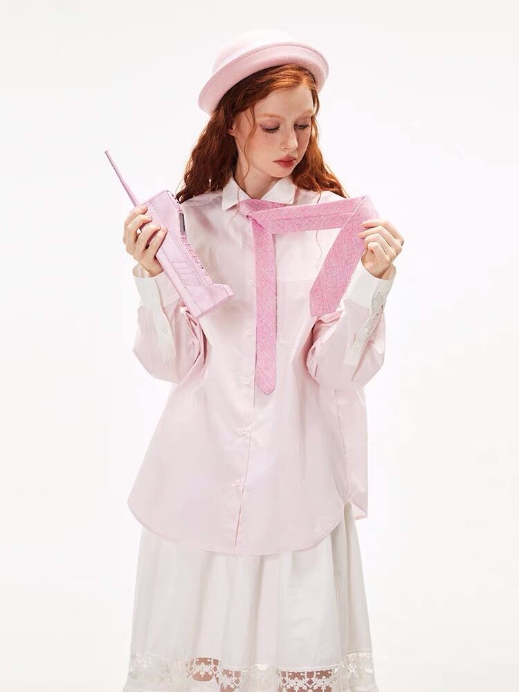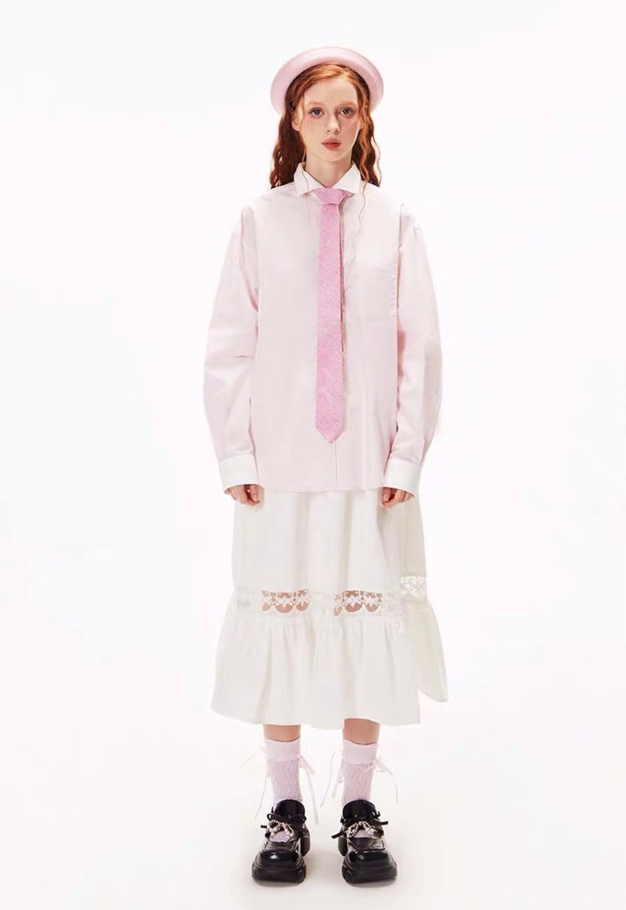 ピンク ネクタイ 無地 ガーリー 白 ホワイト シンプル ボトムス マキシ ゆったり 原宿 渋谷 お嬢様 姫 エレガント フレア ワンピース ブラウス シンプル オーバーサイズ ビッグシルエット
