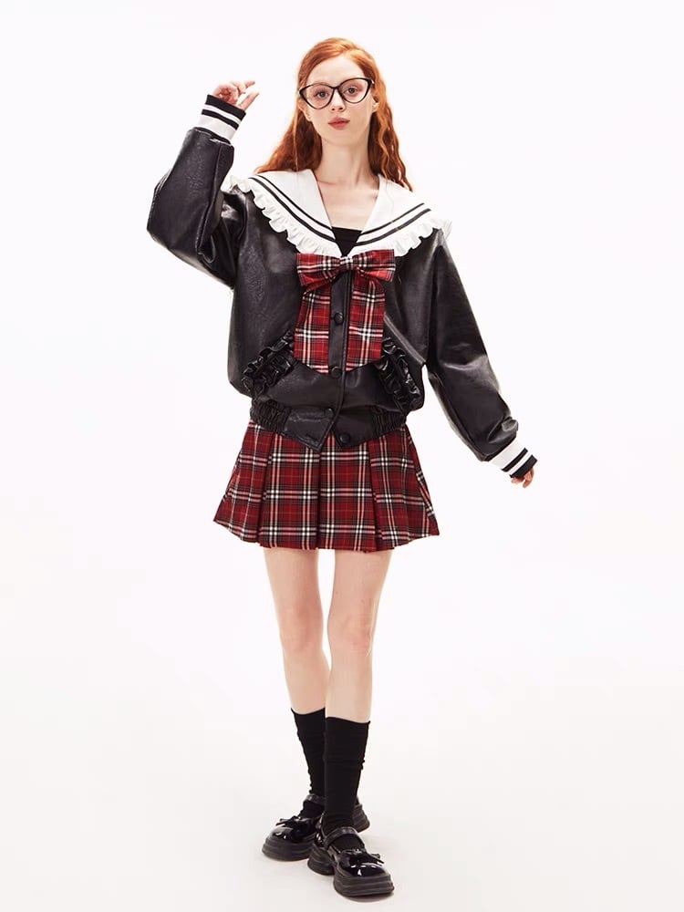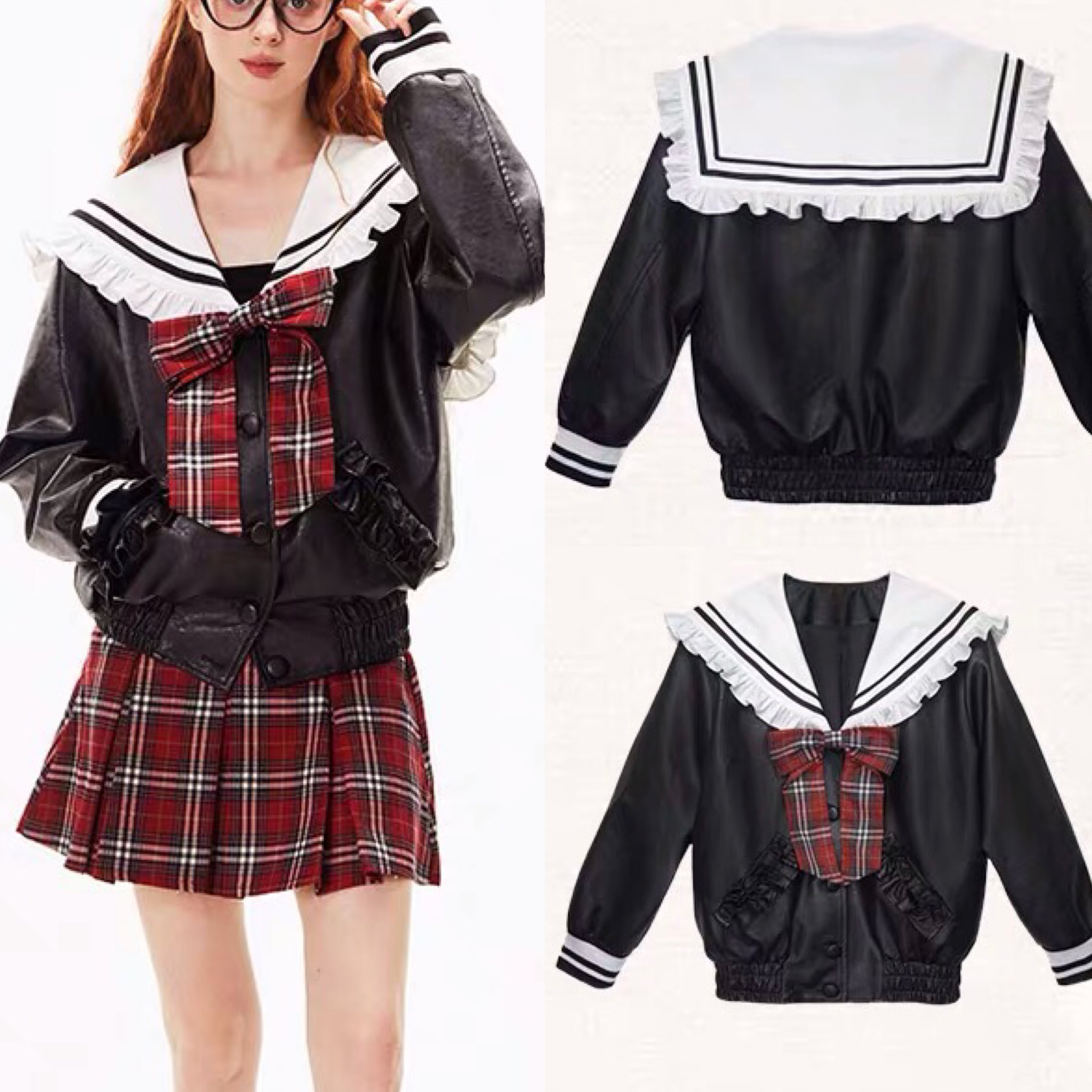 【ジャケット】セーラー リボン 赤 チェック ワンピース 緑 お嬢様 制服 スクール チェック リボン フリル ガーリー 白 ホワイト シンプル ボトムス マキシ ゆったり 原宿 渋谷 お嬢様 姫 エレガント フレア ワンピース ブラウス シンプル