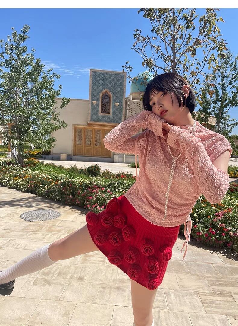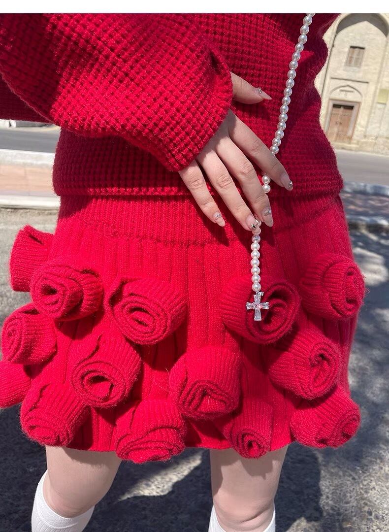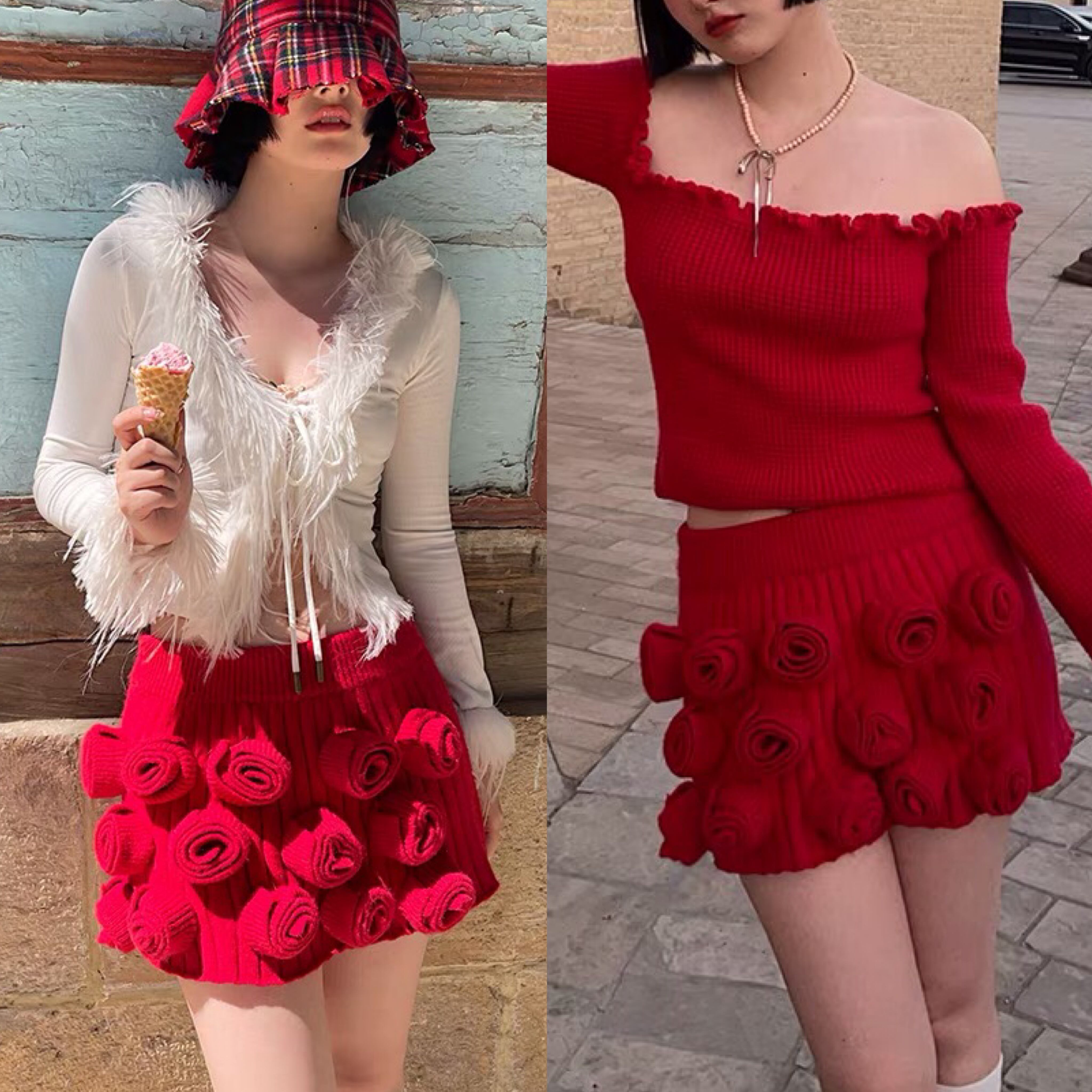 【スカート】薔薇 ニット 刺繍 花柄 フラワー ワンピース 緑 お嬢様 制服 スクール チェック リボン フリル ガーリー 白 ホワイト シンプル ボトムス マキシ ゆったり 原宿 渋谷 お嬢様 姫 エレガント フレア ワンピース ブラウス シンプら