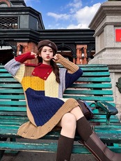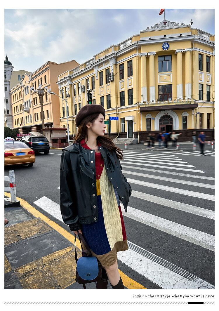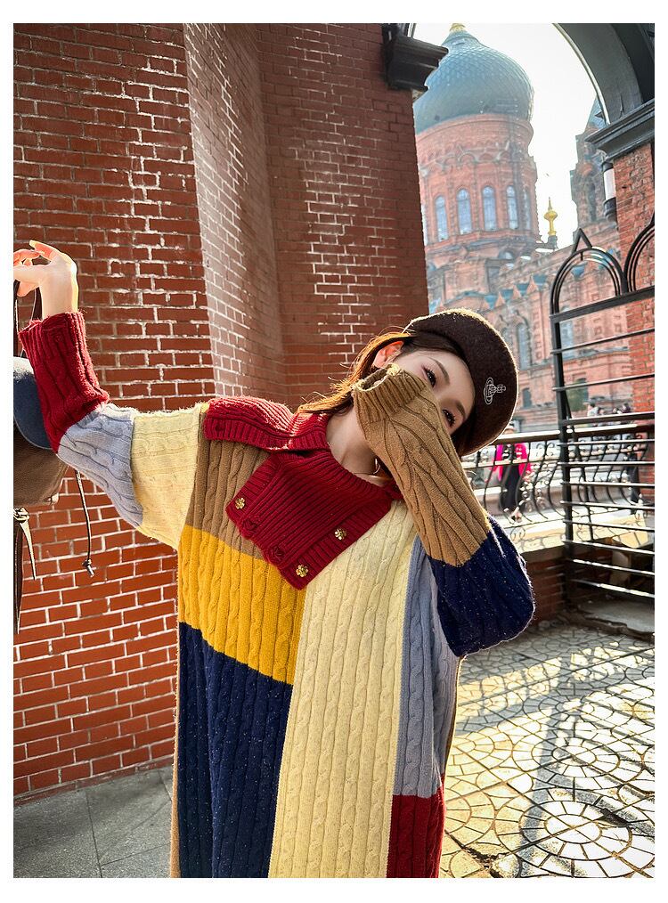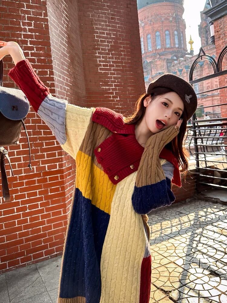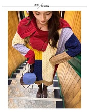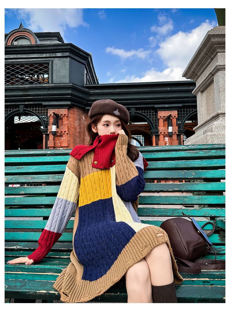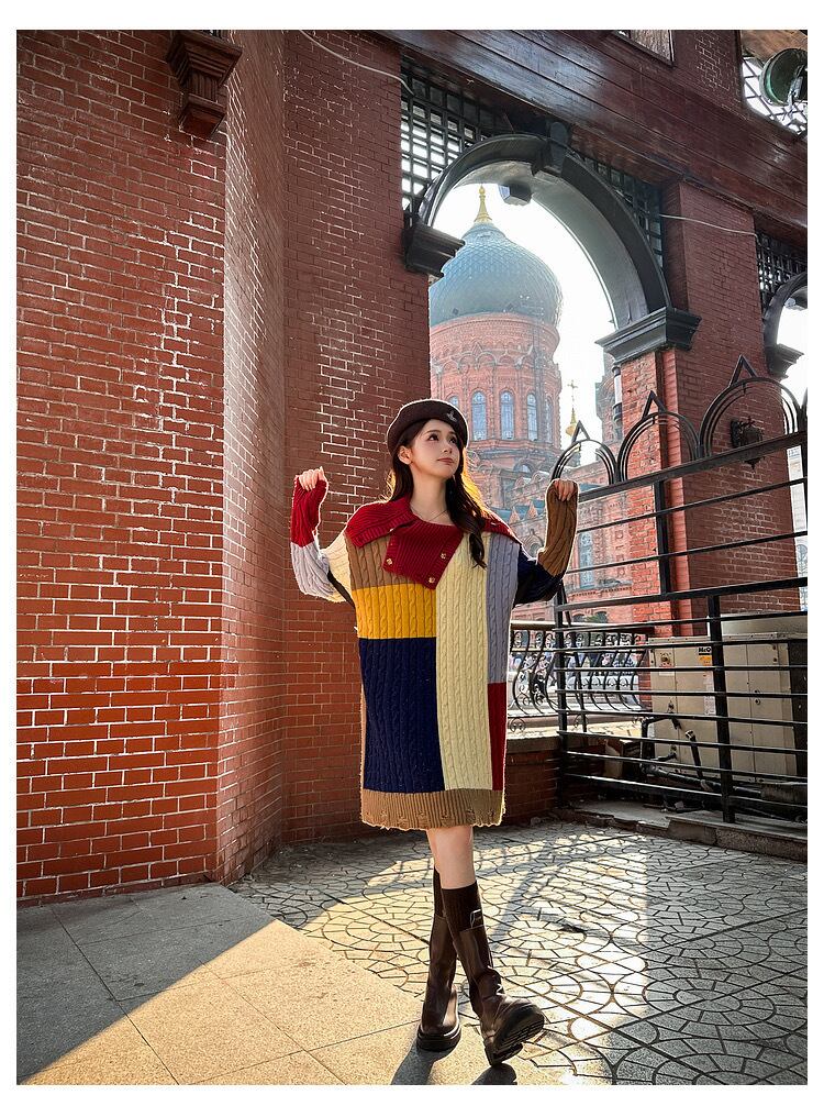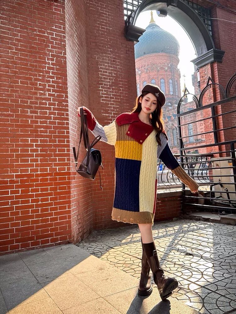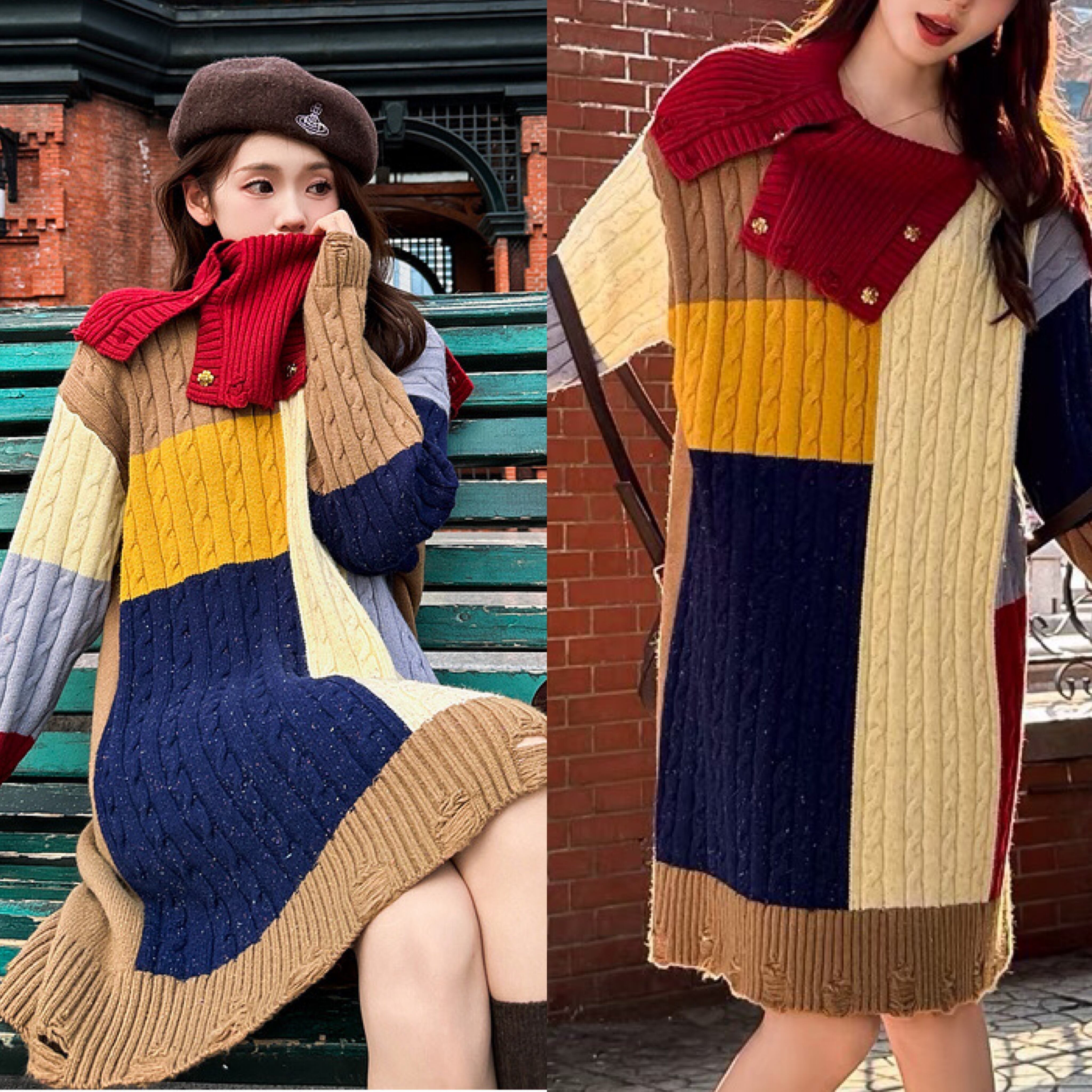 セーター ワンピース パッチワーク 黄色 赤 ベージュ 茶色 セーター ニット ハイネック ワンピース 緑 お嬢様 制服 スクール チェック リボン フリル ガーリー 白 ホワイト シンプル ボトムス マキシ ゆったり 原宿 渋谷 お嬢様 姫 エレガント フレア ワンピース ブラウス シンプら