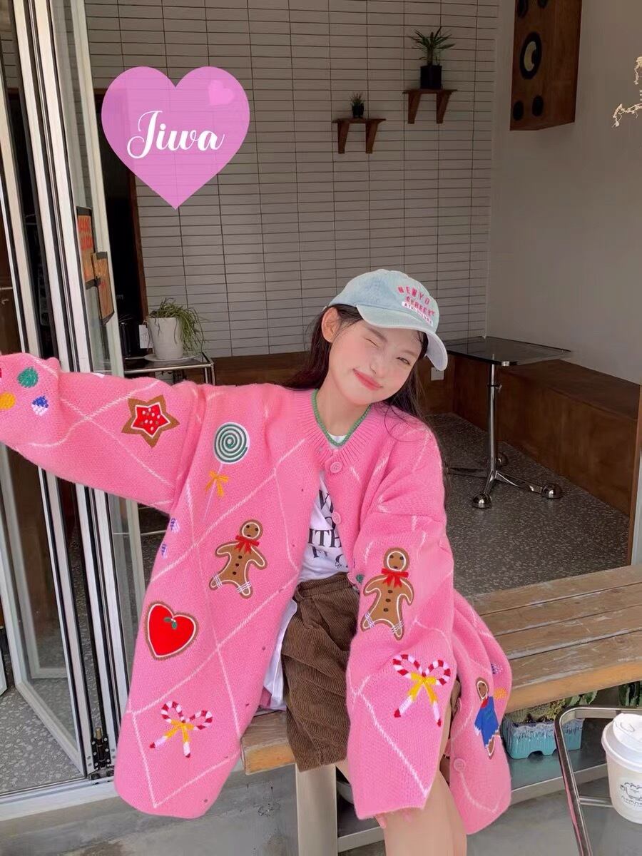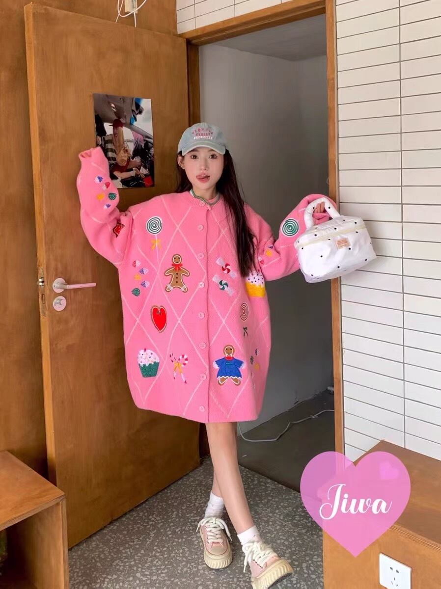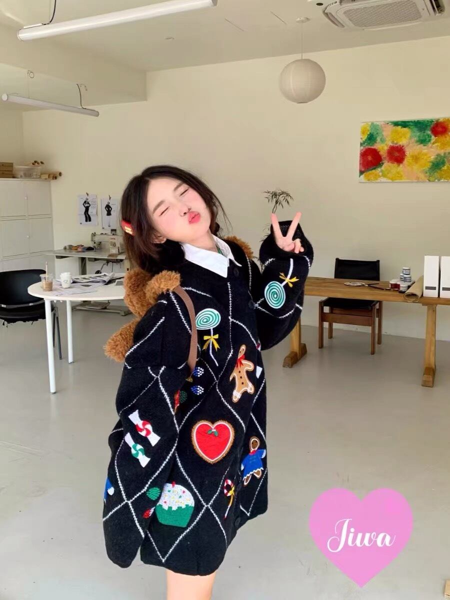 カーディガン くま ニット ピンク 黒 ワッペン ジャケット ガーリー 可愛い かわいい 姫 ピンク コート アウター カーディガン ゆったり 原宿 渋谷 ジャンパー アウター カーディガン
