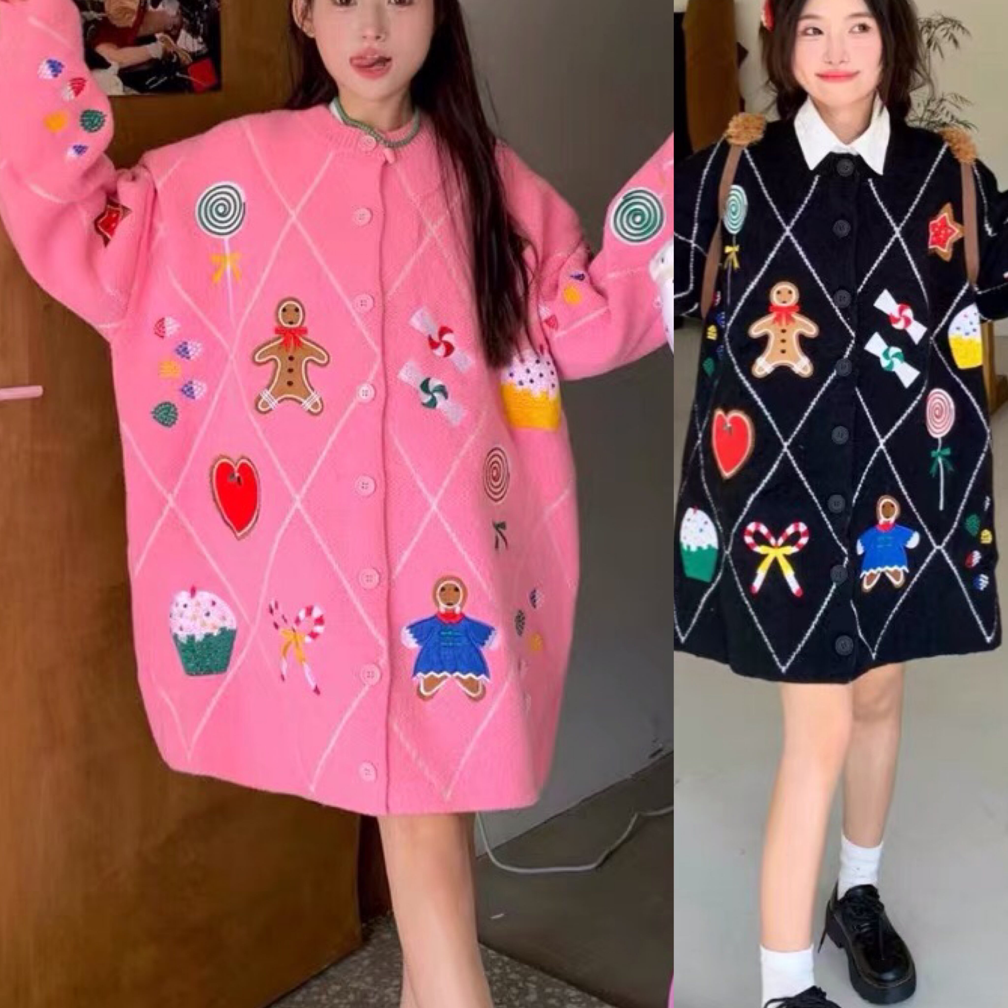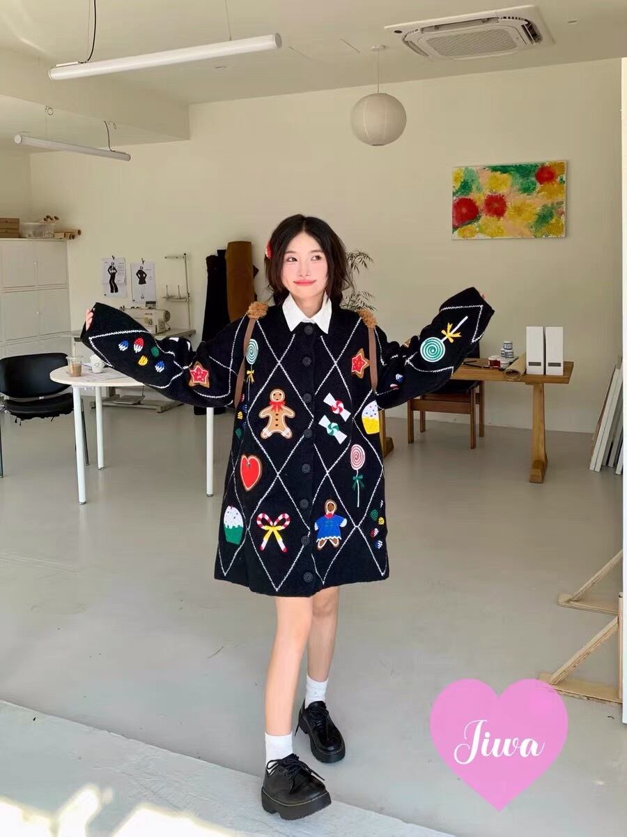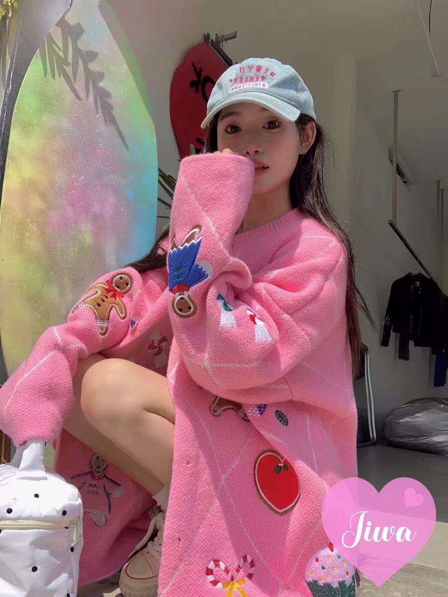 カーディガン くま ニット ピンク 黒 ワッペン ジャケット ガーリー 可愛い かわいい 姫 ピンク コート アウター カーディガン ゆったり 原宿 渋谷 ジャンパー アウター カーディガン