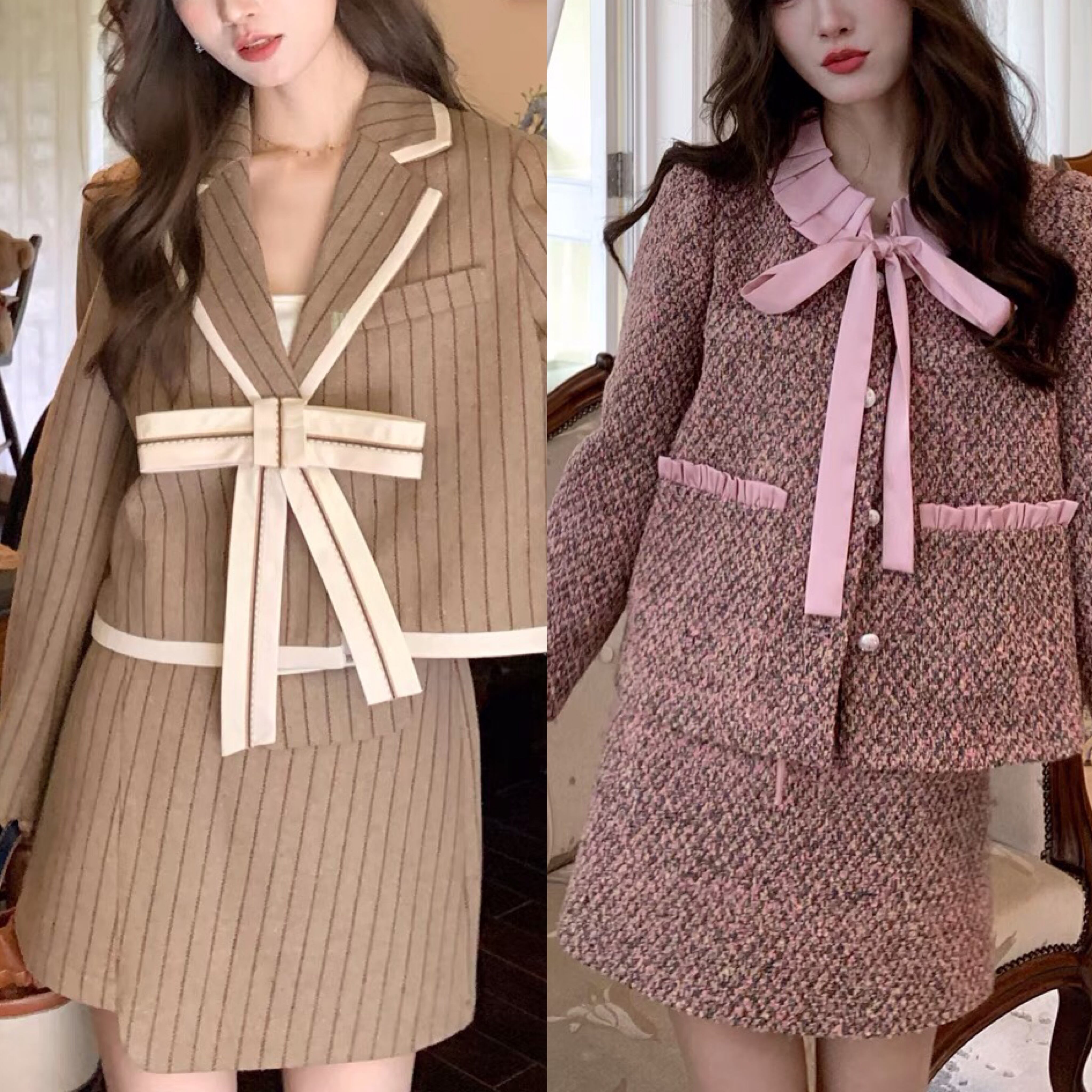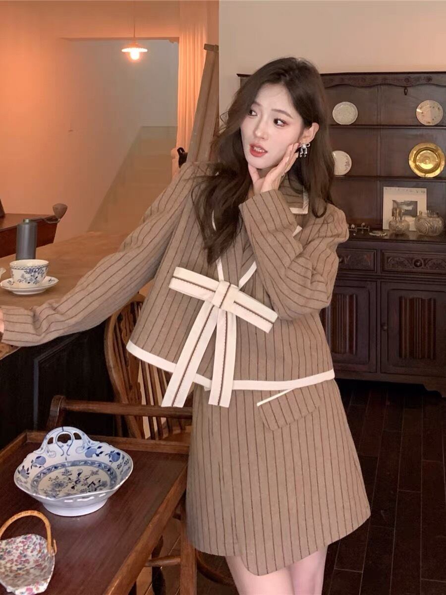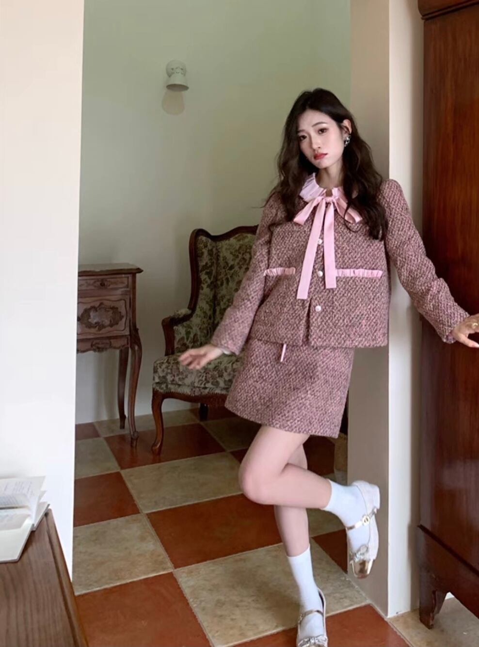 【セットアップ】スーツ ツーピース ジャケット お嬢様 エレガント リボン 茶色 黒 桃 ピンク ニット ゆったり ビッグシルエット オーバーサイズ ブラック カーディガン アウター ジャケット トップス セーター 姫 カーディガン コート ワンピース 原宿 渋谷