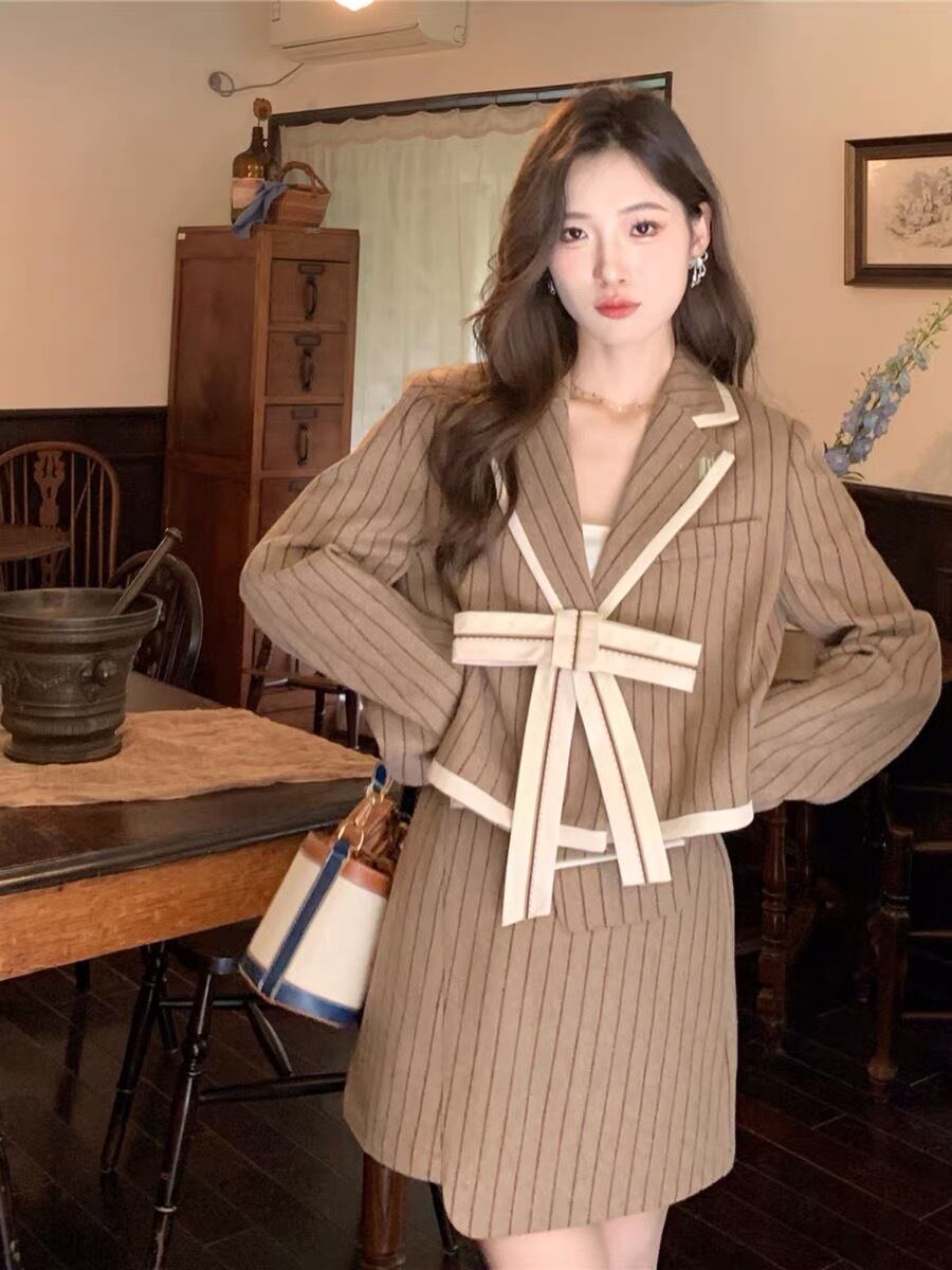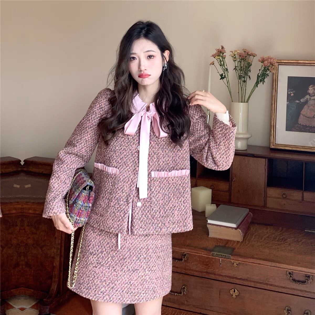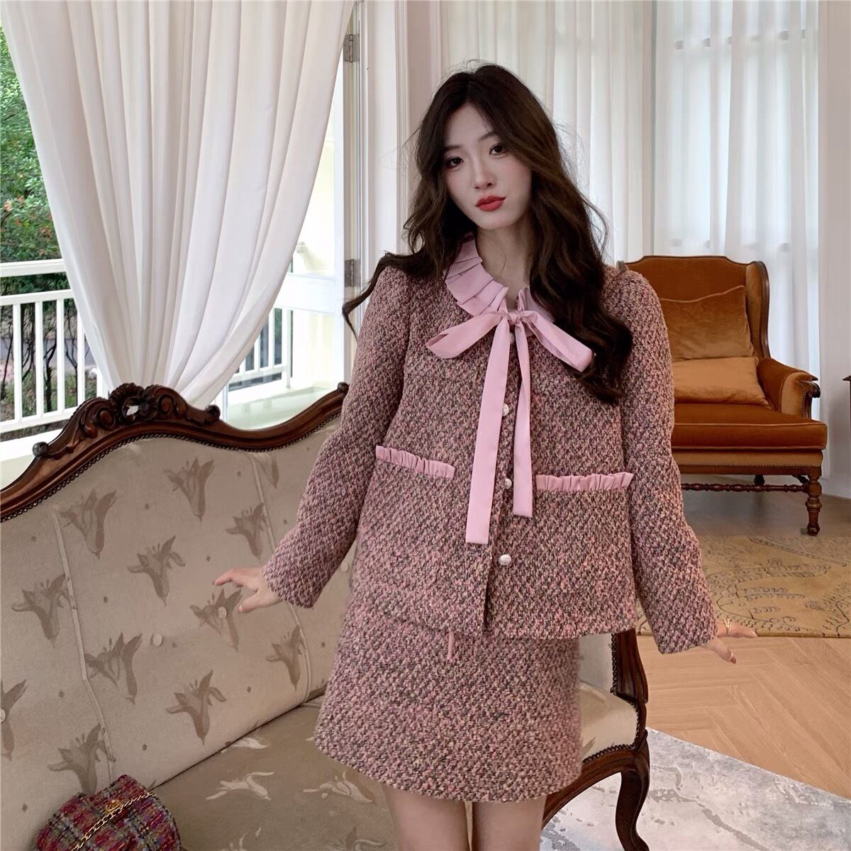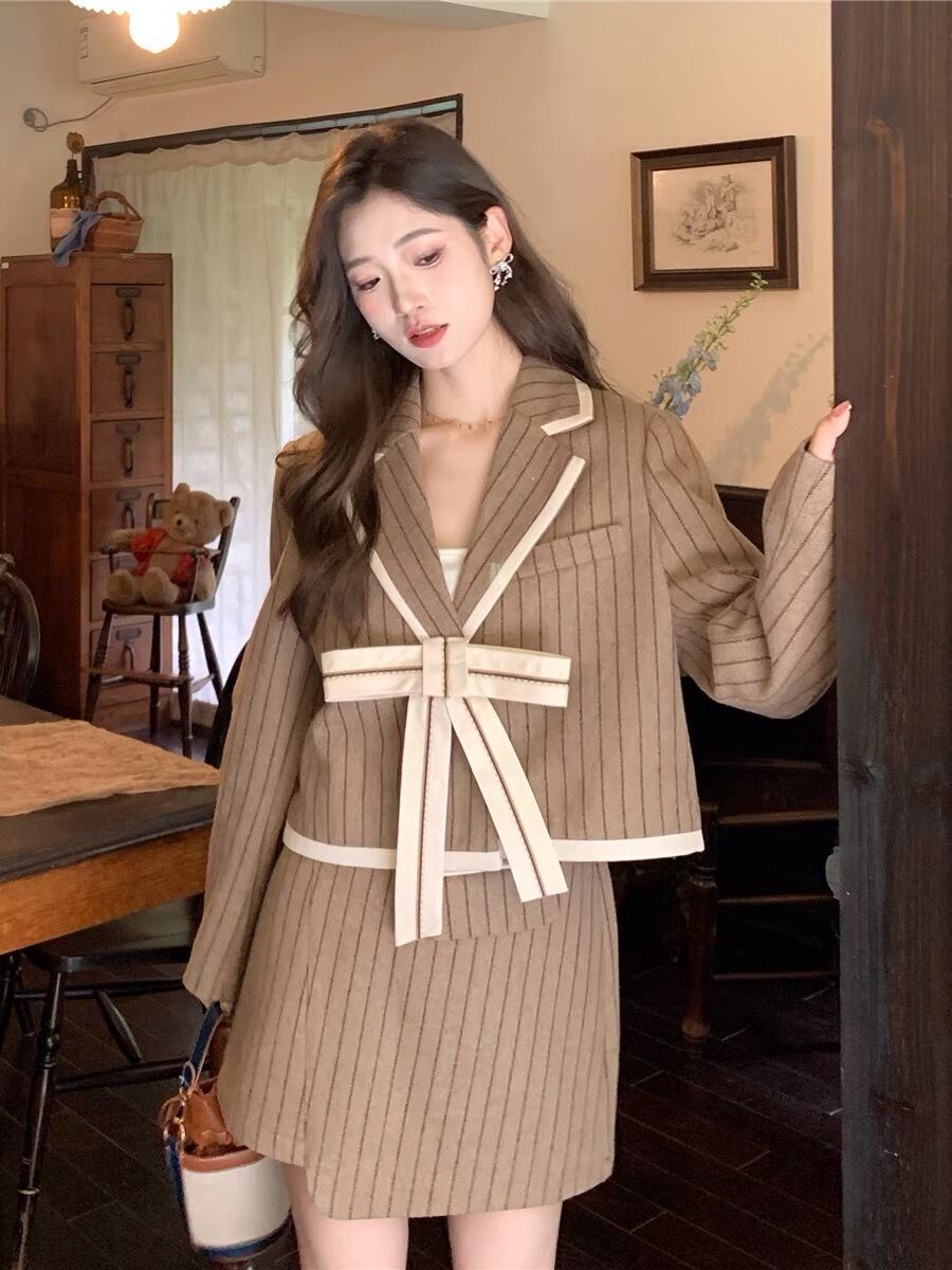 【セットアップ】スーツ ツーピース ジャケット お嬢様 エレガント リボン 茶色 黒 桃 ピンク ニット ゆったり ビッグシルエット オーバーサイズ ブラック カーディガン アウター ジャケット トップス セーター 姫 カーディガン コート ワンピース 原宿 渋谷