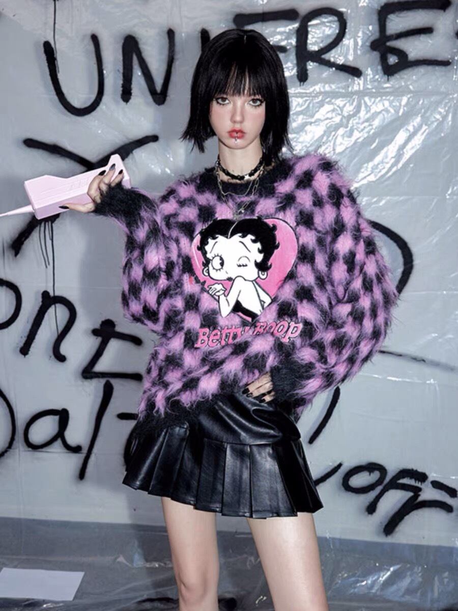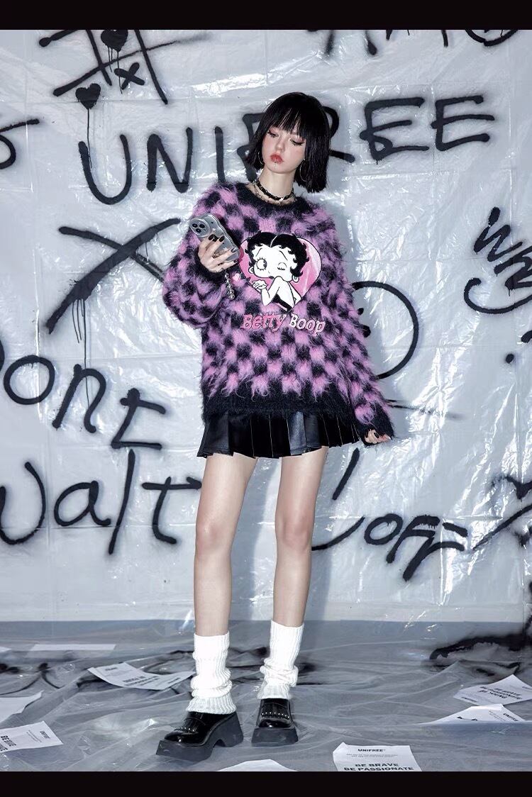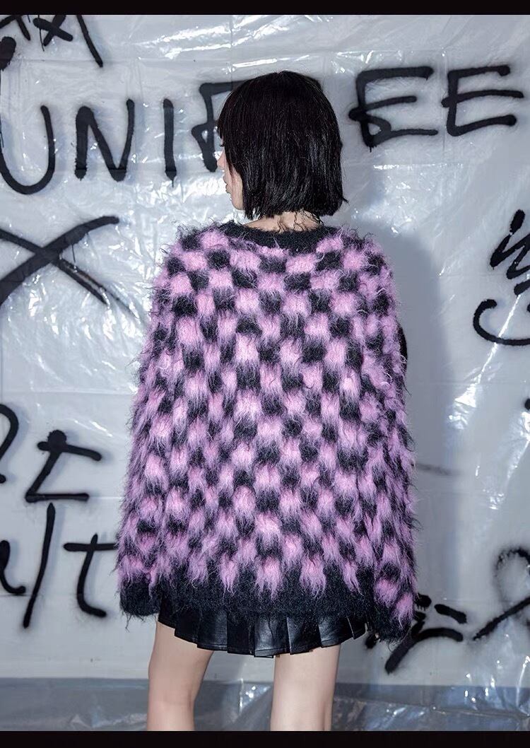 セーター ピンク チェック 黒 カーディガン ピンク アウター ジャケット コート フリース リボン ハート ピンク ゆったり ビッグシルエット オーバーサイズ ガーリー 原宿 渋谷 トップス ブルゾン ハイネック セーター