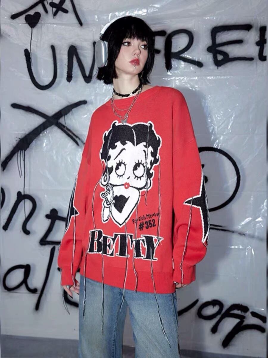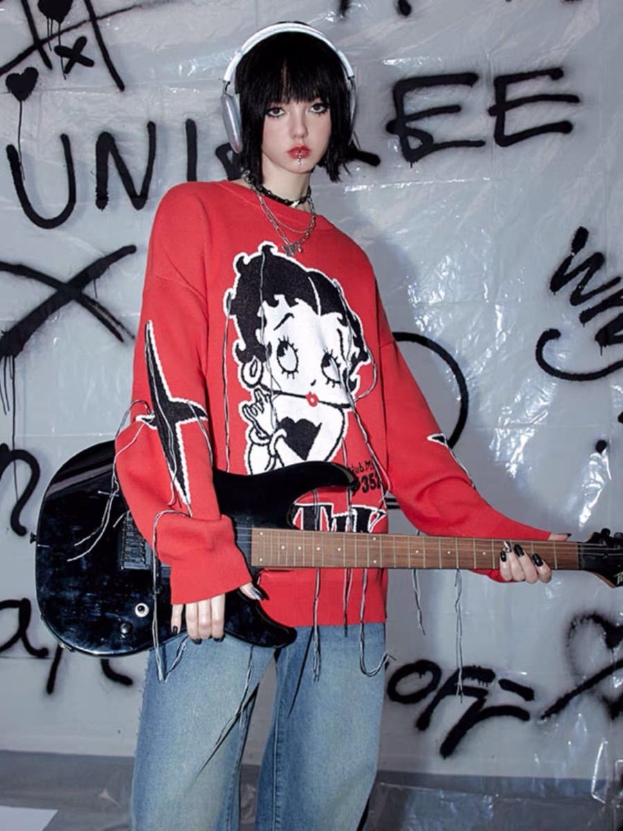 セーター ニット 赤 黒 ダメージ クラッシュ ロック カーディガン ピンク アウター ジャケット コート フリース リボン ハート ピンク ゆったり ビッグシルエット オーバーサイズ ガーリー 原宿 渋谷 トップス ブルゾン ハイネック セーター