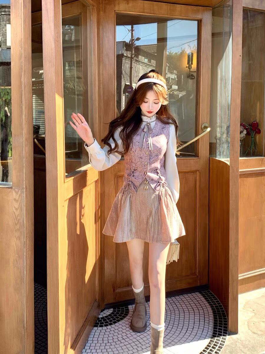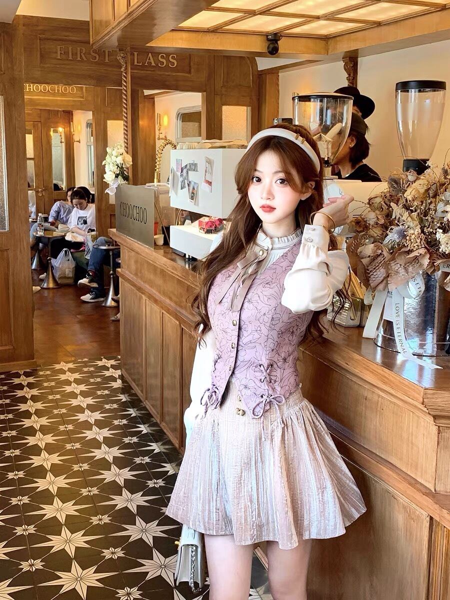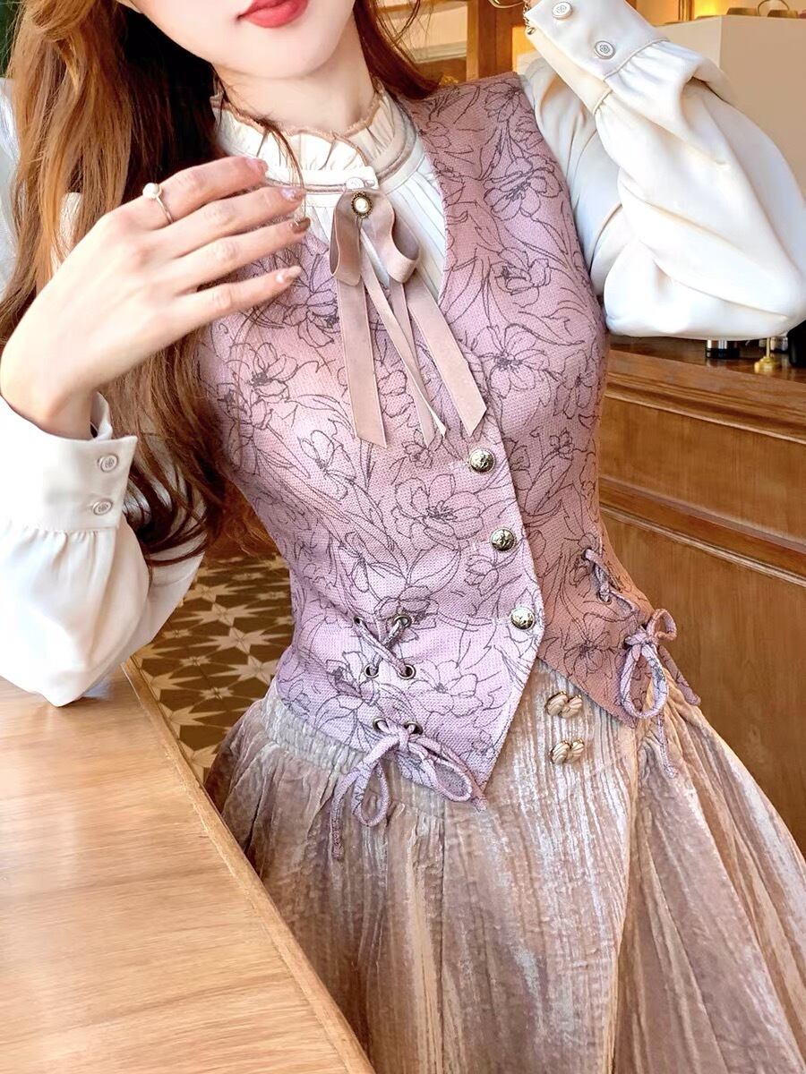 ベスト ガーリー お嬢様 ピンク 紫 花柄 リボン ベスト ニット ストリート 原宿 渋谷 黒 ピンク ピンク アウター トップス カーディガン ブルゾン スーツ ブラウス トップス アウター コート