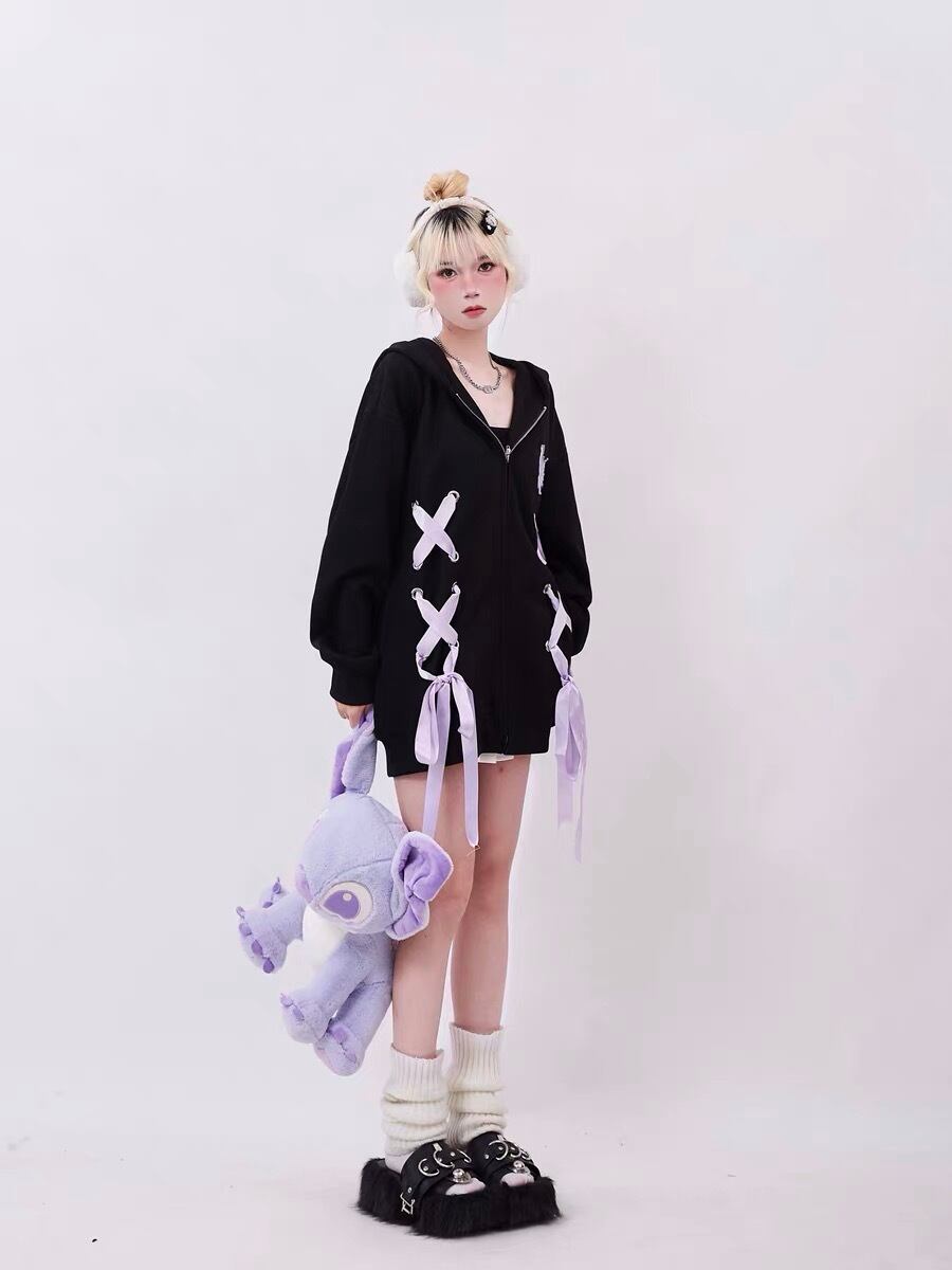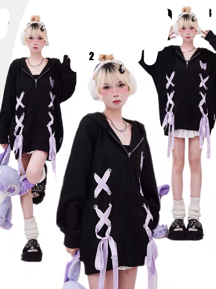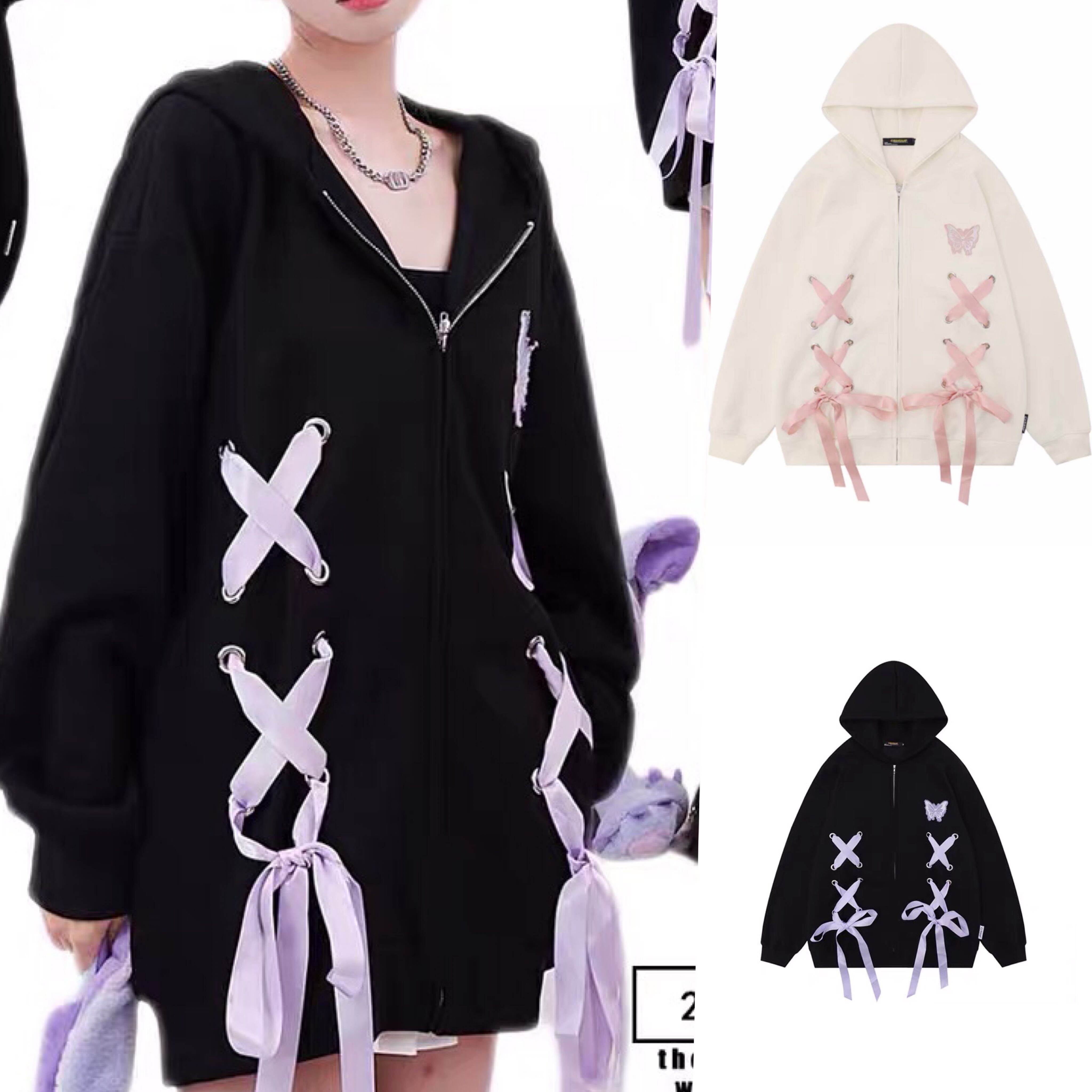 カーディガン ゆったり 紫 リボン カーディガン 白 黒 セーター ベスト ニット ストリート 原宿 渋谷 黒 ピンク ピンク アウター トップス カーディガン ブルゾン スーツ ブラウス トップス アウター コート
