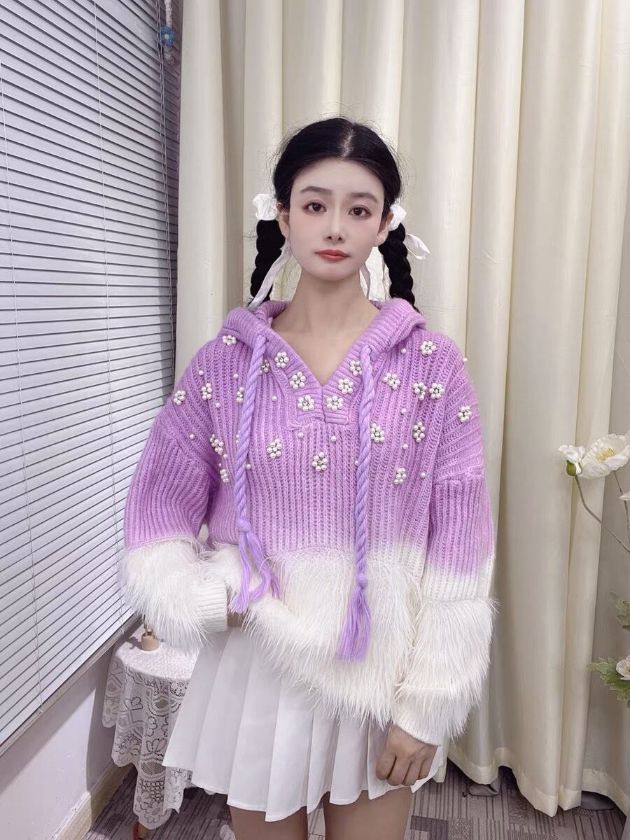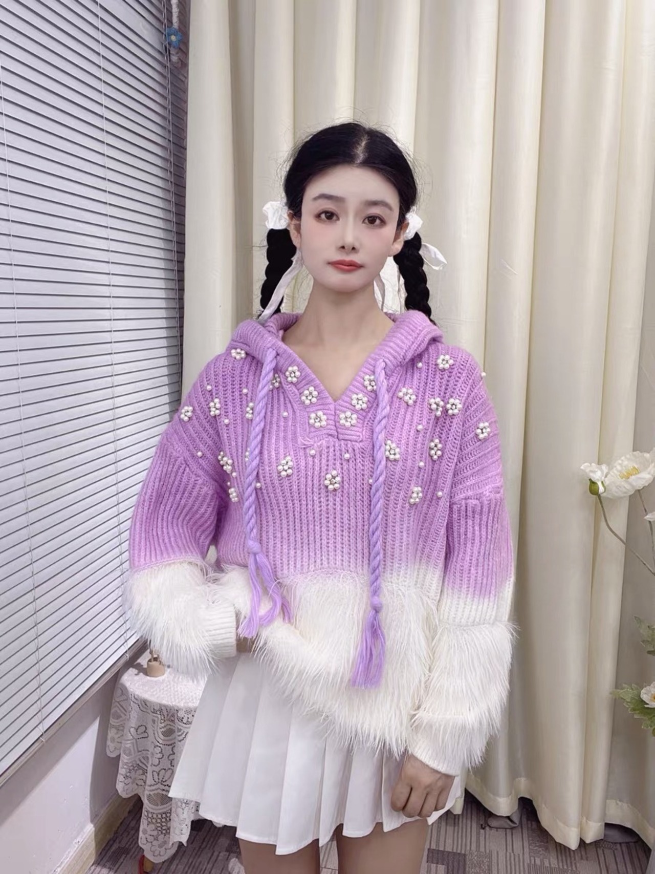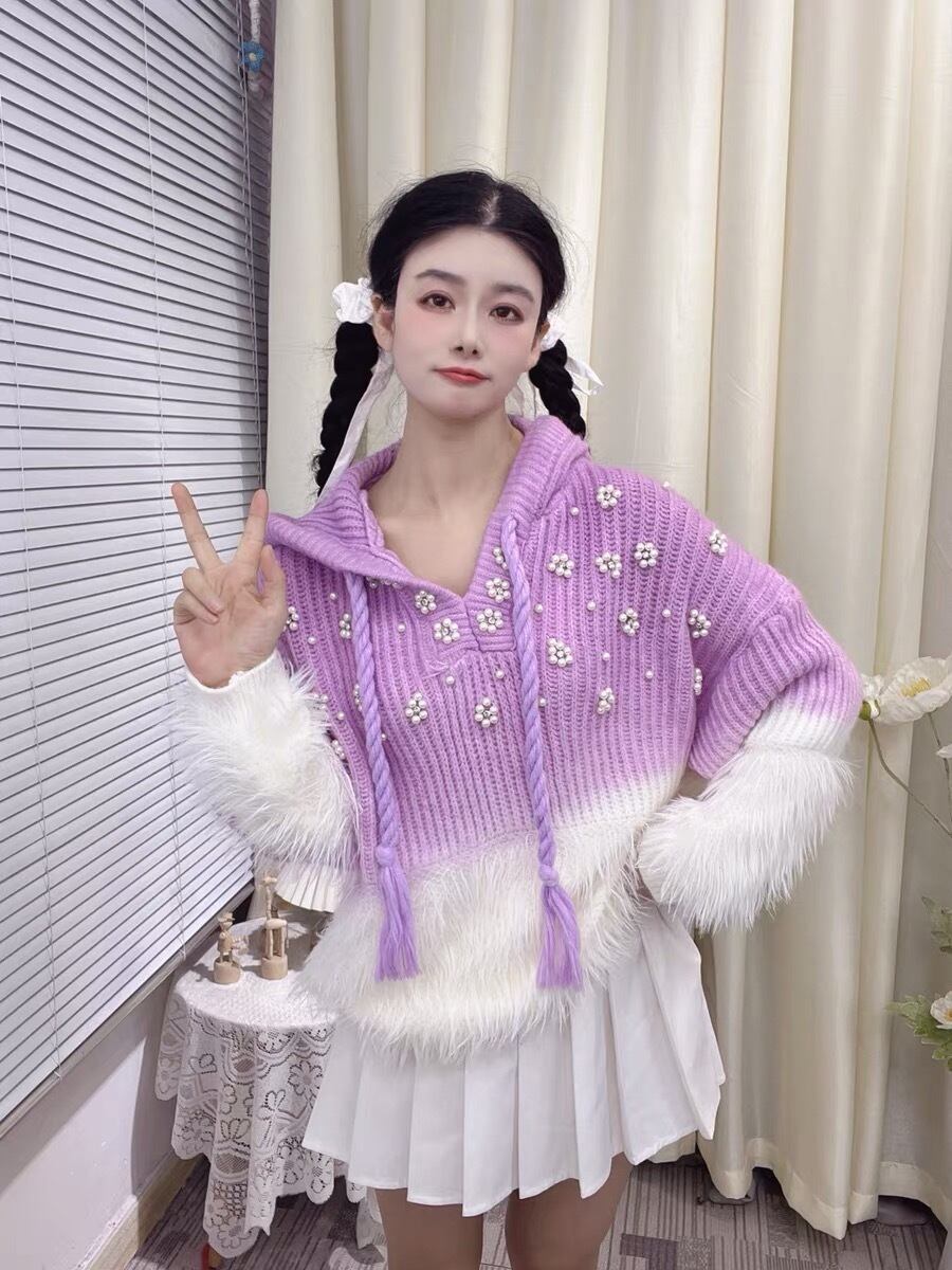 セーター グラデーション 紫 緑 黄色 パーカー コート シンプル デコレーション 白 黒 フリル チェック 赤 茶色 アウター ジャケット ブルゾン カーディガン トレーナー スウェット ガーリー 姫 可愛い ミニ リボン プリーツ プリーツ レザー ガーリー ロリータ 原宿 渋谷 リボン 襟 ニット セーター 白 パール