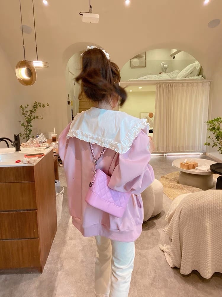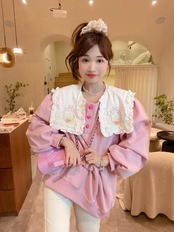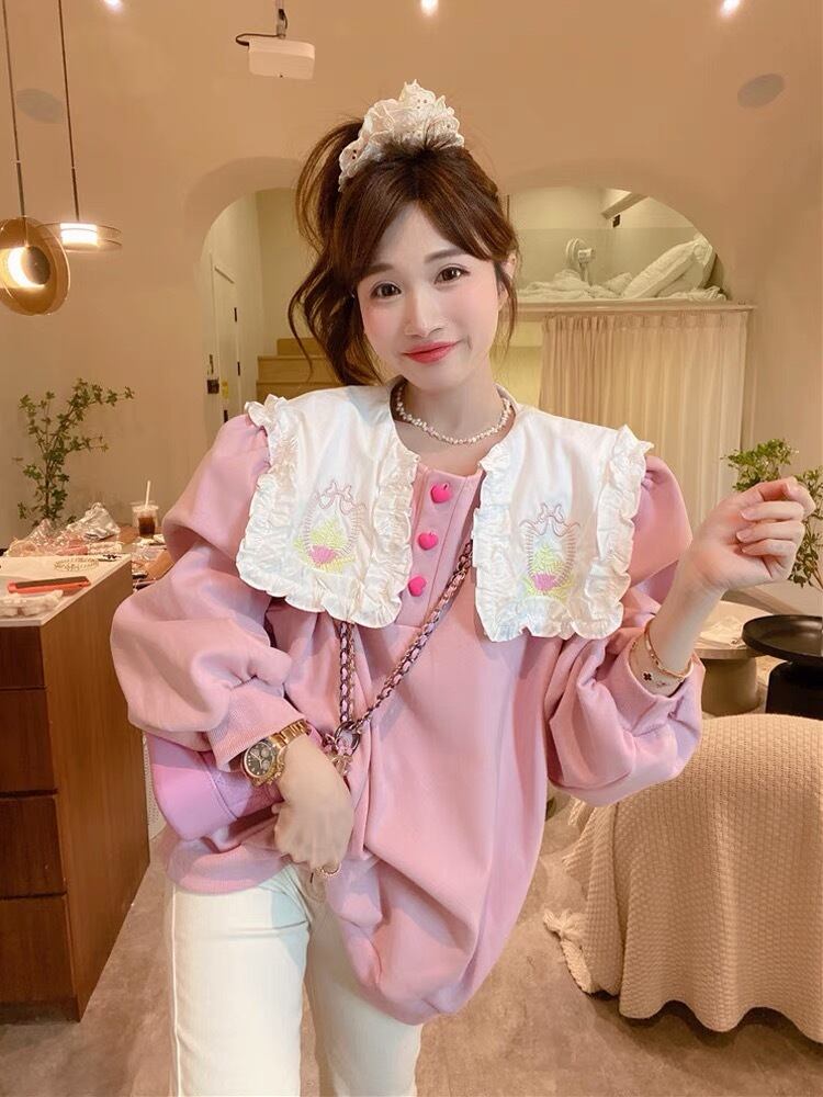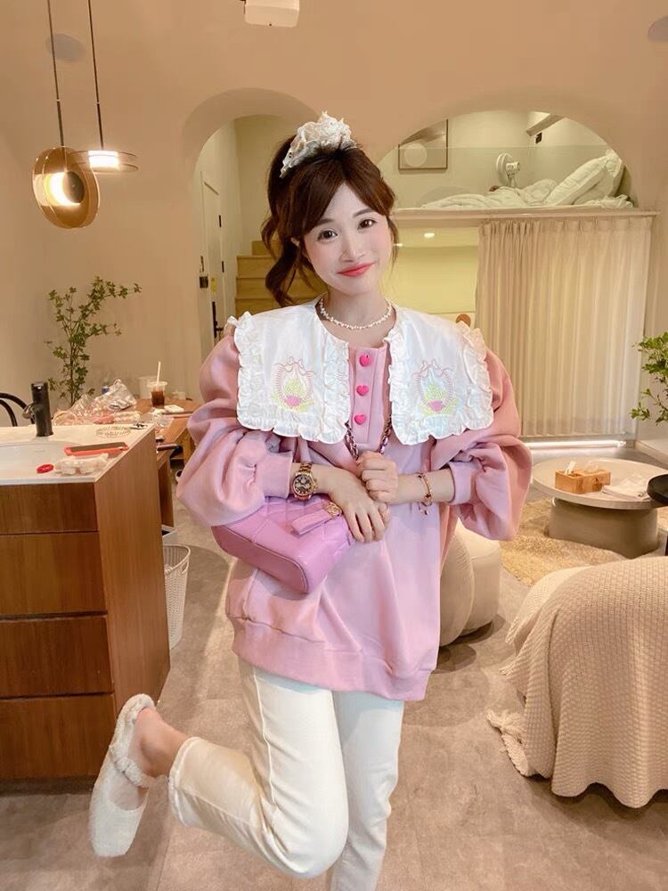 トレーナー ピンク 襟 デカ スウェット ルームウェア パーカー カジュアル ブラウス コート シンプル デコレーション 白 黒 フリル チェック 赤 茶色 アウター ジャケット ブルゾン カーディガン トレーナー スウェット ガーリー 姫 可愛い ミニ リボン プリーツ プリーツ レザー ガーリー ロリータ 原宿 渋谷 リボン 襟