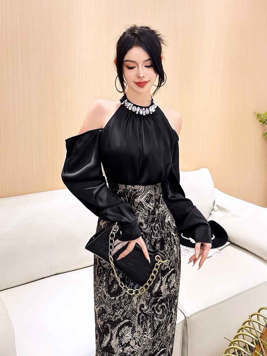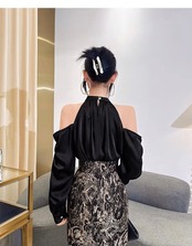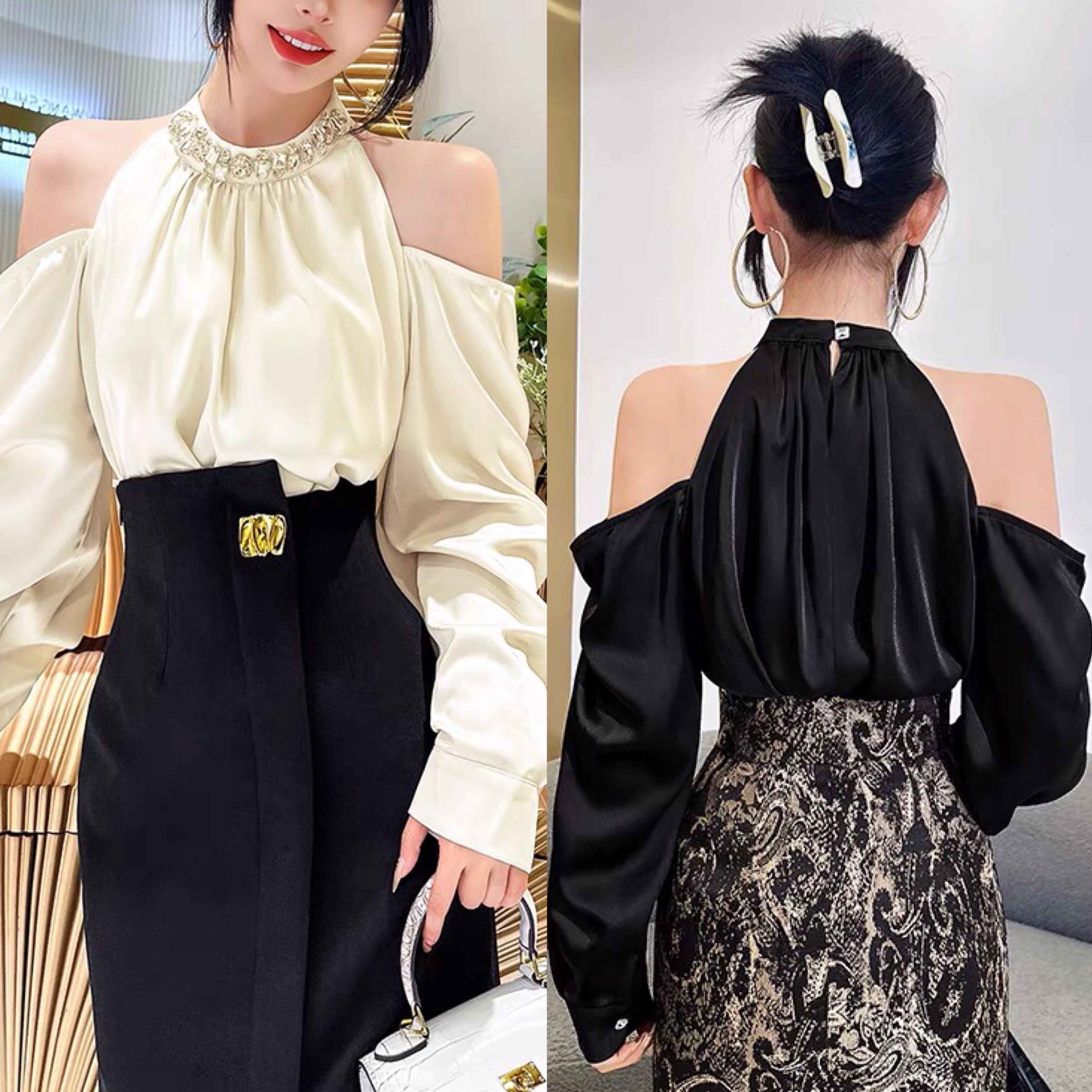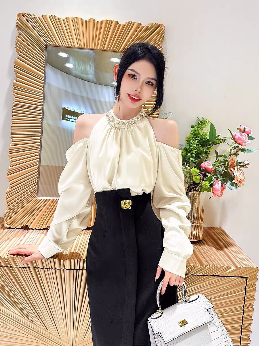 ブラウス 白 エレガント オフショルダー 黒 トップス セクシー ブラウス 黒 ブラック シャツ エレガント カッコいい ゴージャス ゴールド チェック ボーダー トップス 六本木 銀座 お嬢様 表参道 ブラック 黒 モード