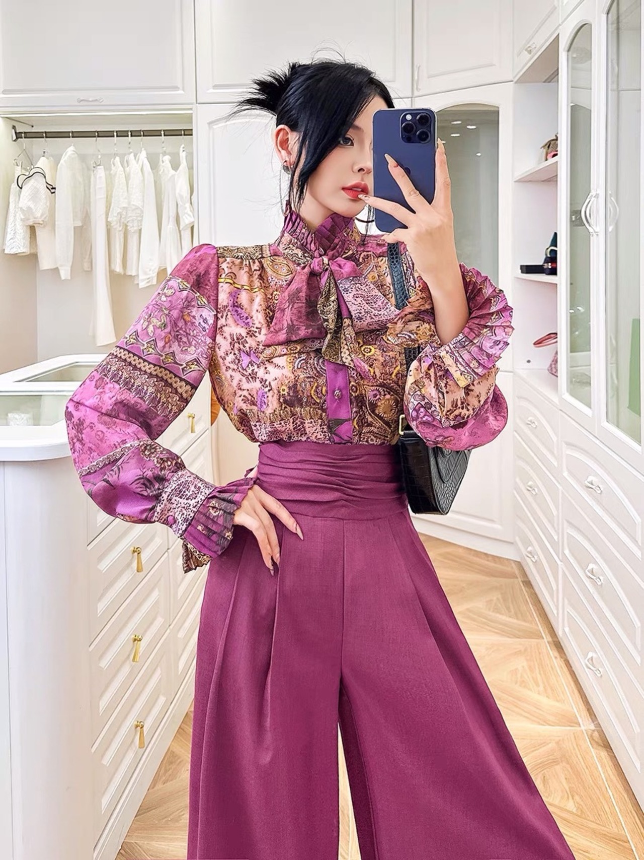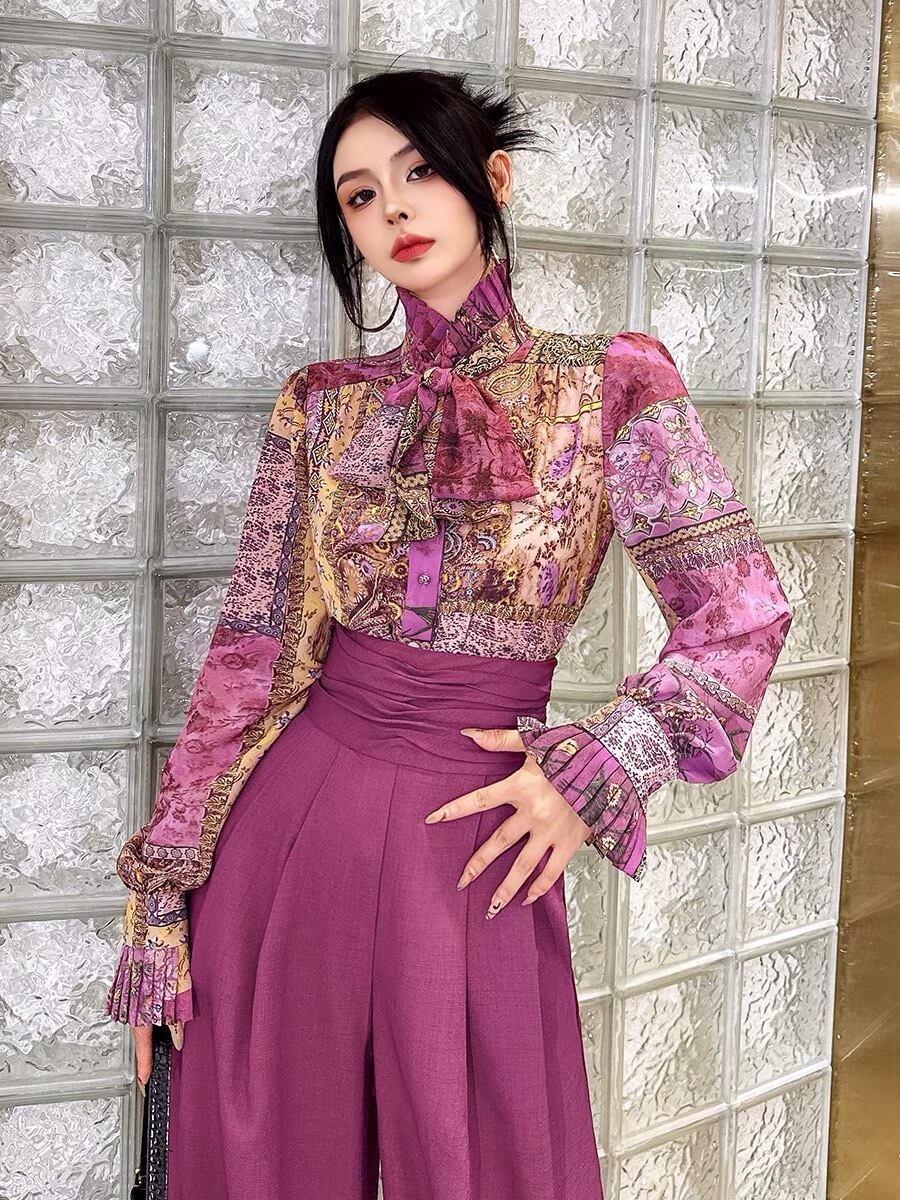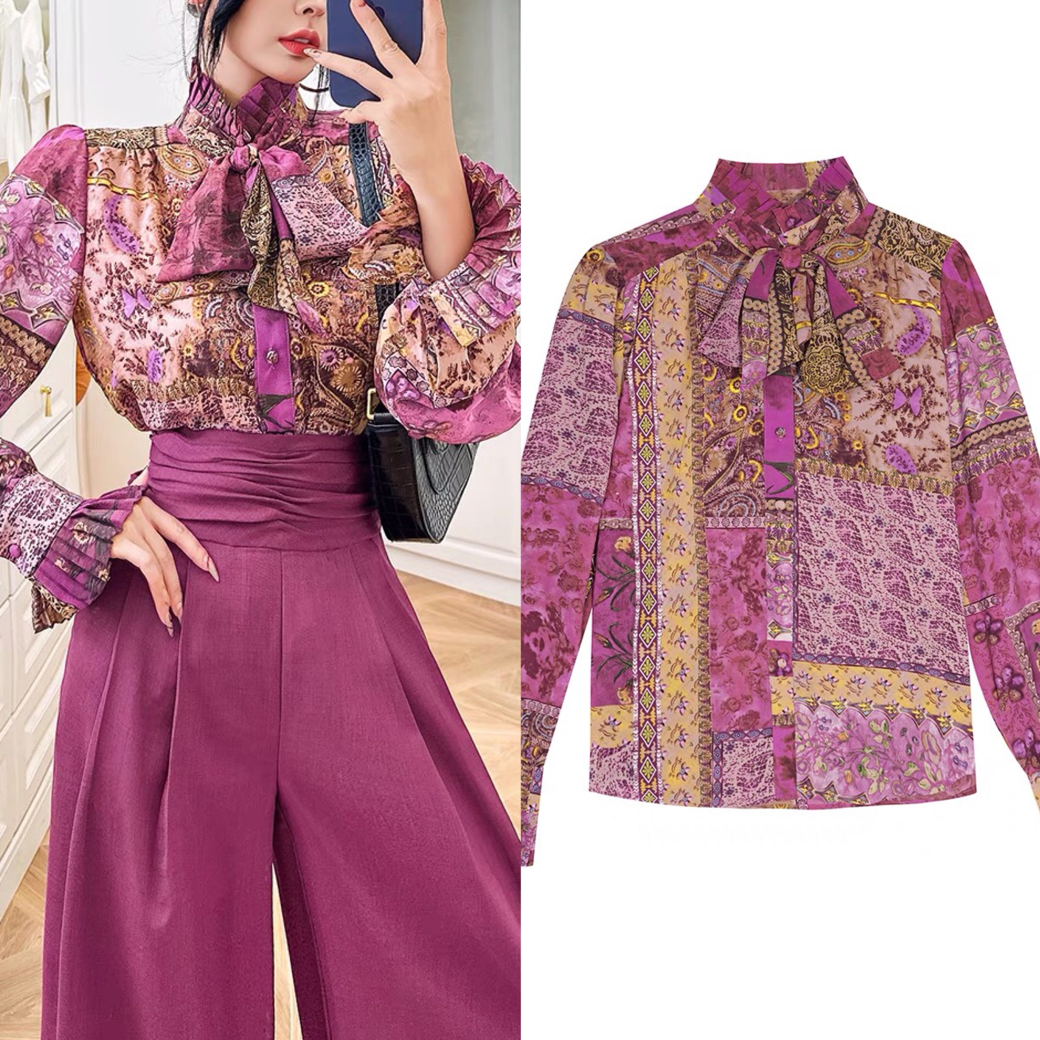 ブラウス 紫 パープル 花柄 フラワー エレガント ブラウス 黒 ブラック シャツ エレガント カッコいい ゴージャス ゴールド チェック ボーダー トップス 六本木 銀座 お嬢様 表参道 ブラック 黒 モード