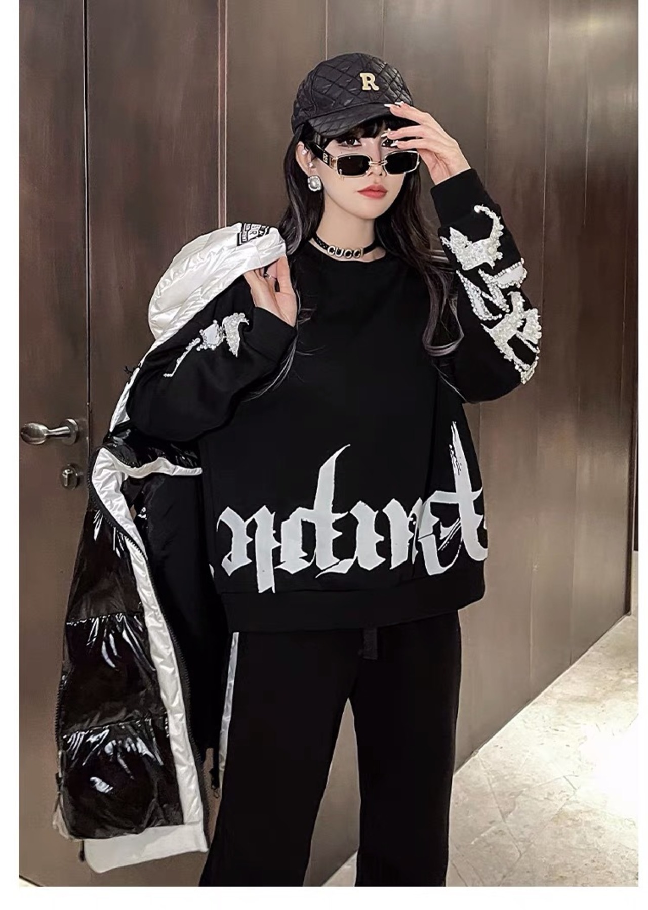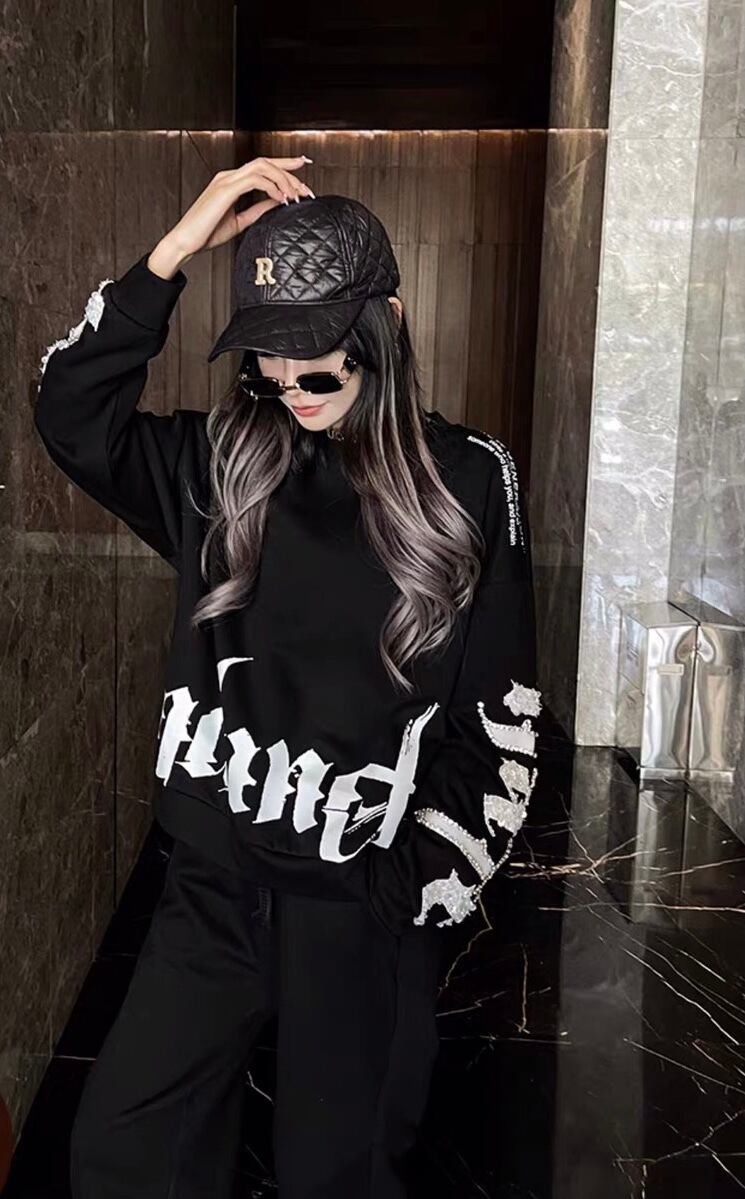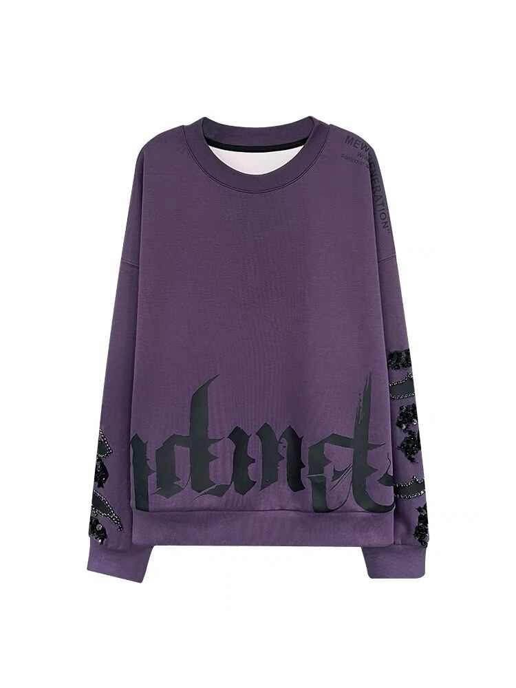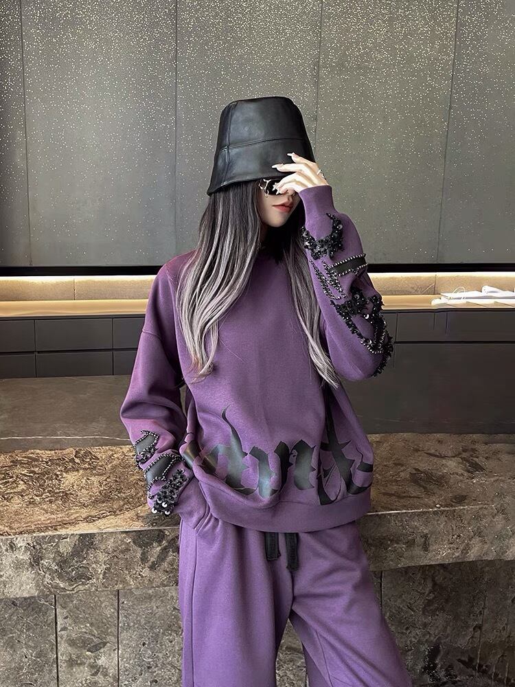 スウェット パーカー トレーナー デコレーション パール ラインストーン ストリート 黒 紫 原宿 渋谷 ギャル ブラウス 黒 ブラック シャツ エレガント カッコいい ゴージャス ゴールド チェック ボーダー トップス 六本木 銀座 お嬢様 表参道 ブラック 黒 モード