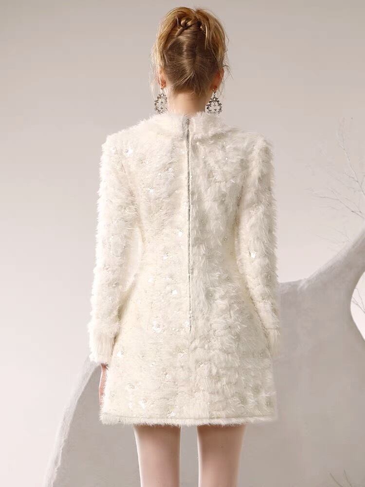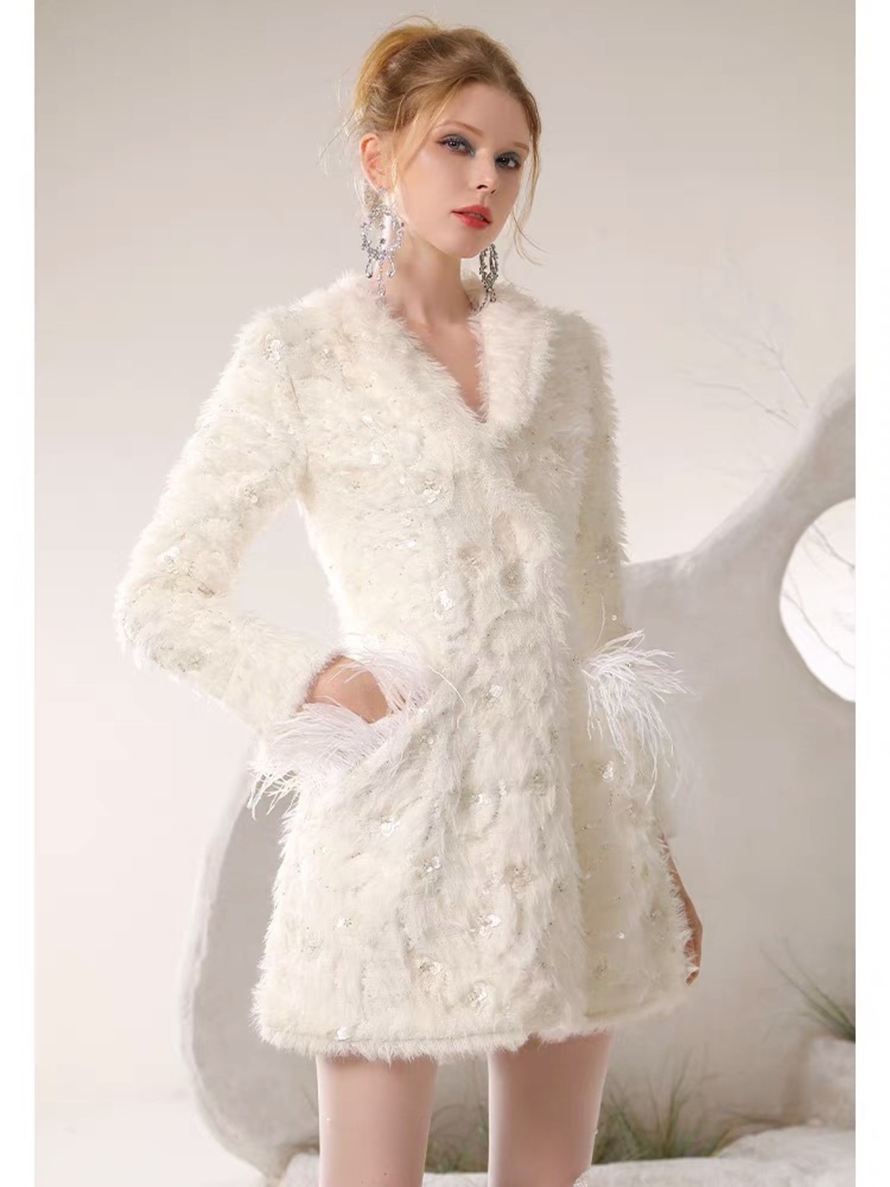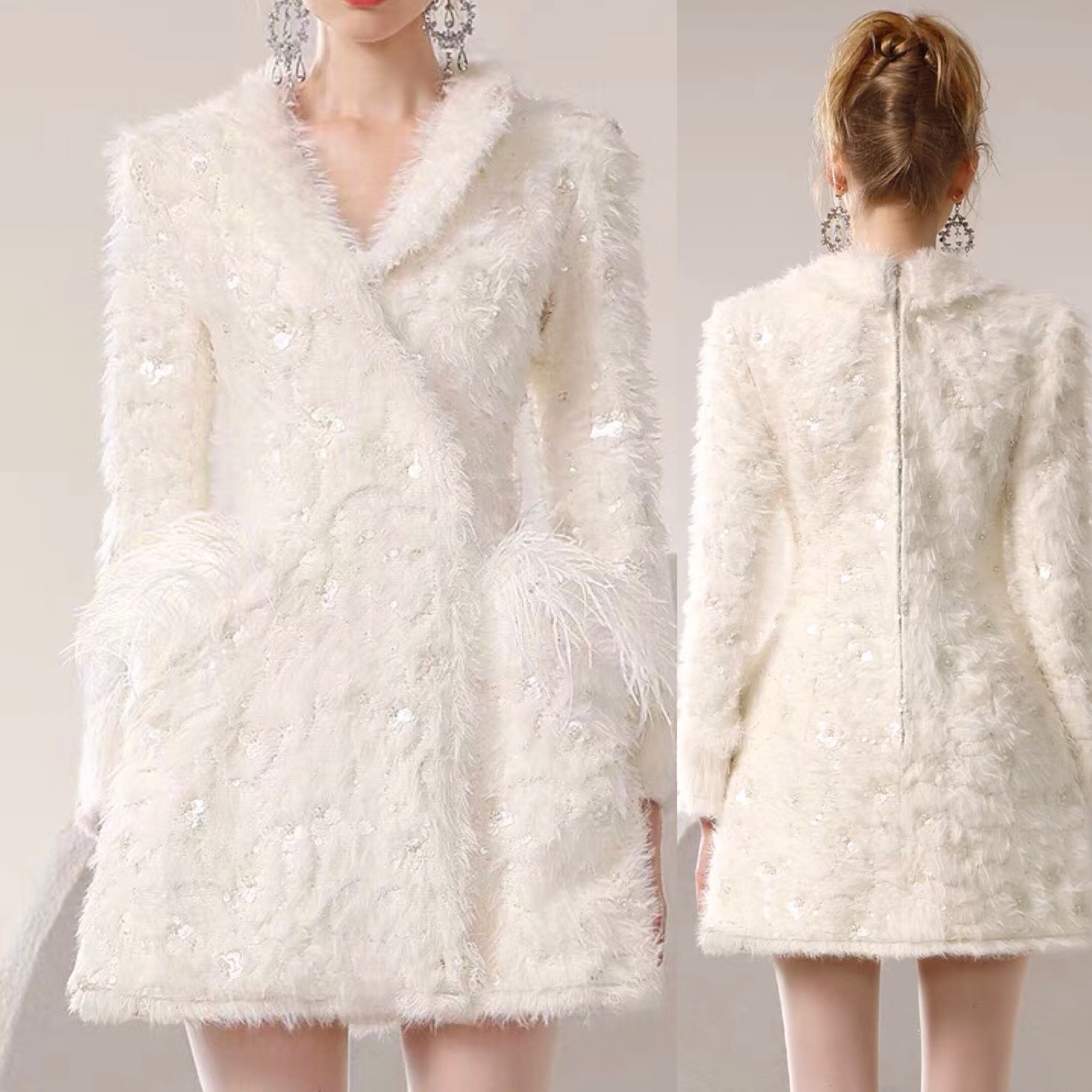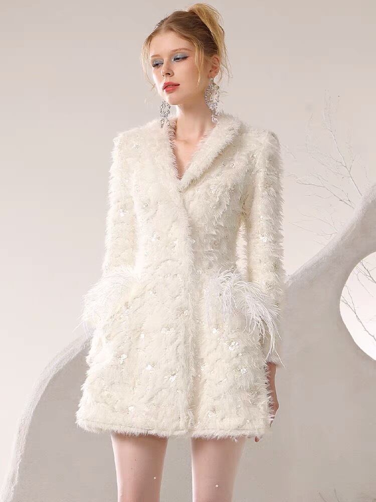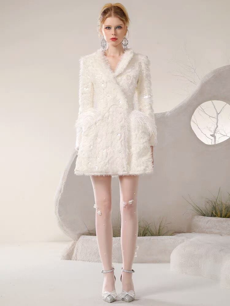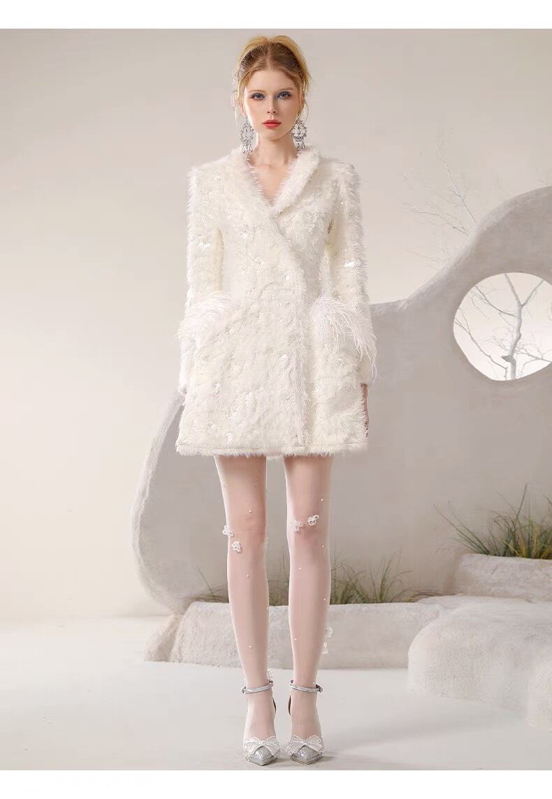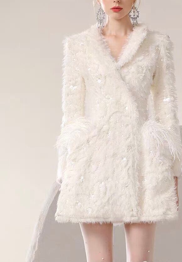 アウター 白 ホワイト コート ジャケット ブルゾン アウター ワンピース エレガント デニム カメリア ゴージャス 銀座 表参道 ドレス お嬢様 ガーリー 姫 パーティー ゴージャス ファー 羽根