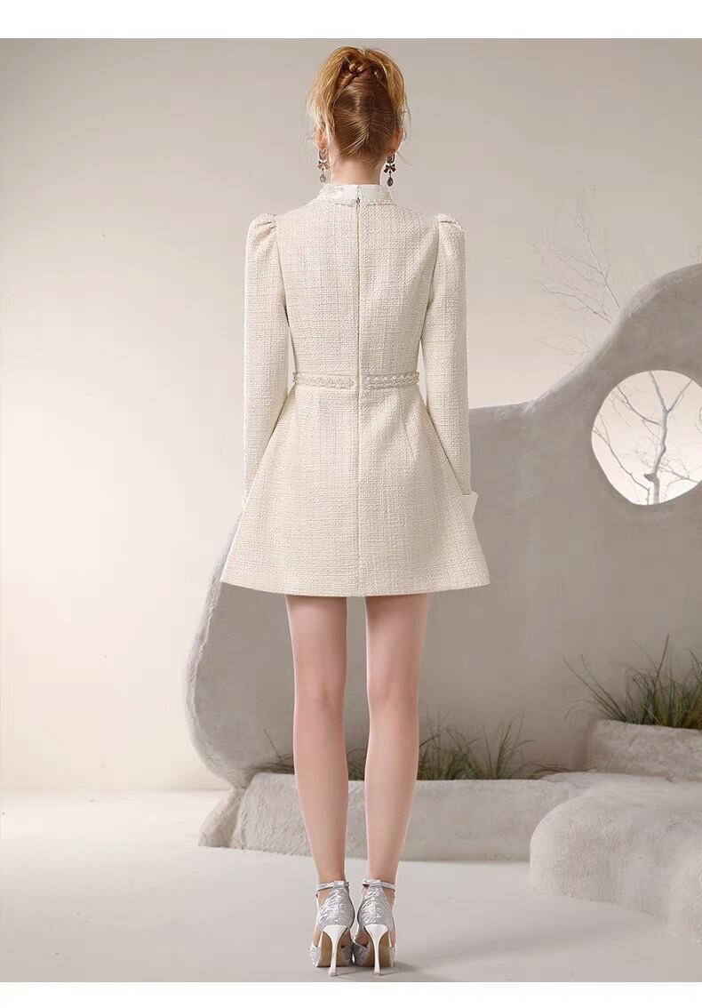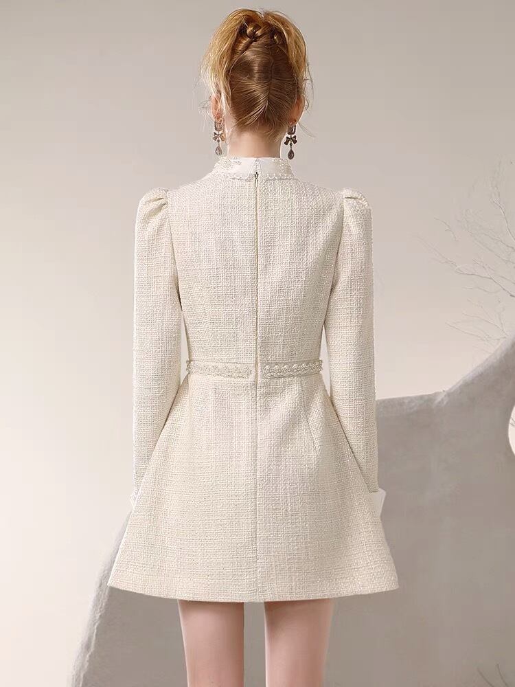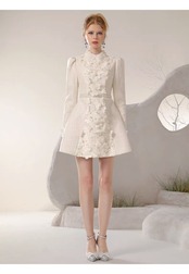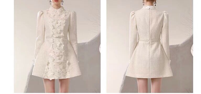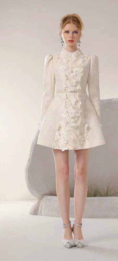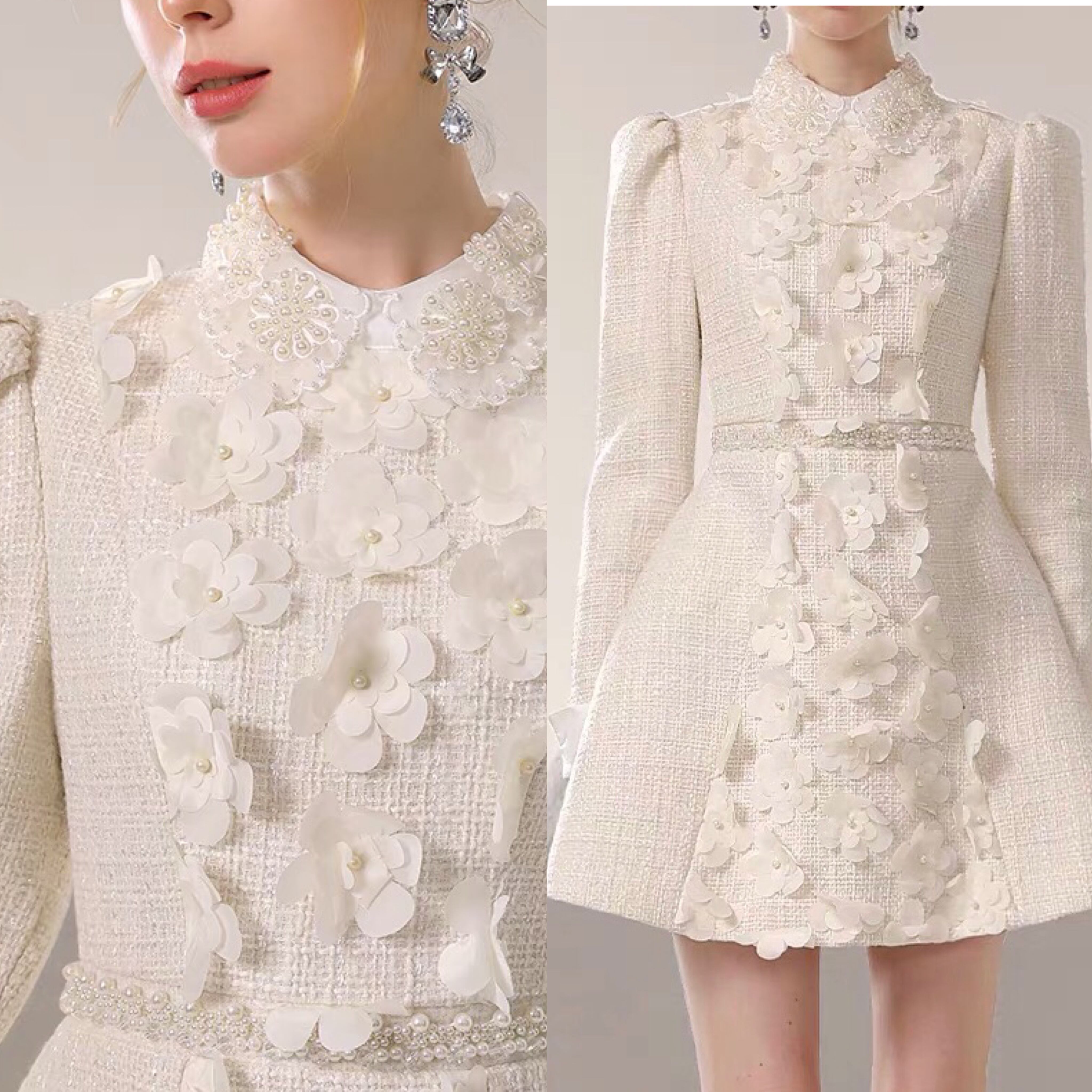 ワンピース ホワイト 白 花柄 フラワー ワンピース エレガント デニム カメリア ゴージャス 銀座 表参道 ドレス お嬢様 ガーリー 姫 パーティー ゴージャス ハイネック