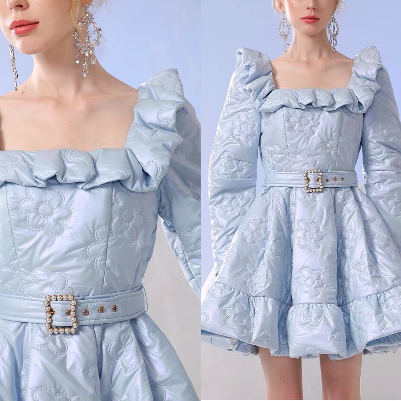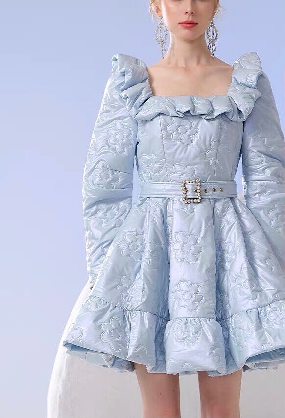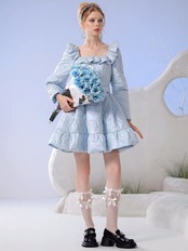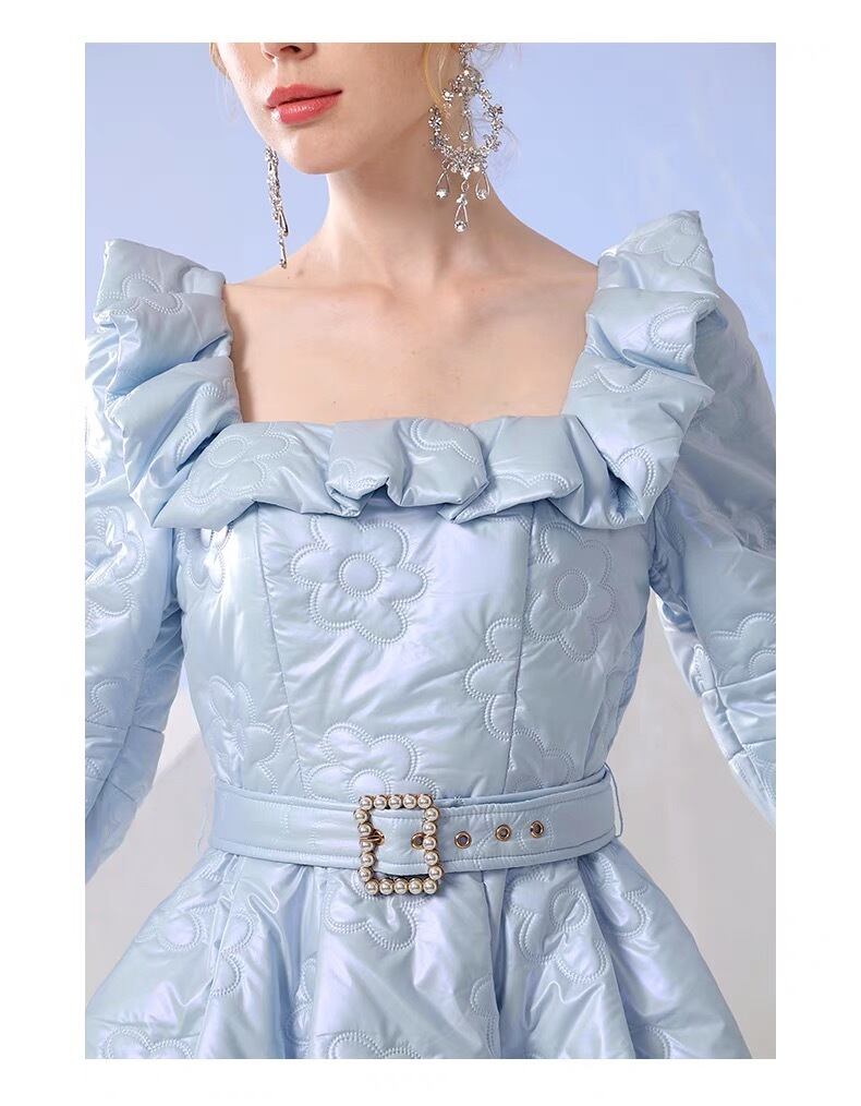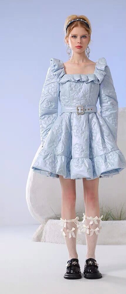 ワンピース 水色 リボン フリル スカート ワンピース エレガント デニム カメリア ゴージャス 銀座 表参道 ドレス お嬢様 ガーリー 姫 パーティー ゴージャス