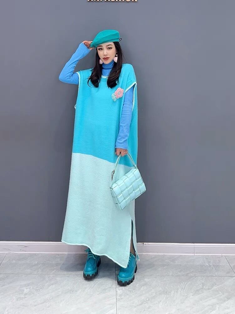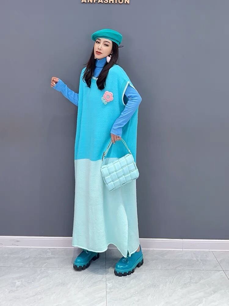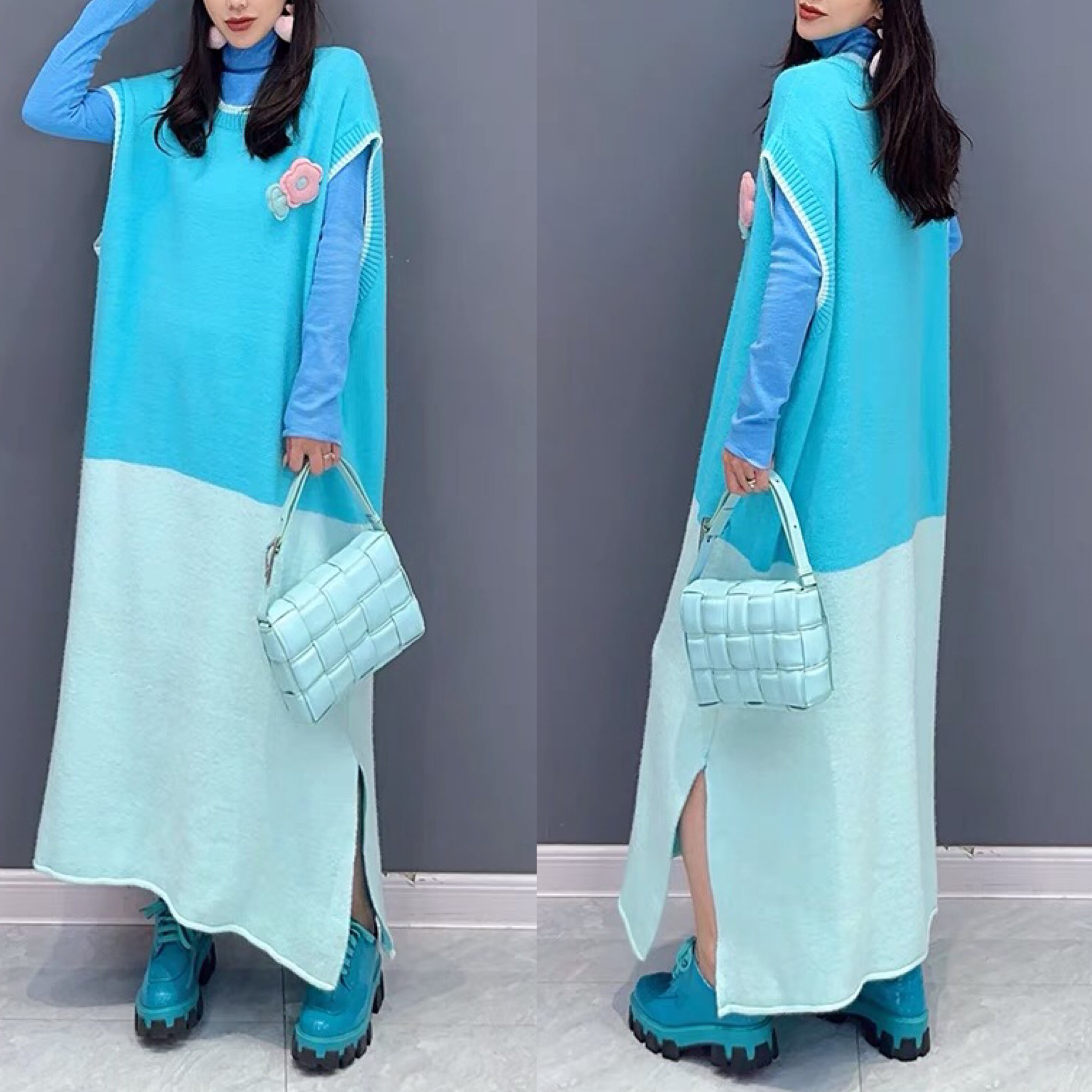 ベスト ニット ワンピース 水色 バイカラー グラデーション オーバーサイズ ゆったり XL シャツ トップス カジュアル ブラウス スカート カーディガン セーター