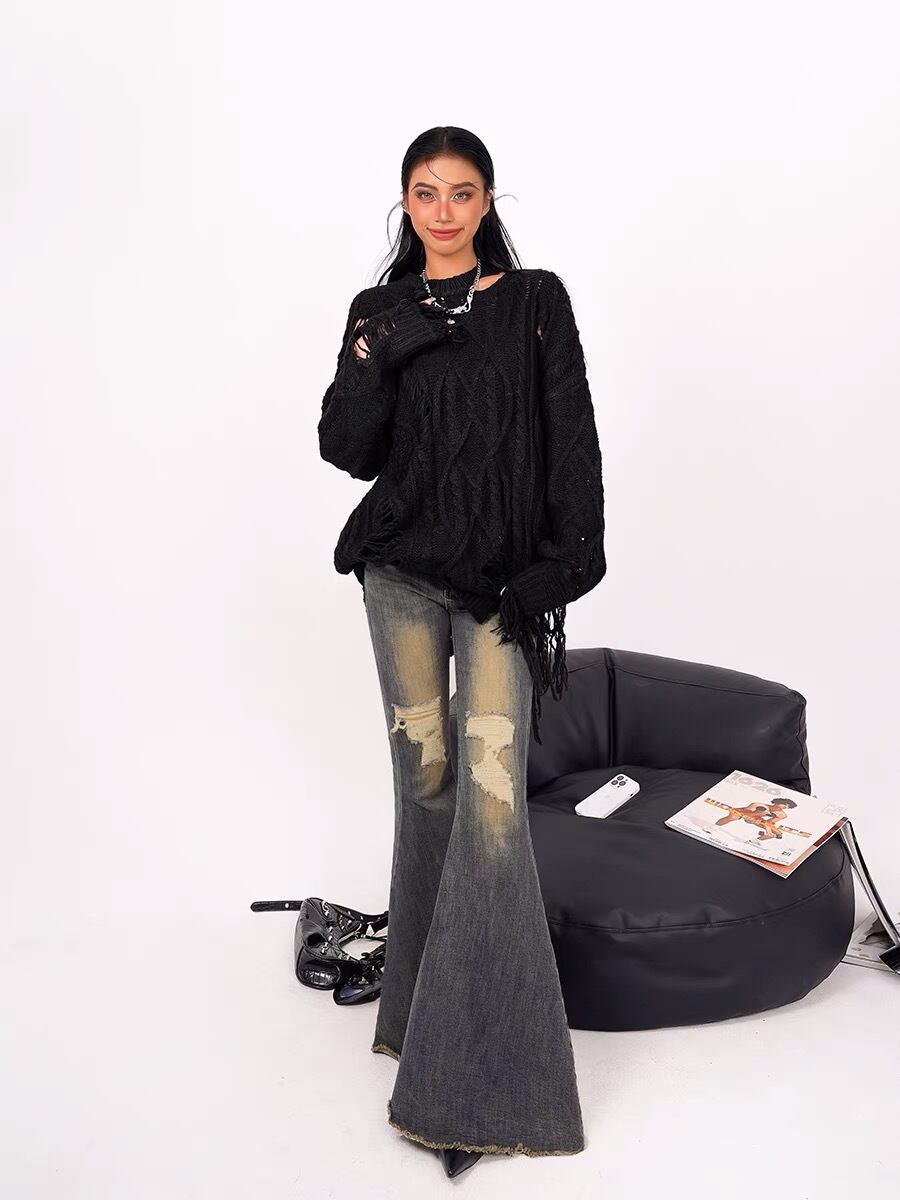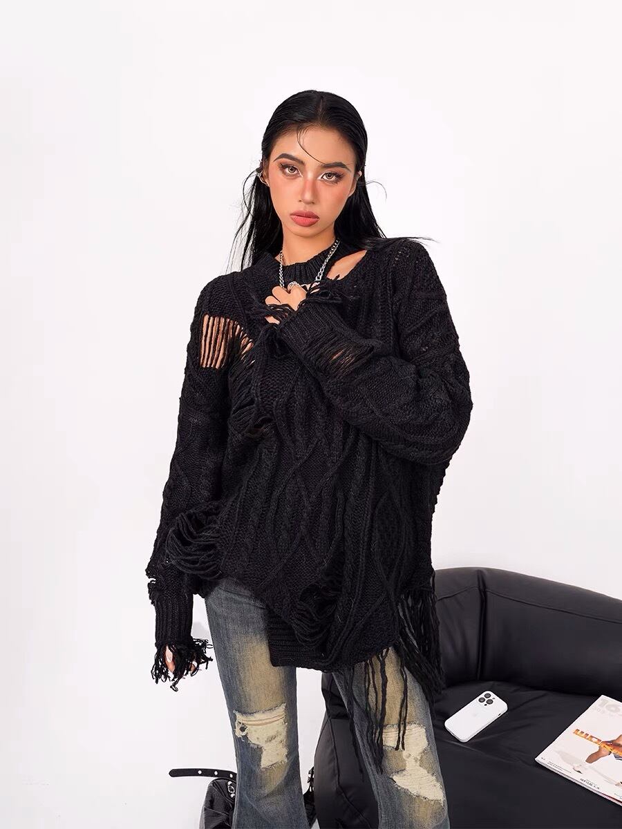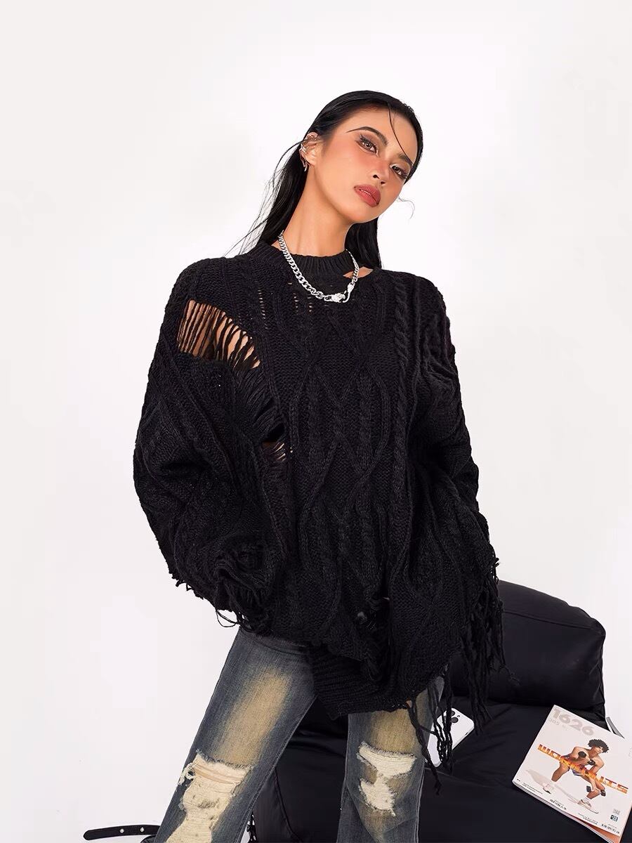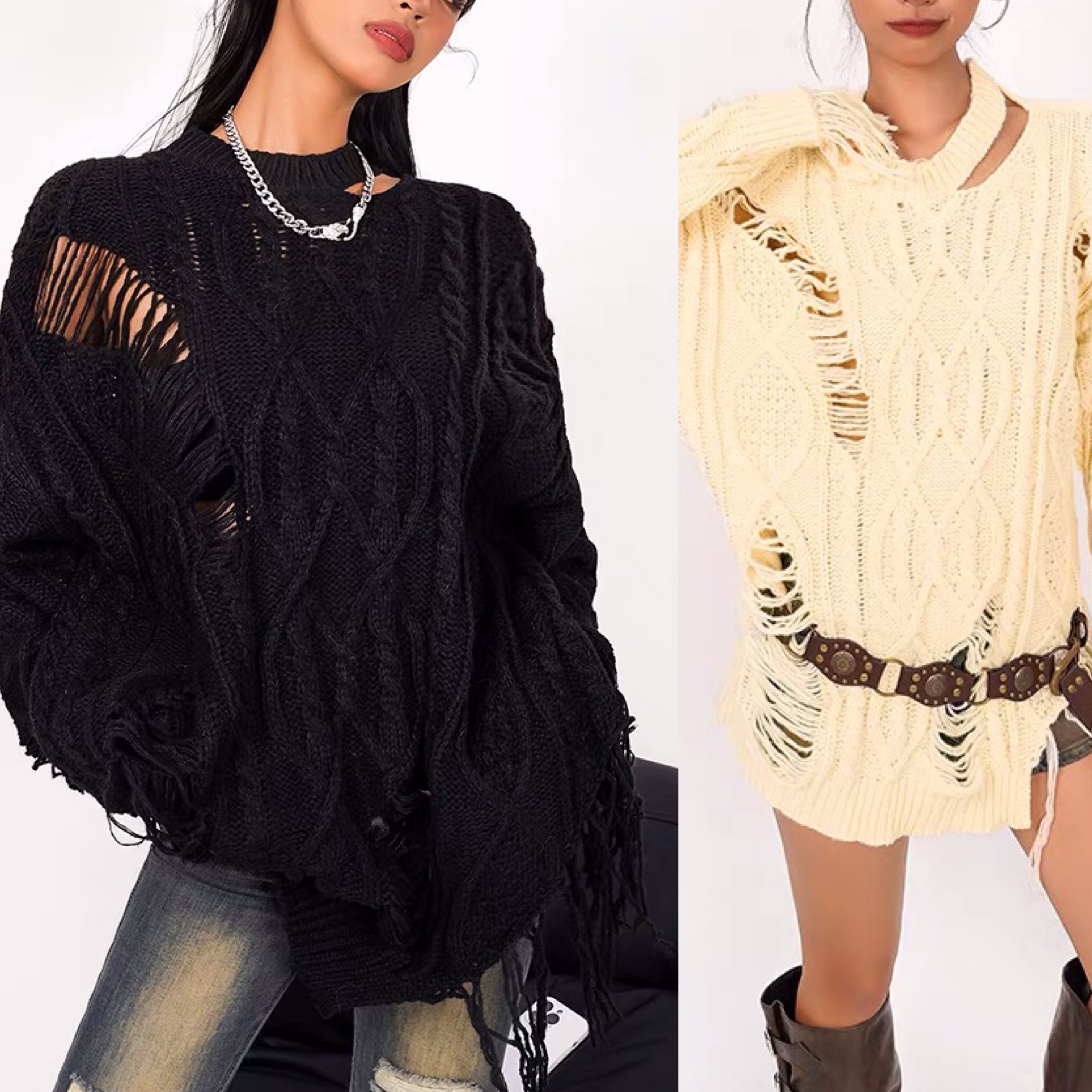 セーター 黒 ベージュ 白 ダメージ ストリート ニット カーディガン