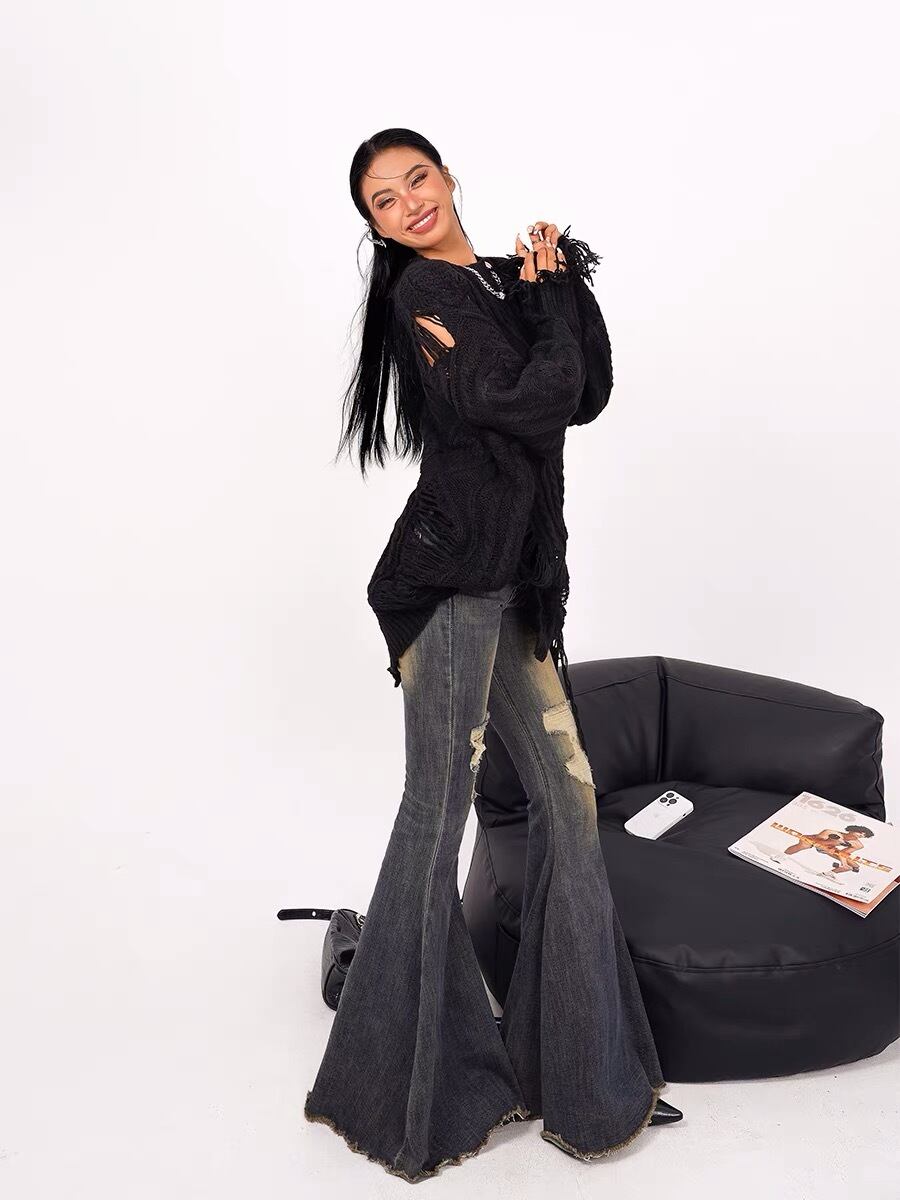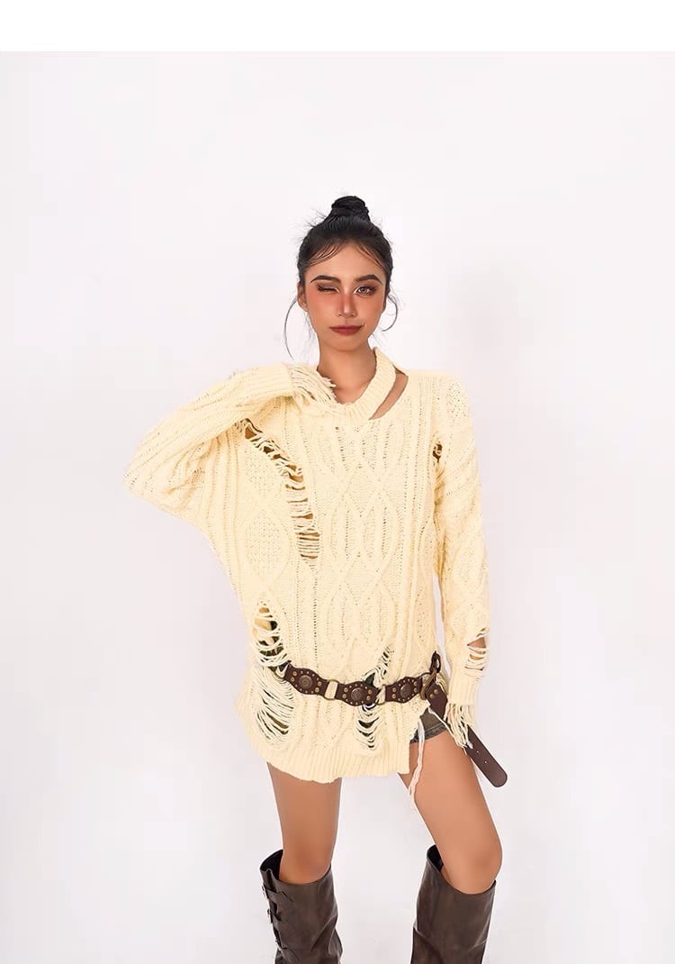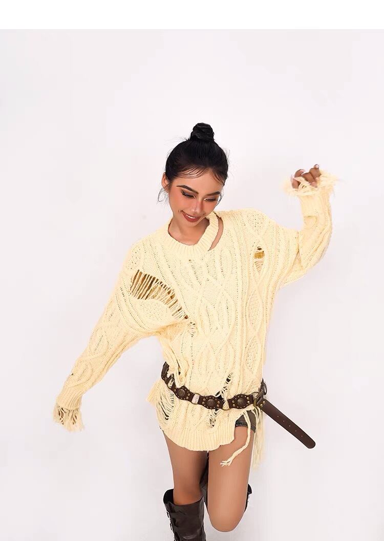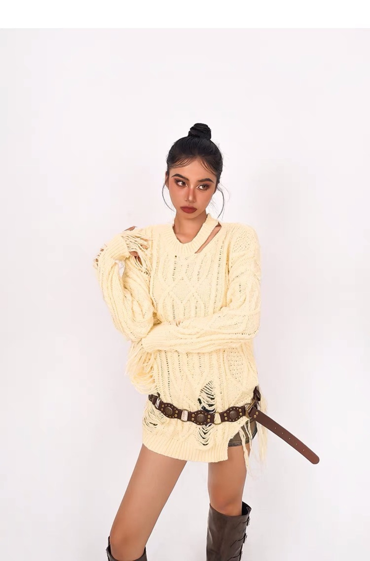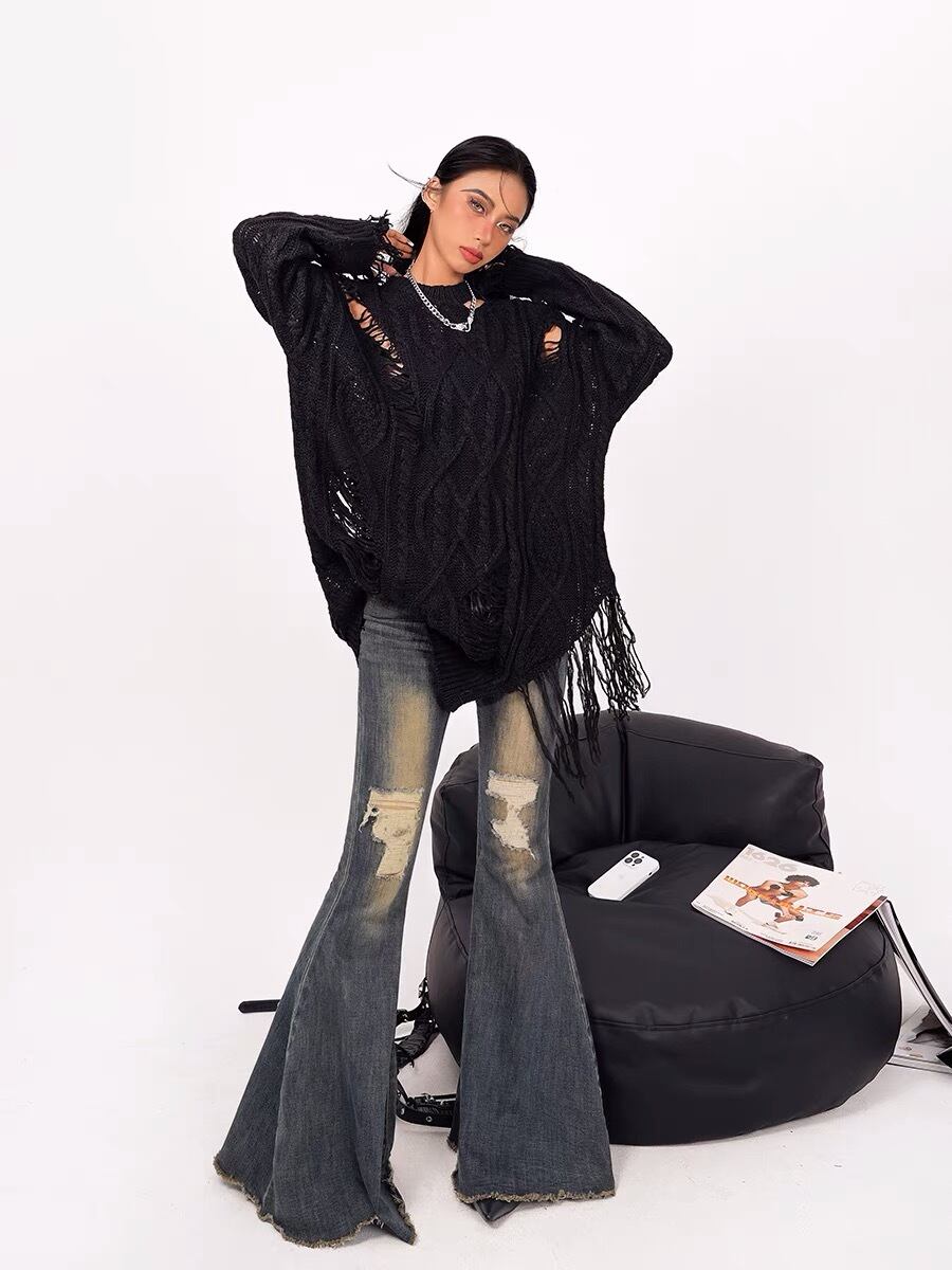 セーター 黒 ベージュ 白 ダメージ ストリート ニット カーディガン