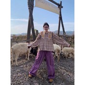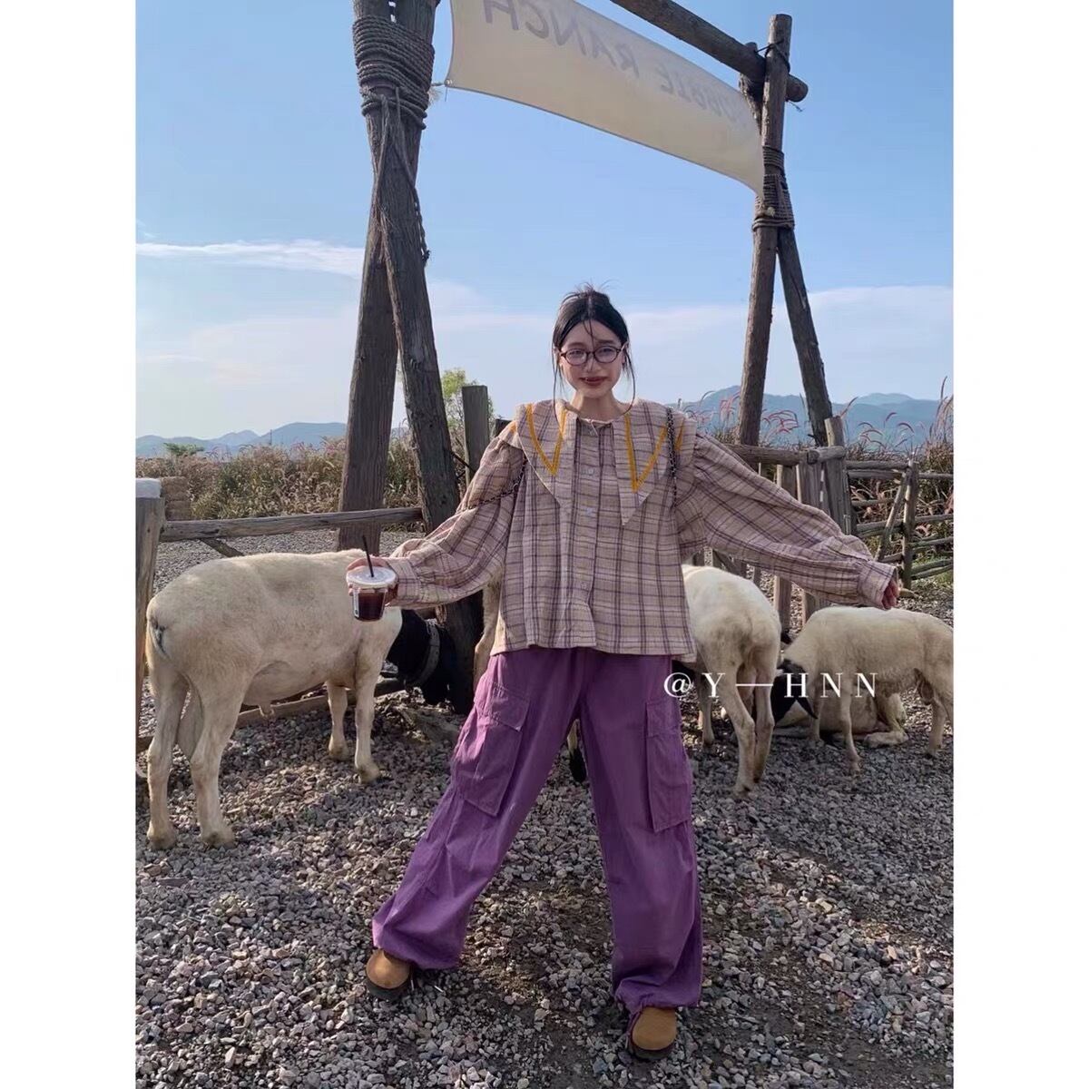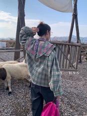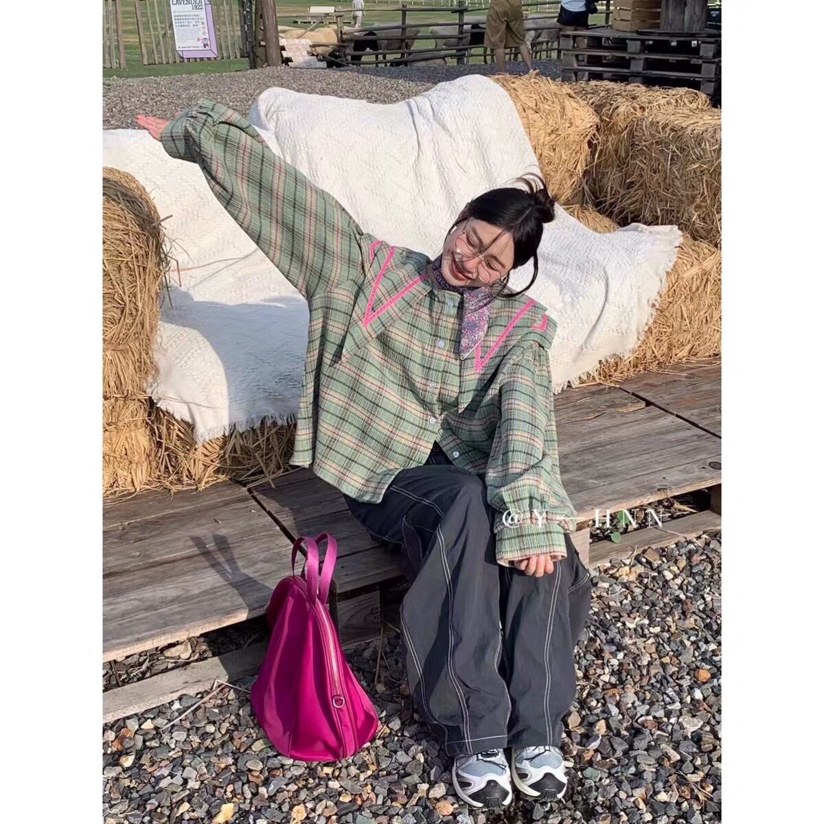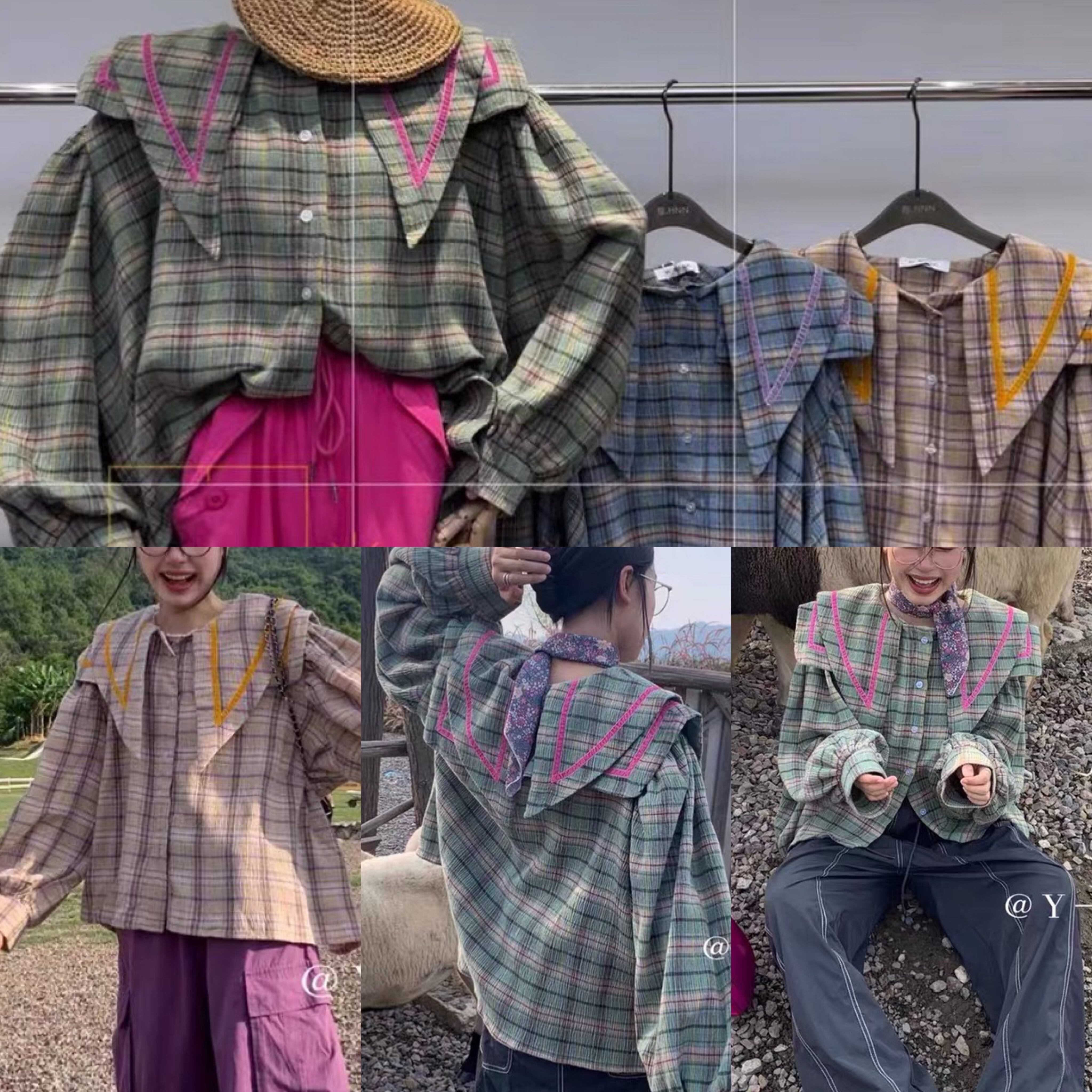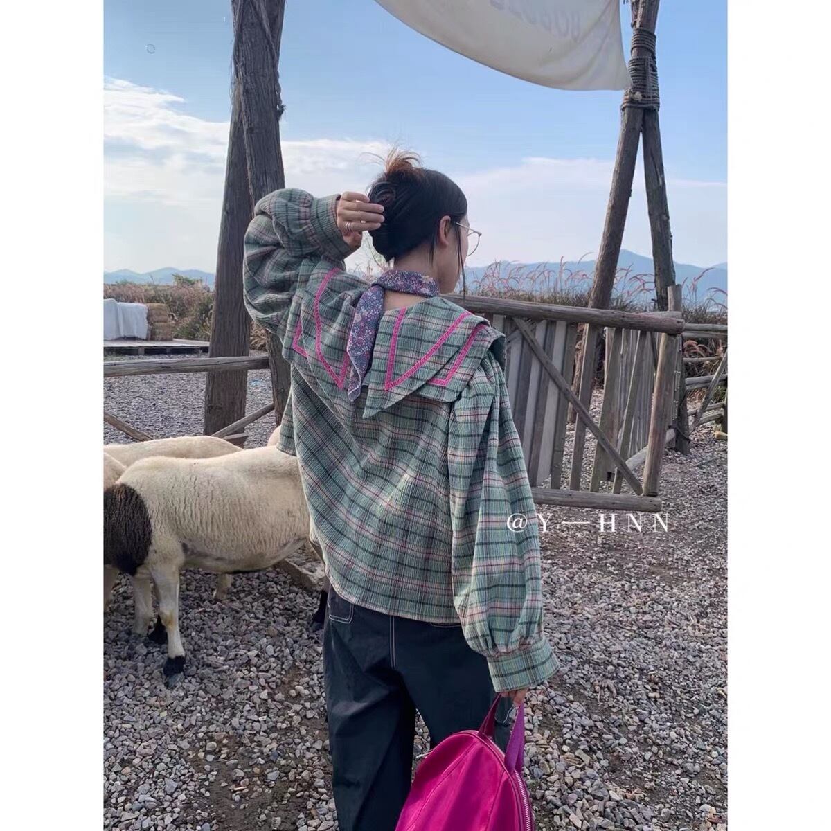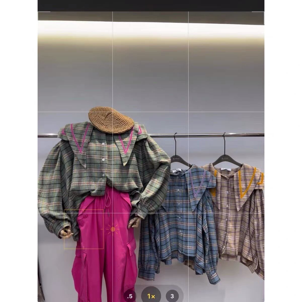 ブラウス チェック 水色 緑 襟 ネルシャツ カジュアル トップス