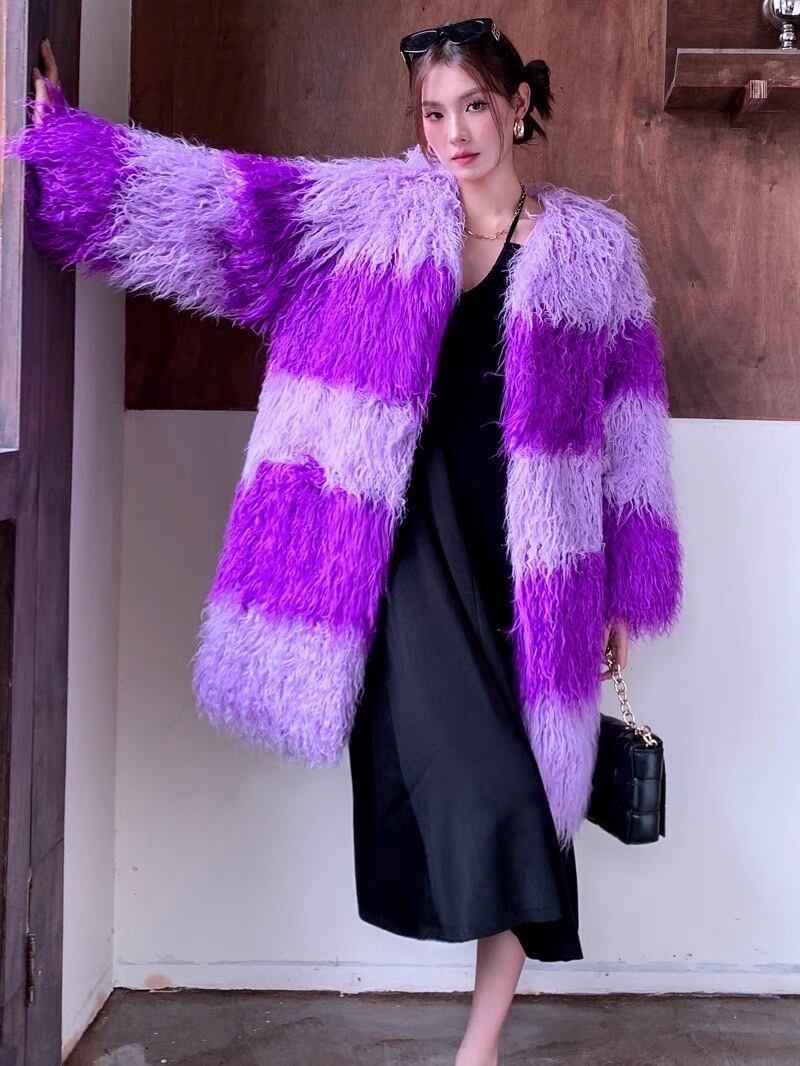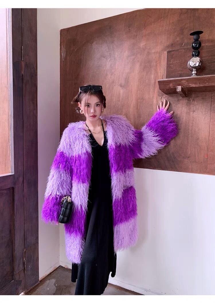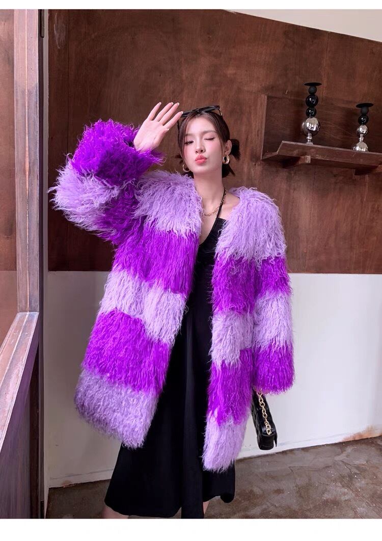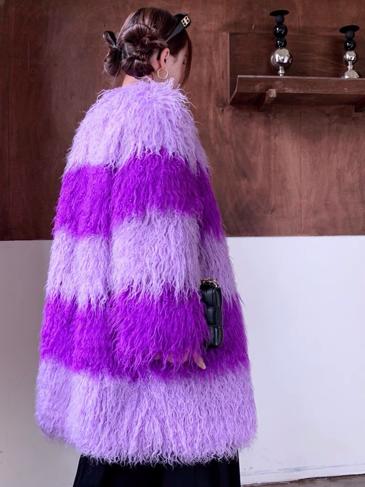 ボーダー グラデーション 紫 パープル ファー コート ゴージャス アウター ジャケット ブルゾン カーディガン コート ロング ゴージャス ガーリー エレガント お嬢様 パーティー セレブ フード パーカー ギャル 銀座 原宿 渋谷 表参道