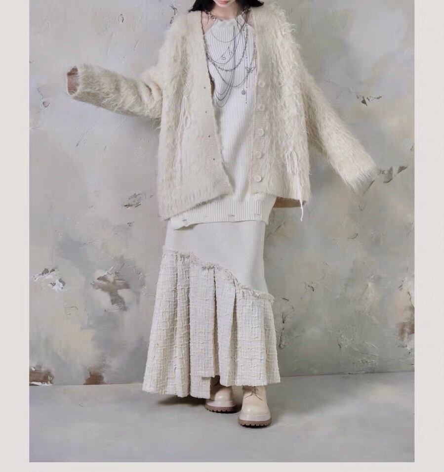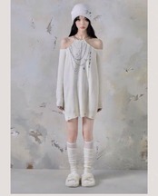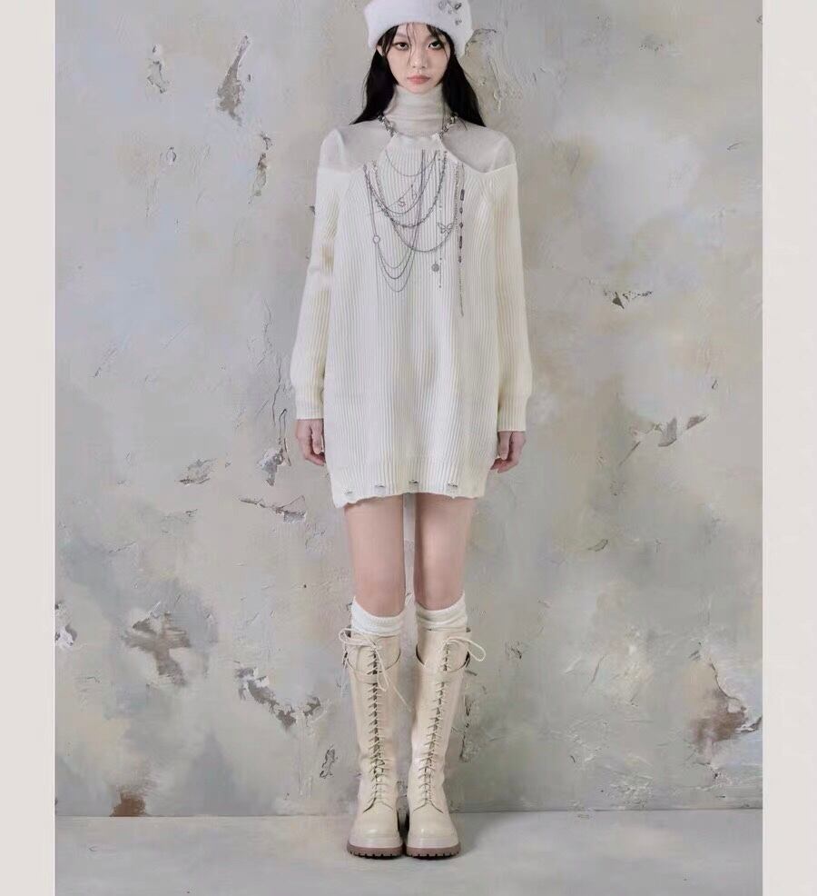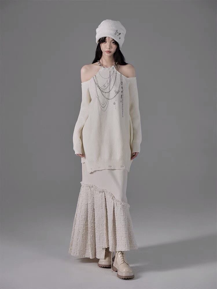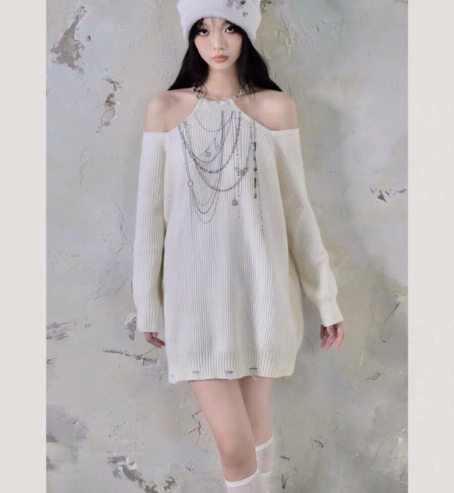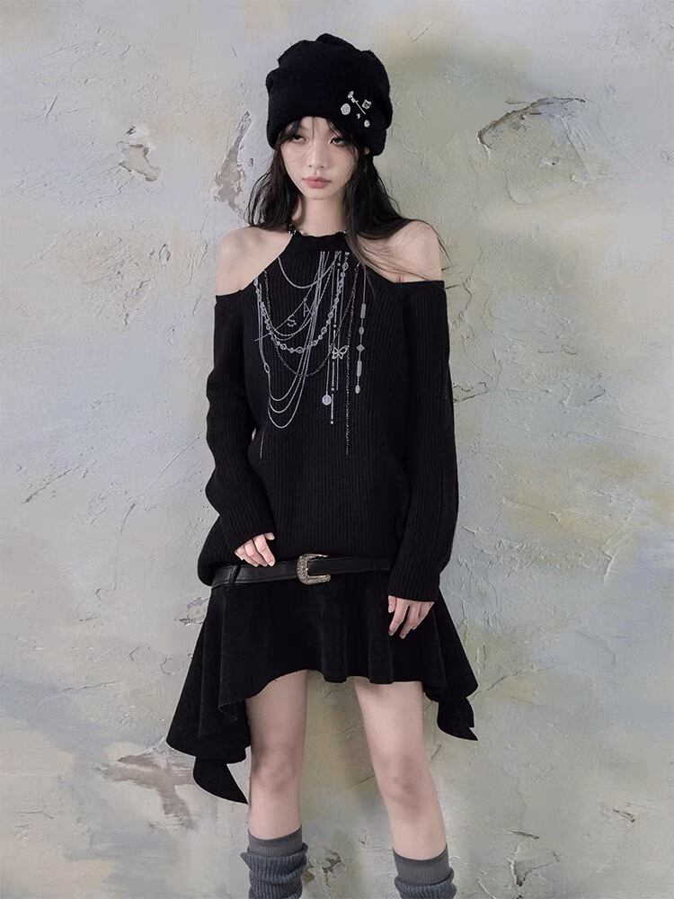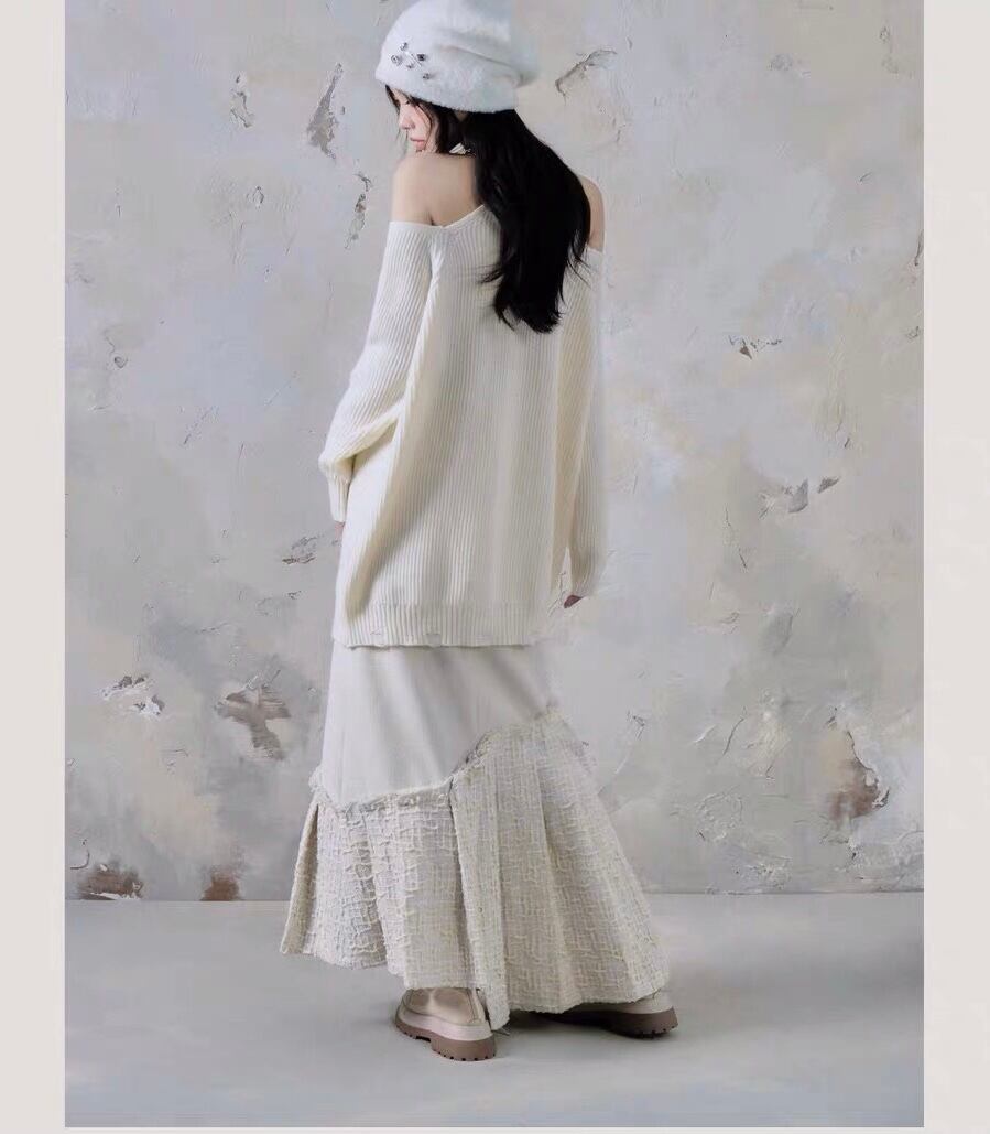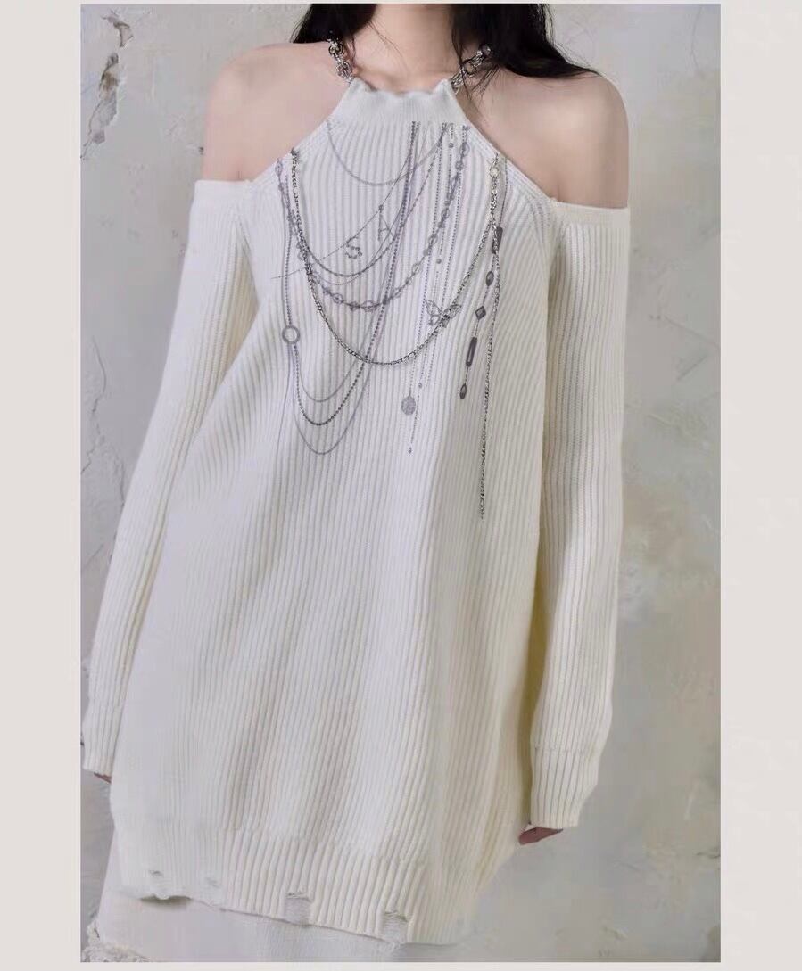 オフショルダー セーター アクセサリー 白 ニット ワンピース 黒