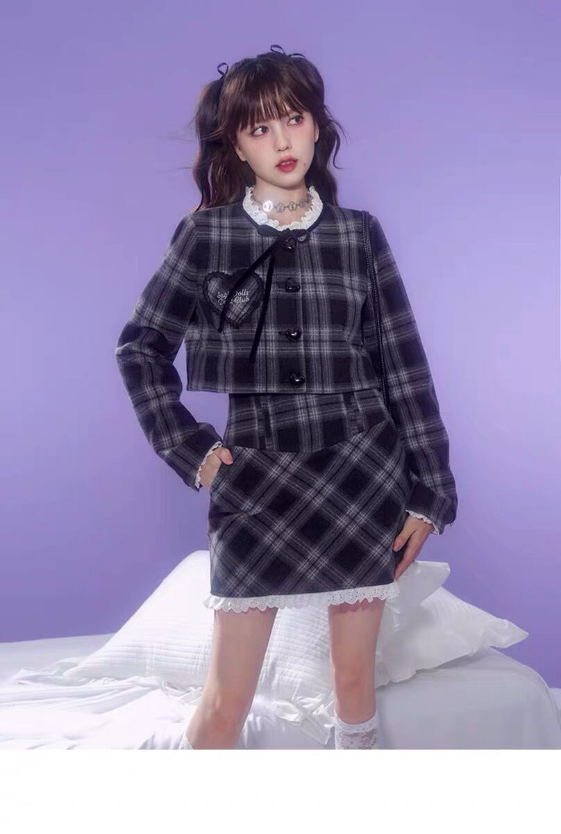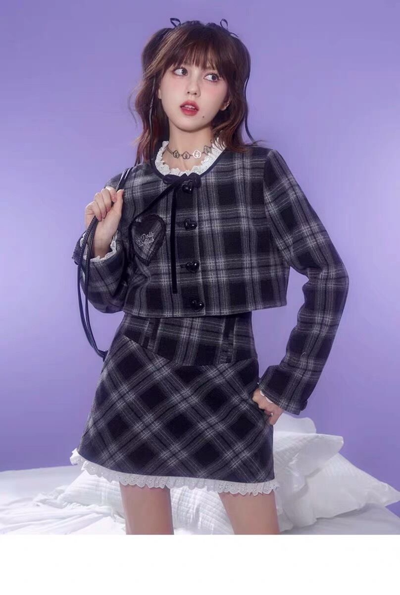 【セットアップ】チェック スーツ ガーリー ネイビー グレー ツーピース リボン