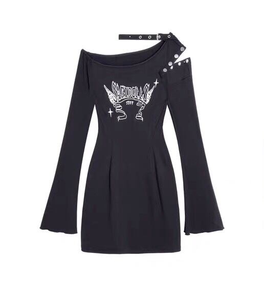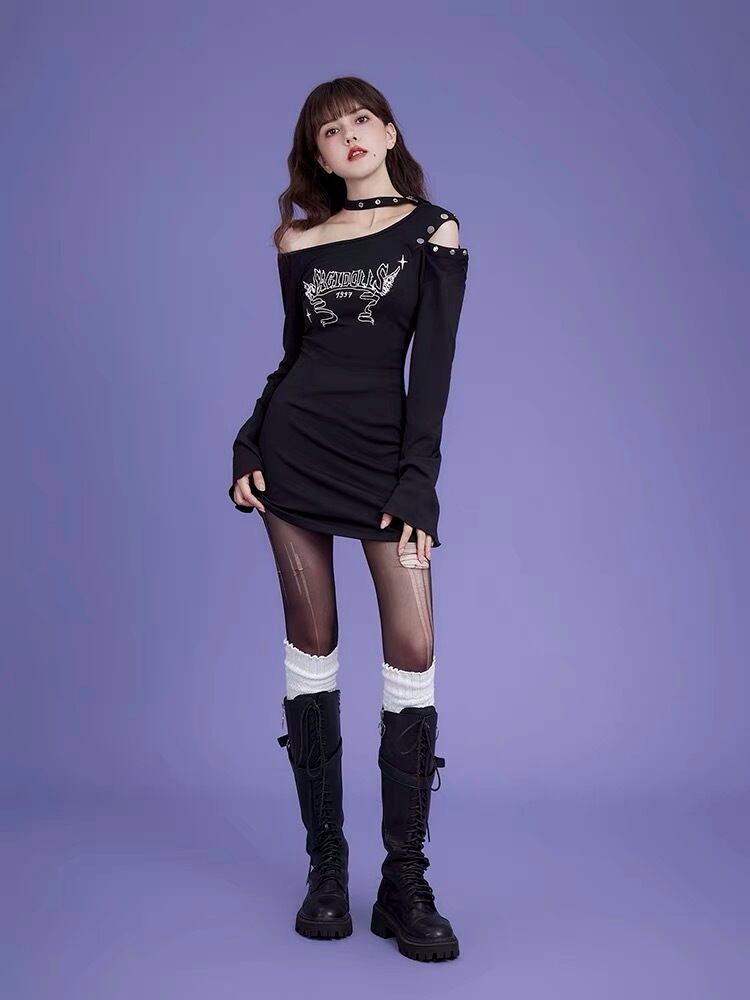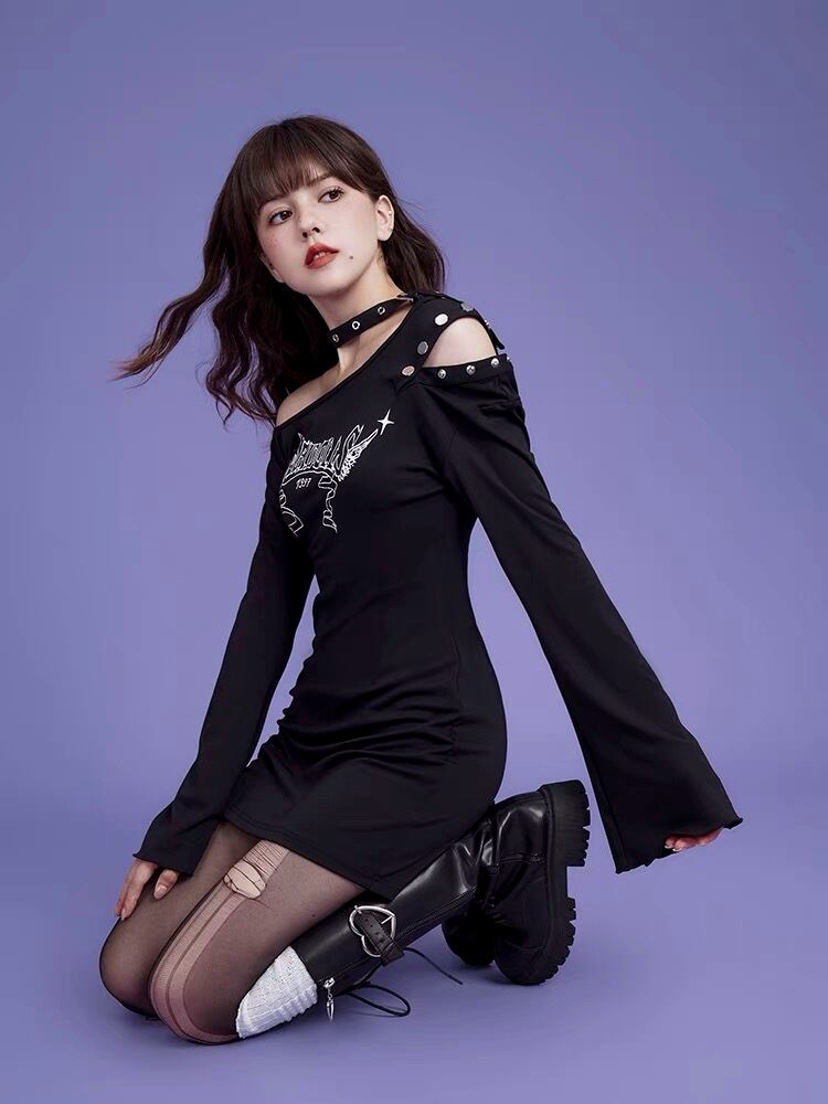 ワンピース 黒 ロック オフショルダー カジュアル Tシャツ