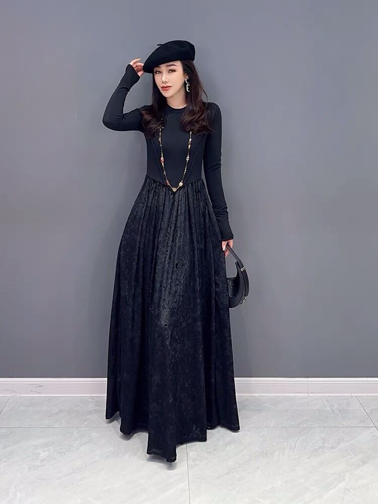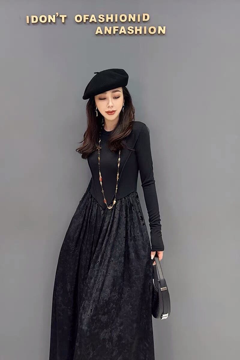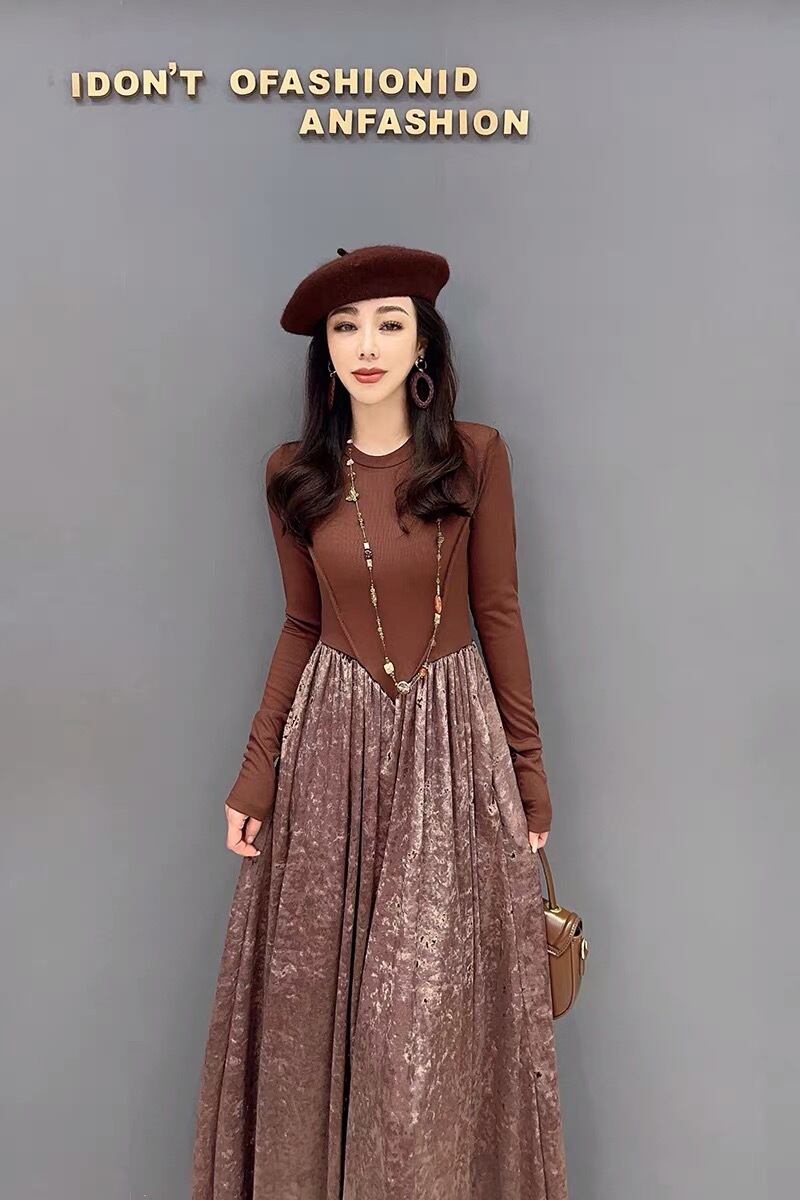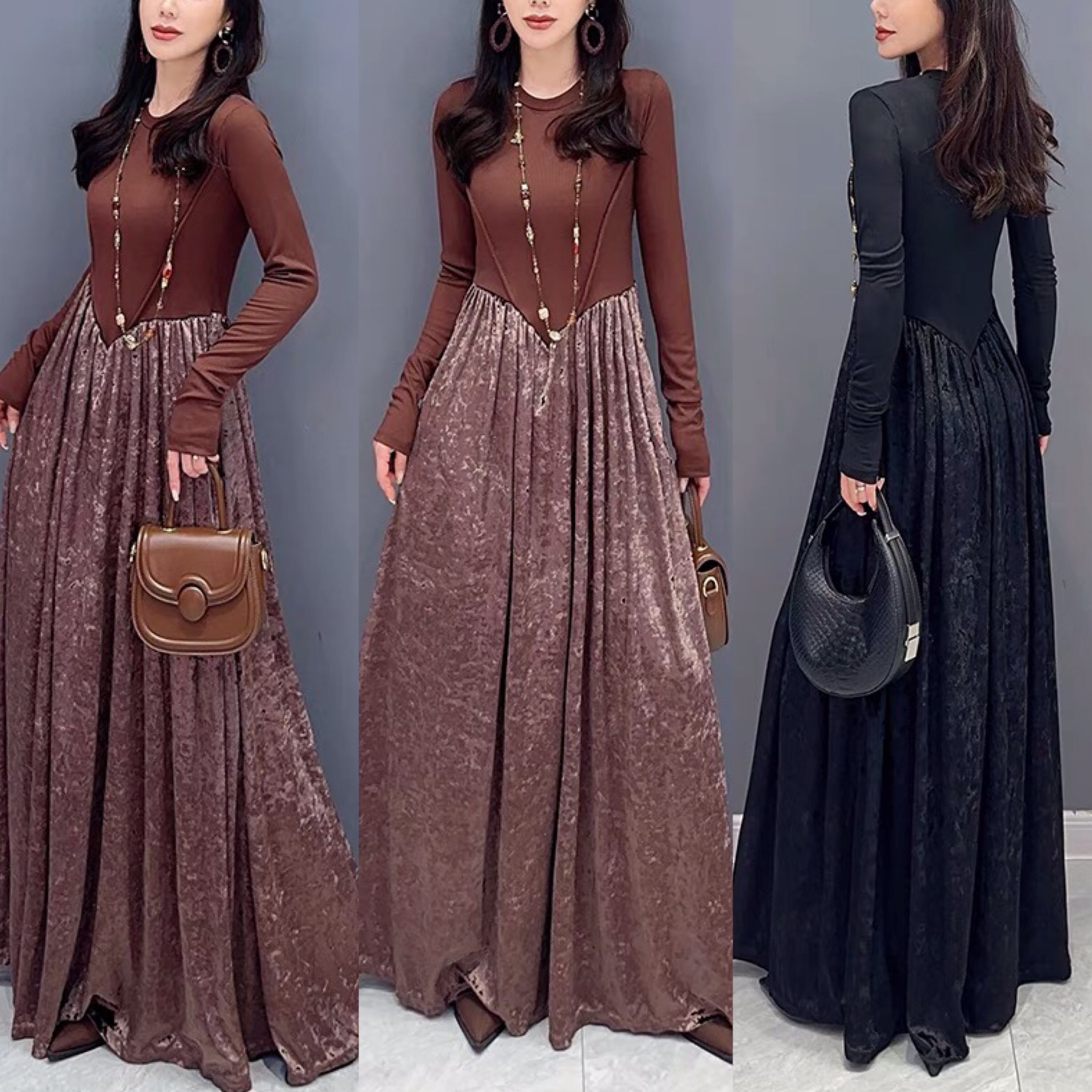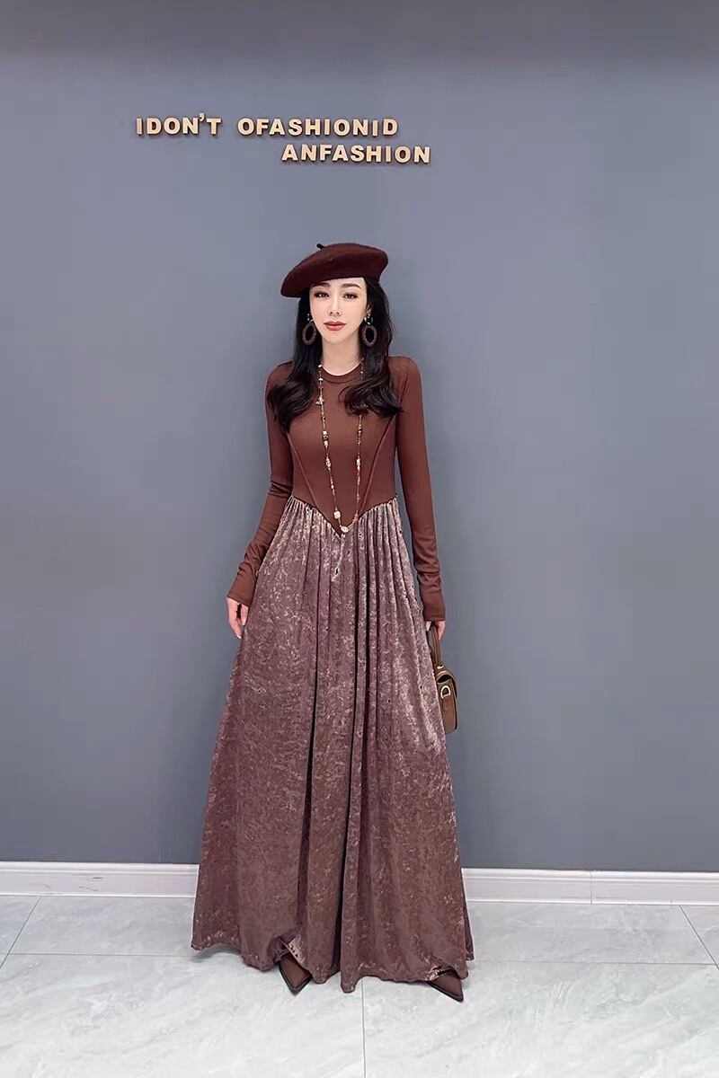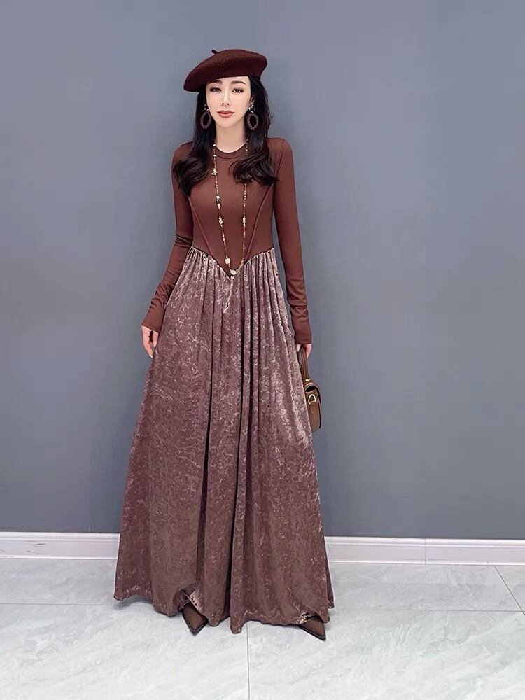 ワンピース 黒 茶色 エレガント ベロア ベルベット マキシ カジュアル