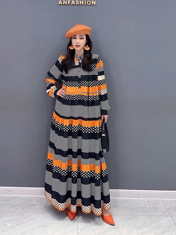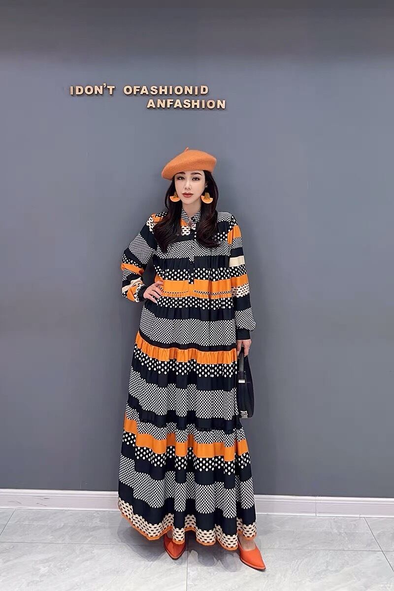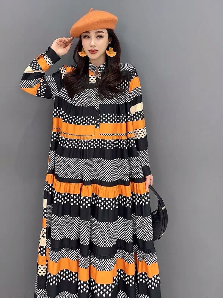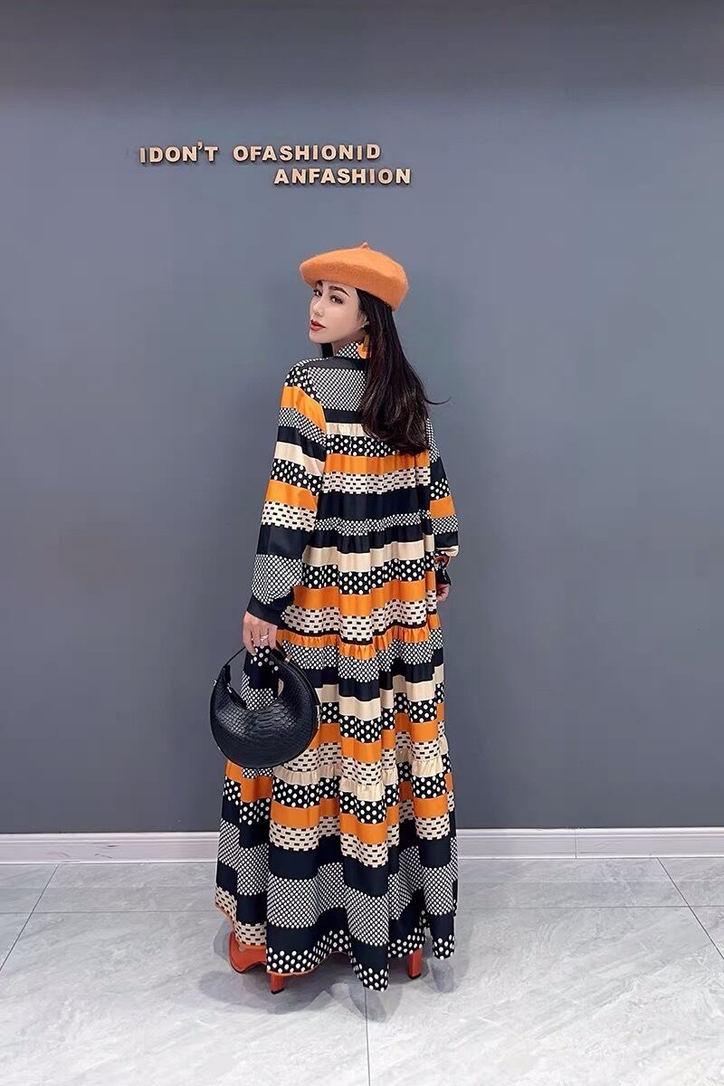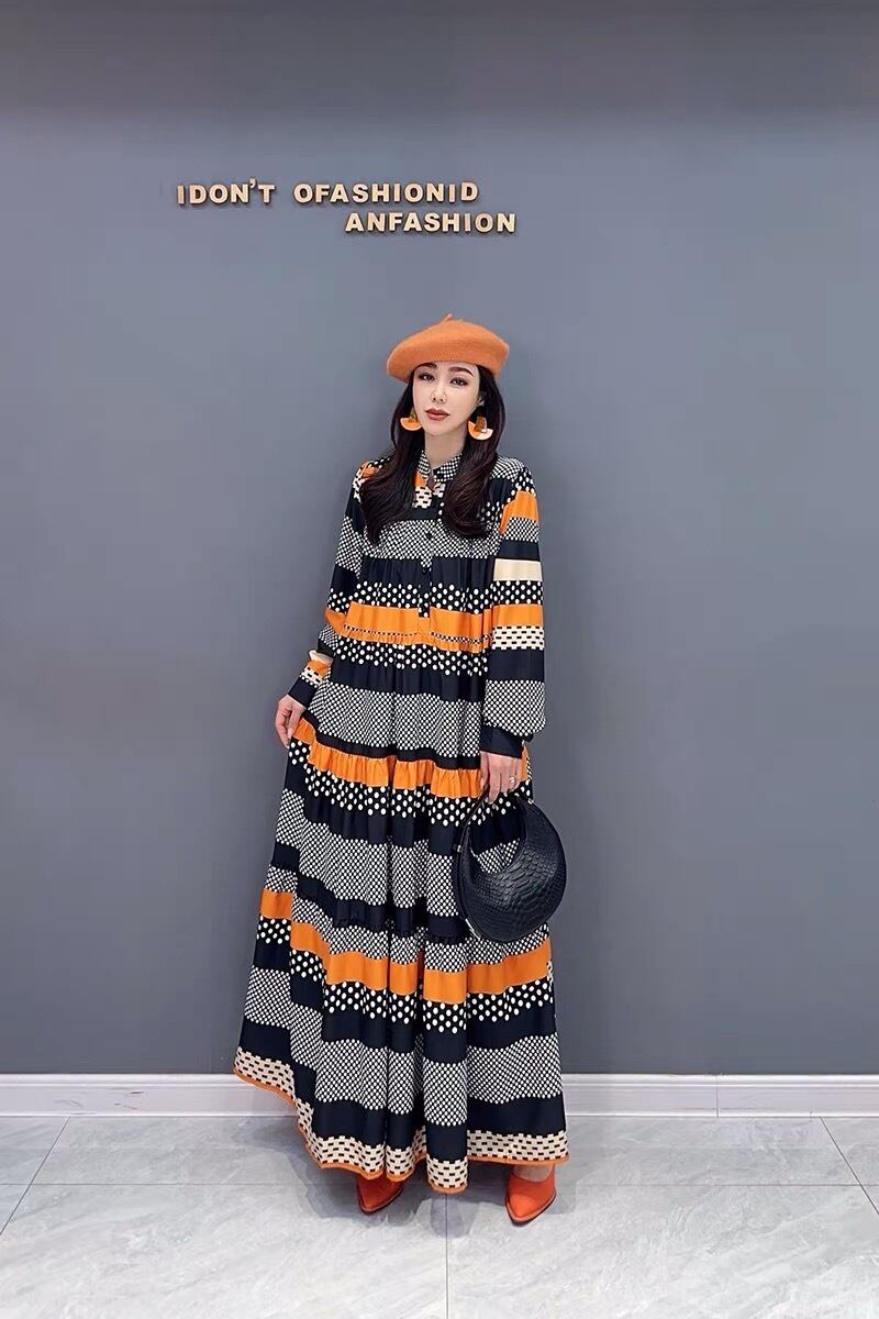 ワンピース チェック ボーダー マキシ ブラウス オレンジ 黒