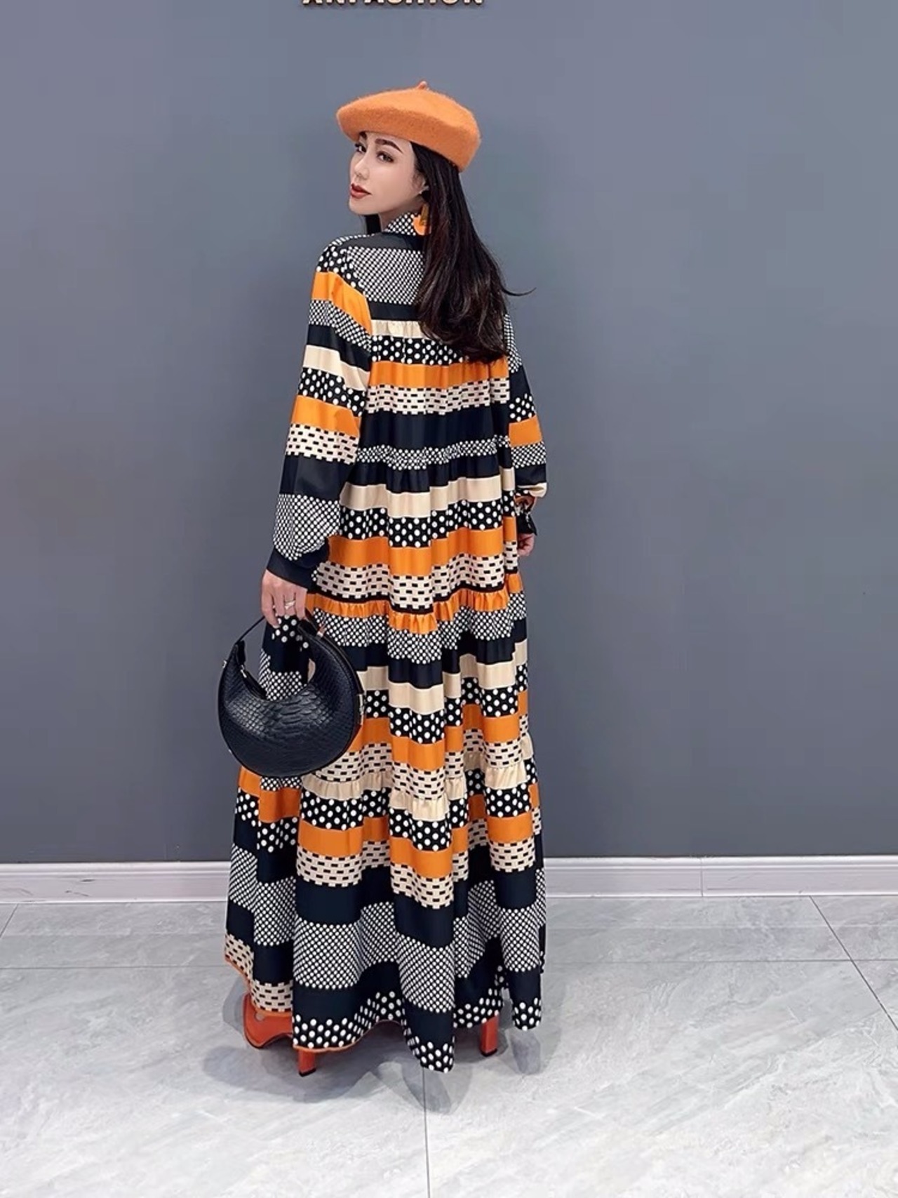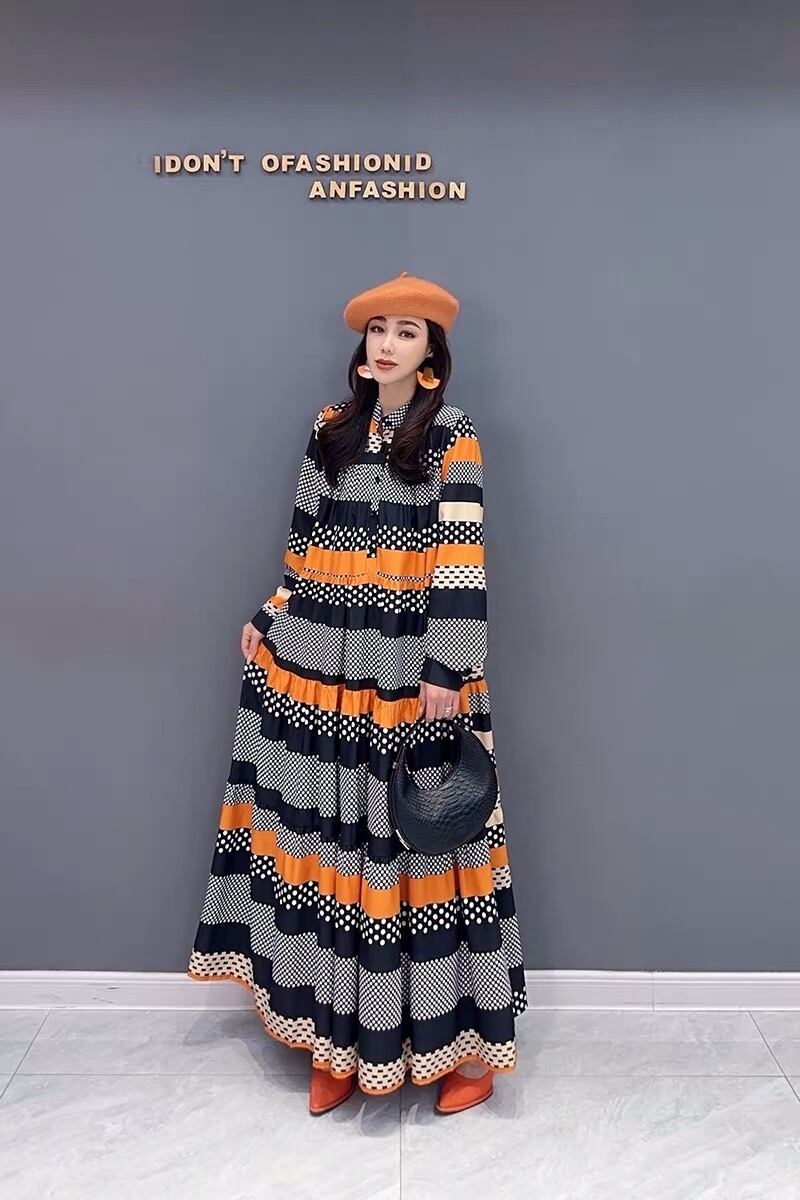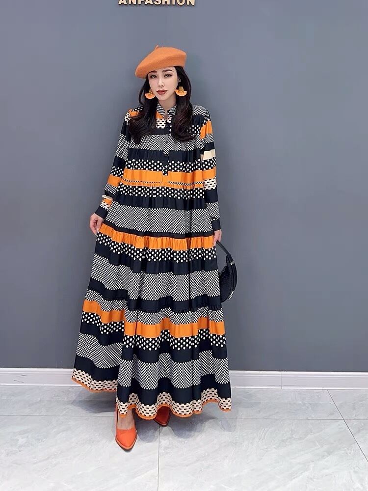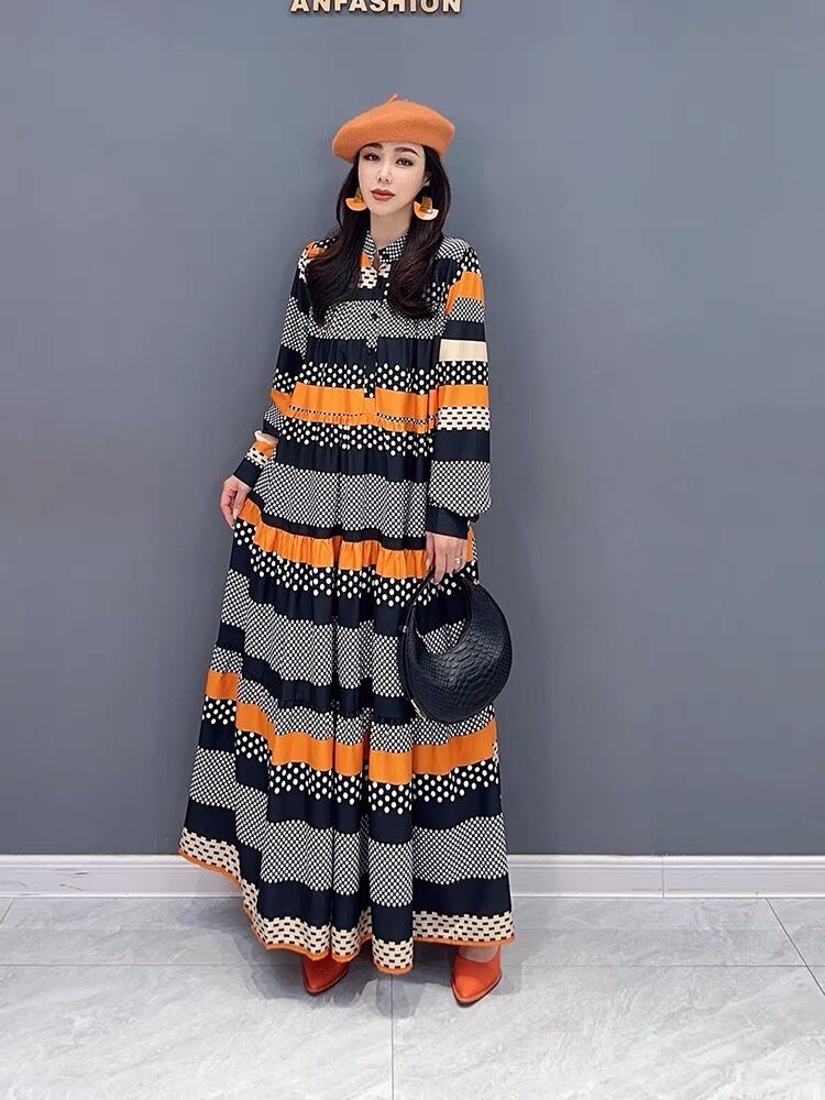 ワンピース チェック ボーダー マキシ ブラウス オレンジ 黒