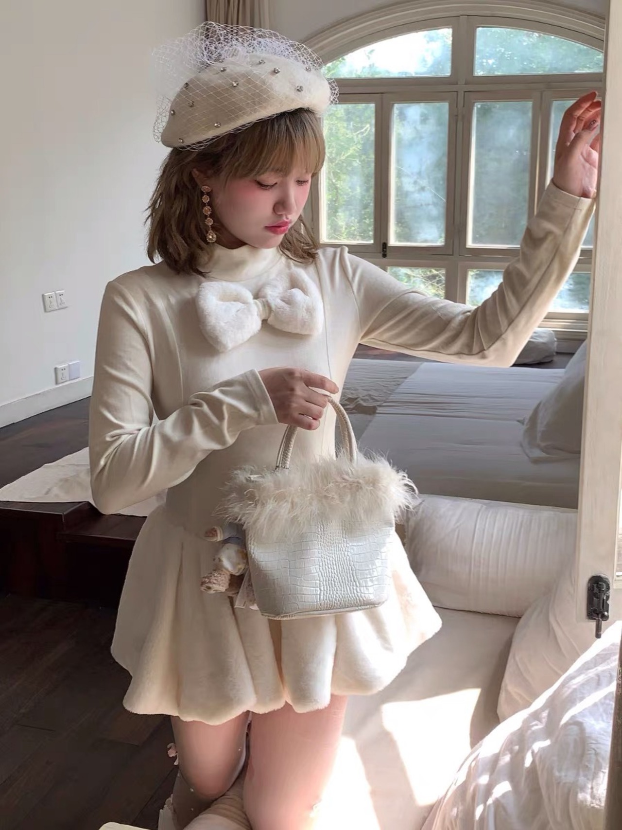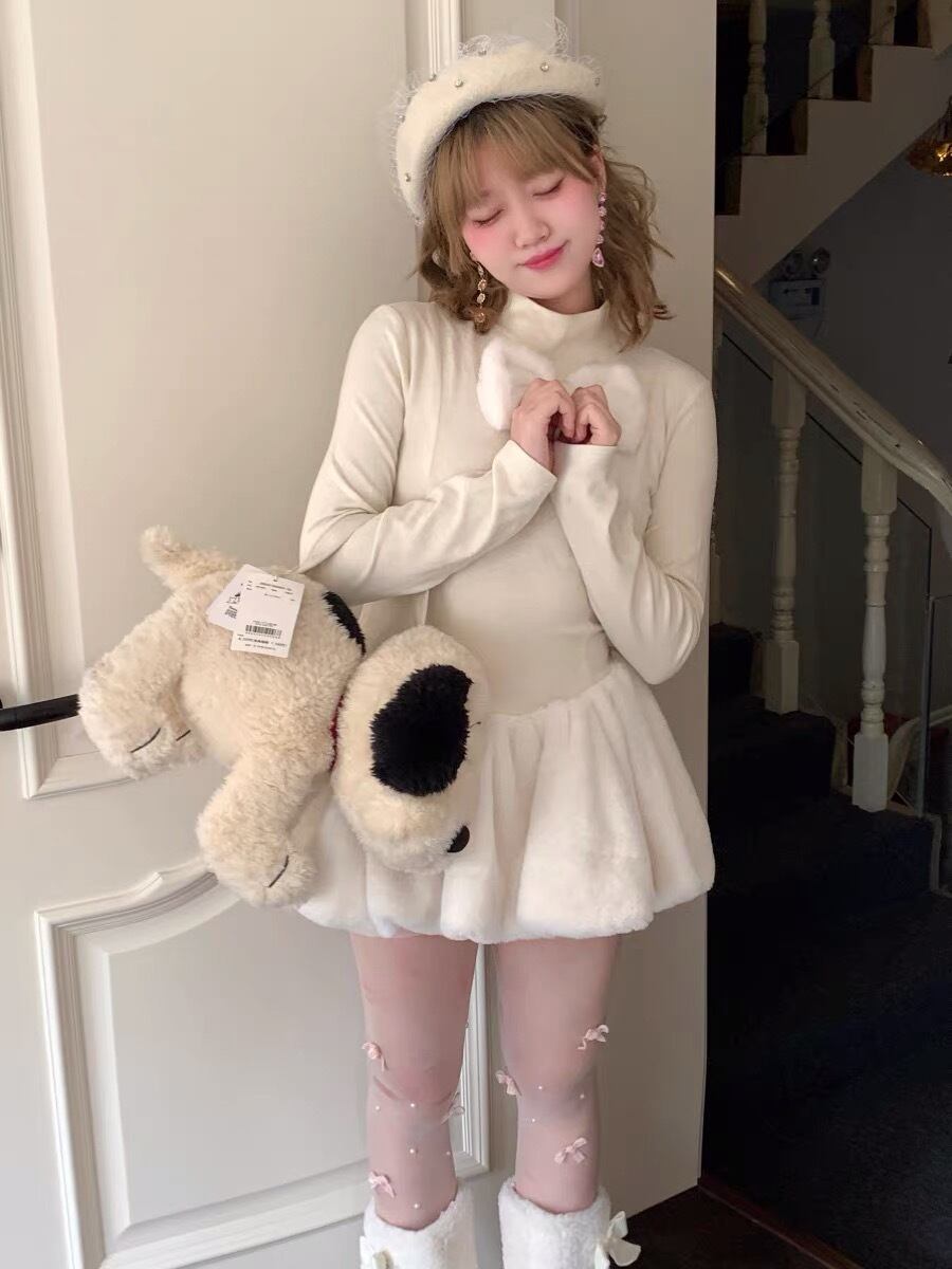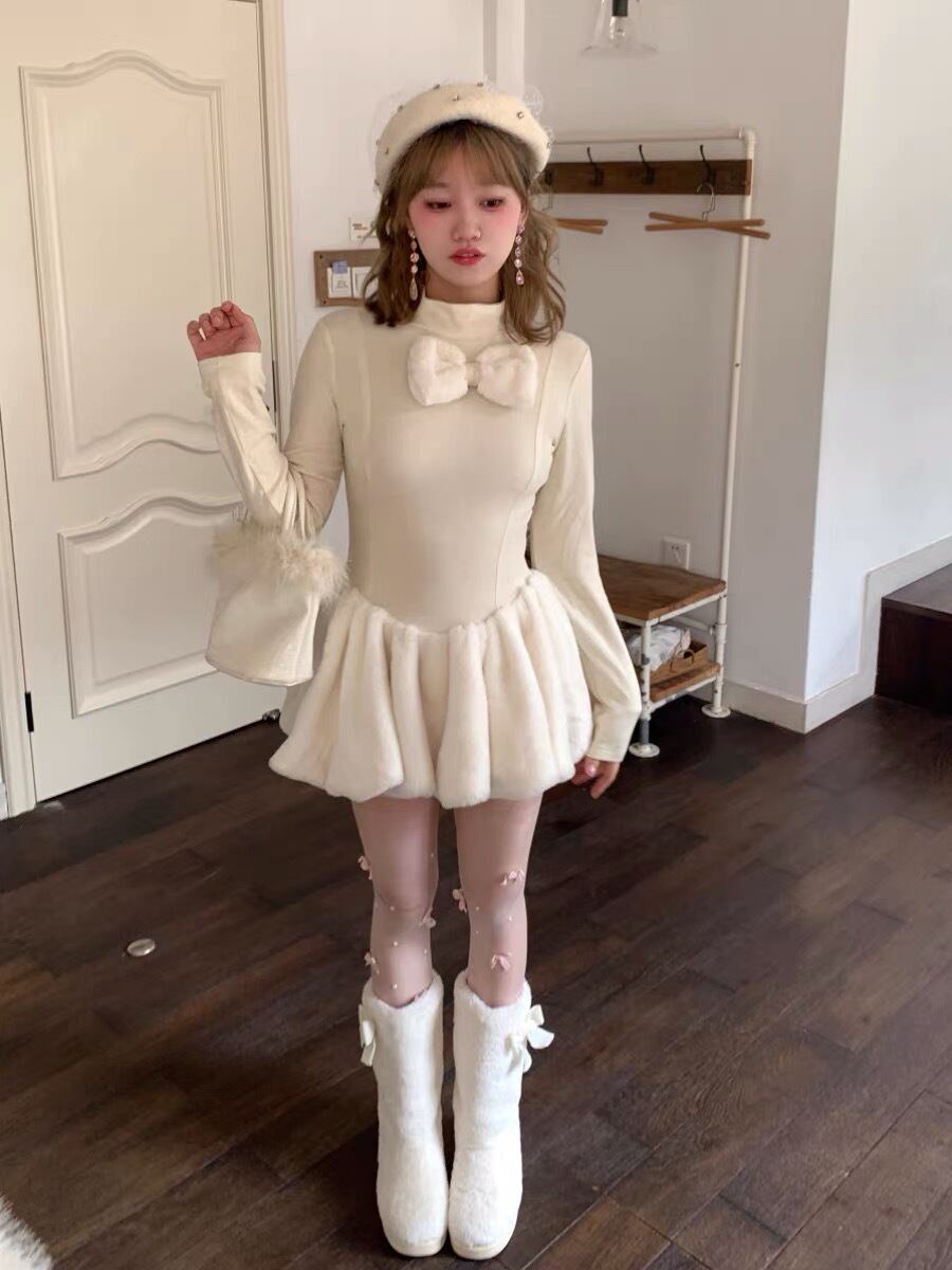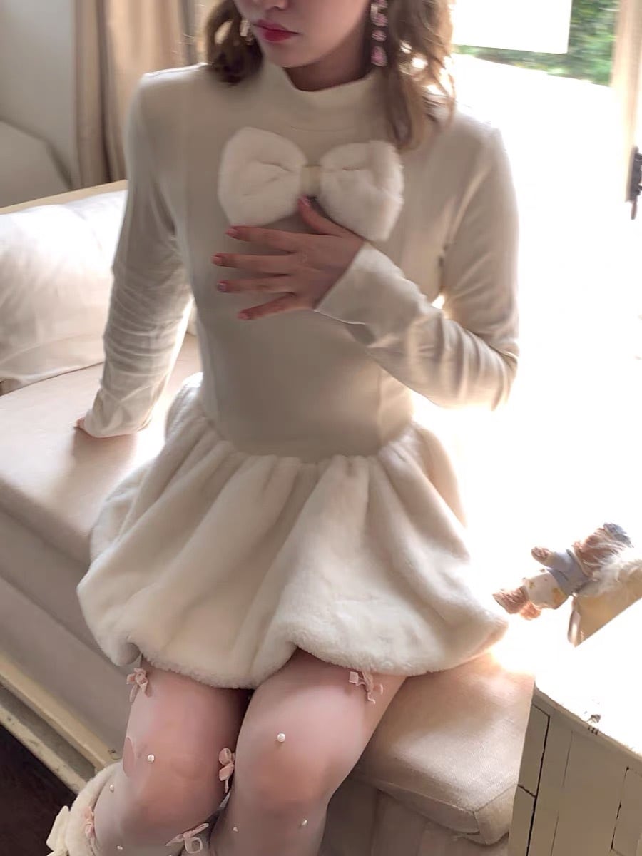 ワンピース 白 フリース ホワイト リボン ガーリー