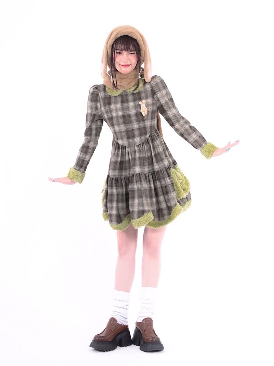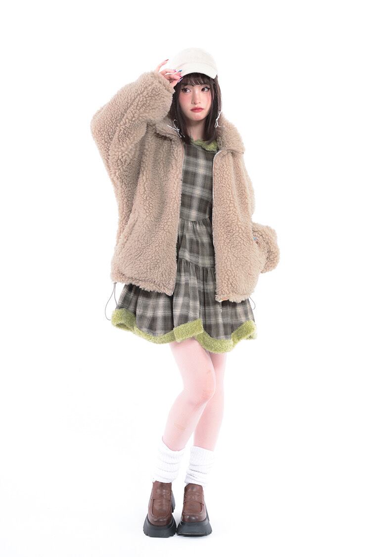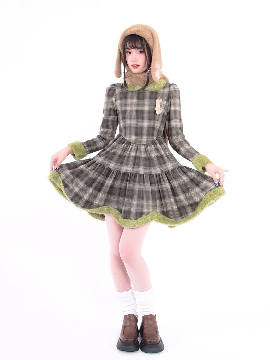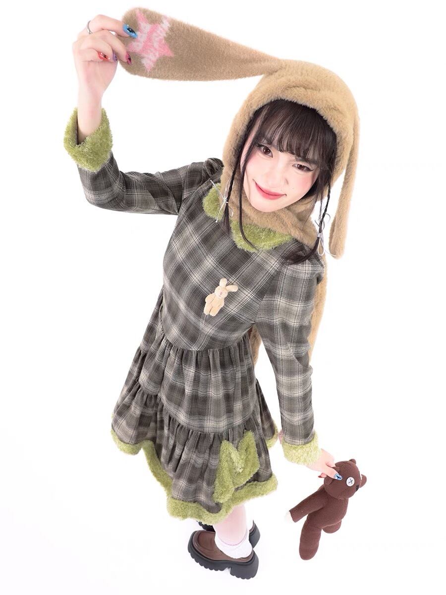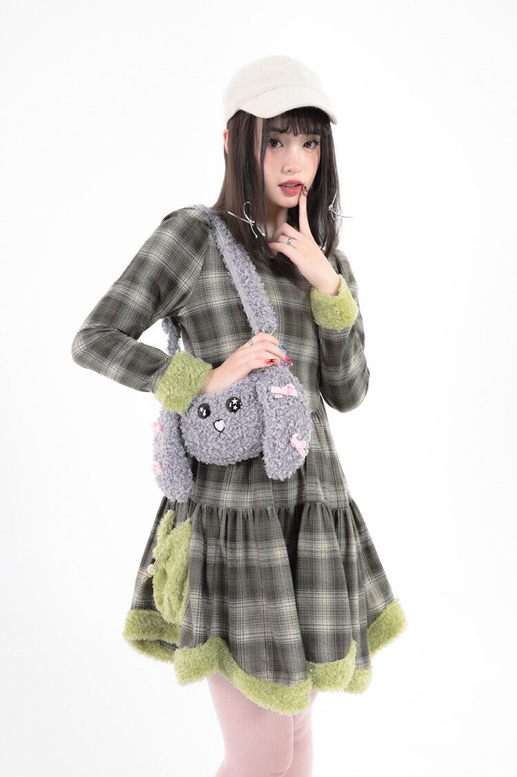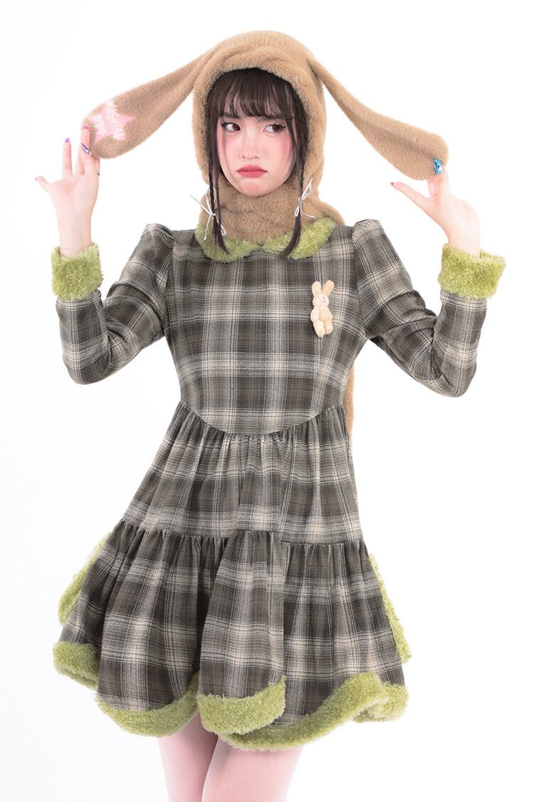 ワンピース チェック 緑 ファー ゆったり ガーリー 可愛い