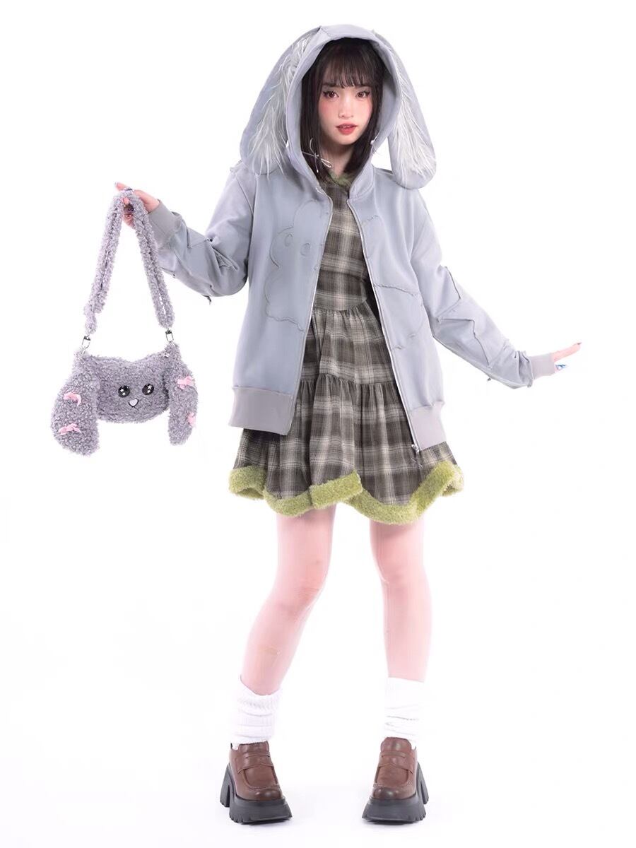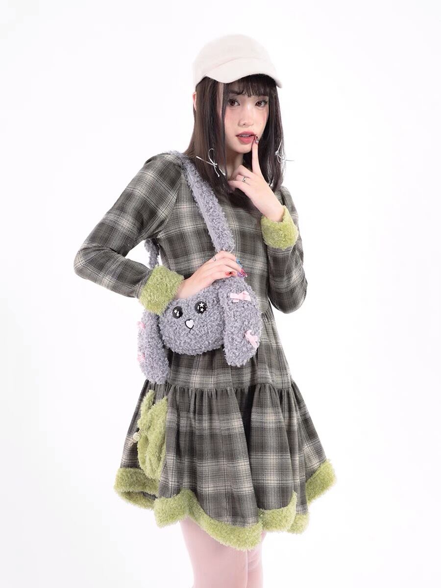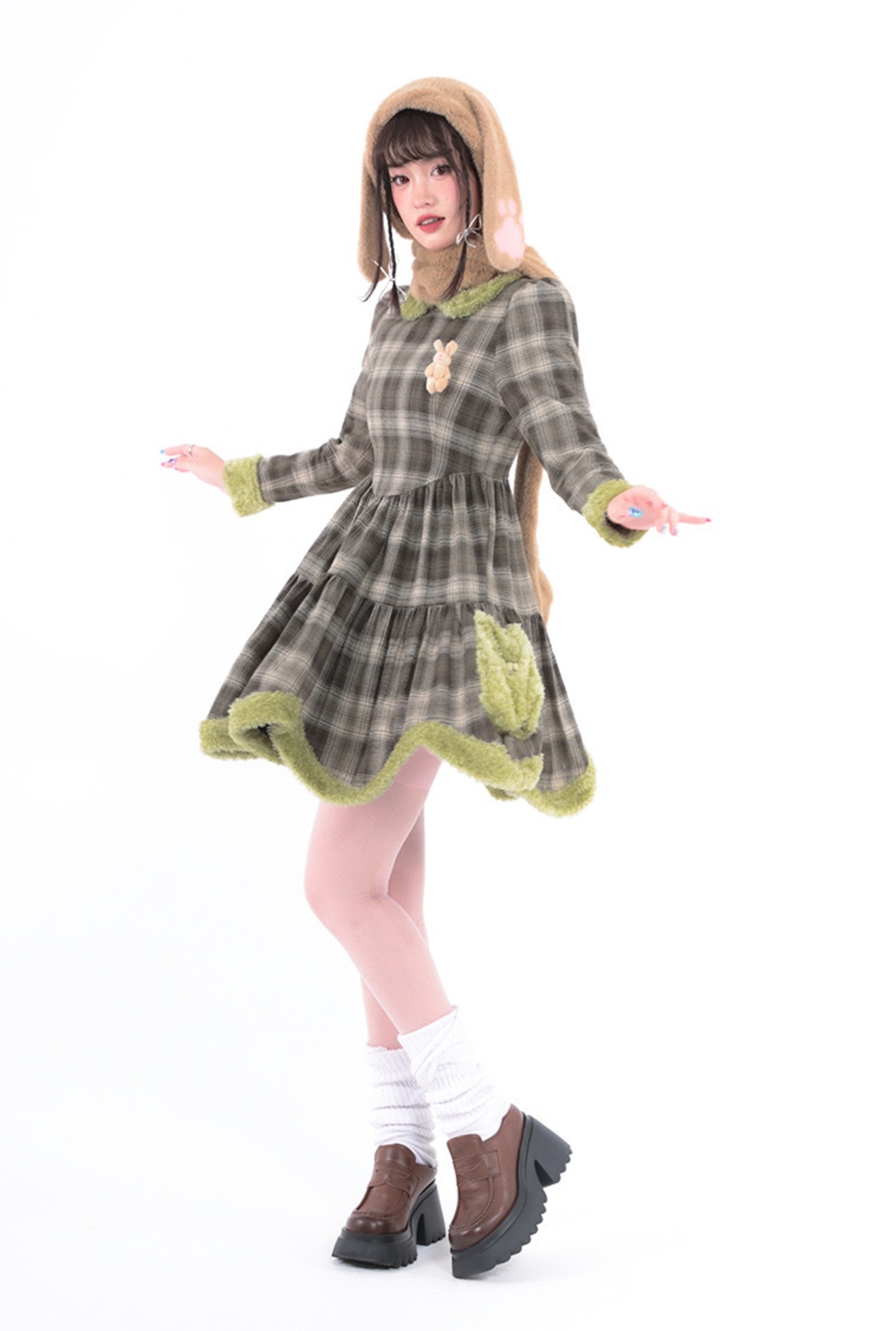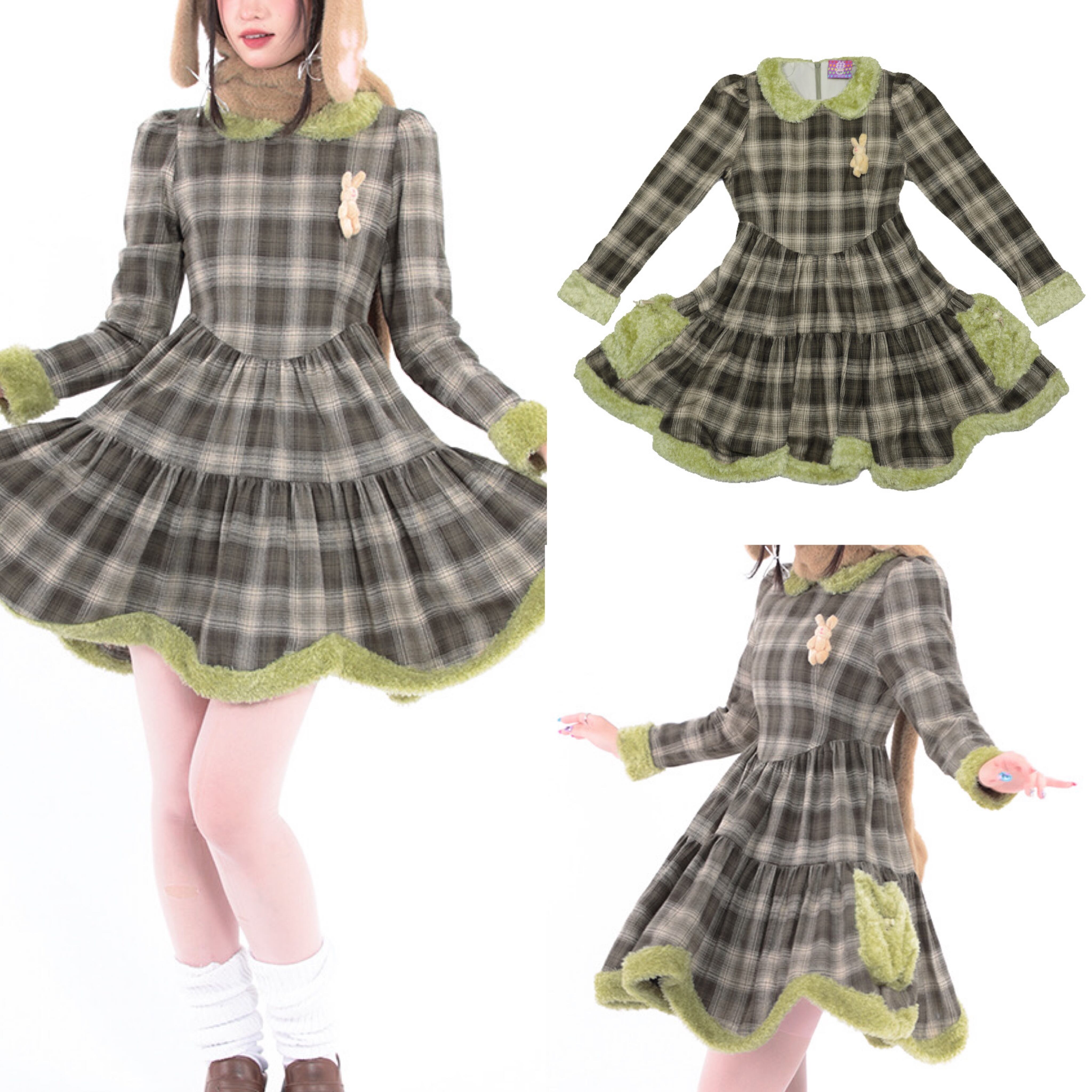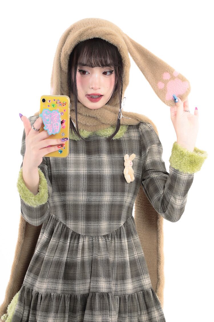 ワンピース チェック 緑 ファー ゆったり ガーリー 可愛い