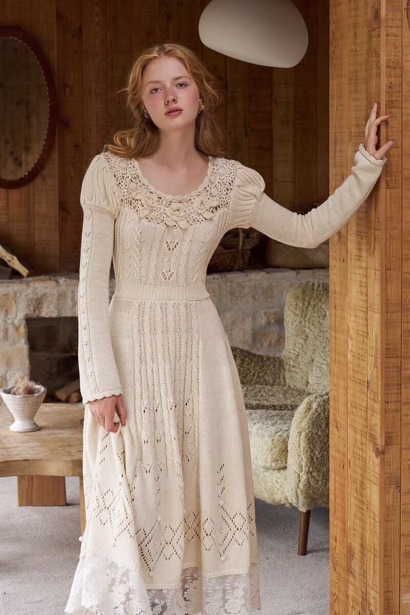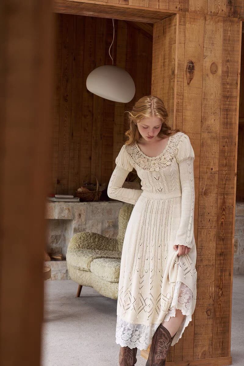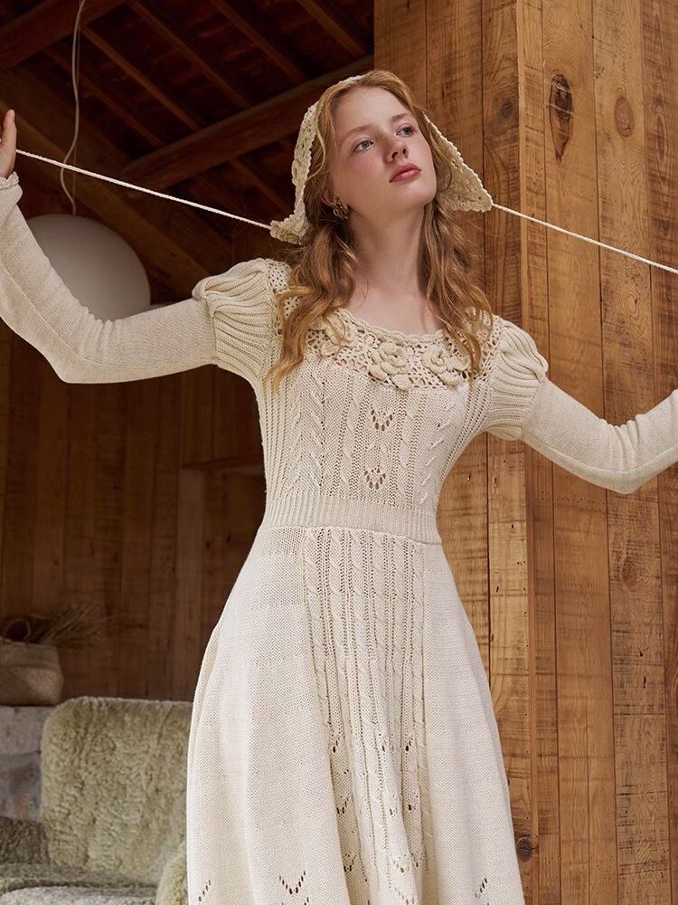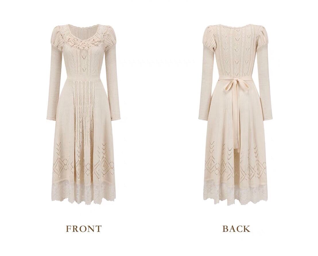 白 ホワイト ニット セーター ワンピース ガーリー 花柄